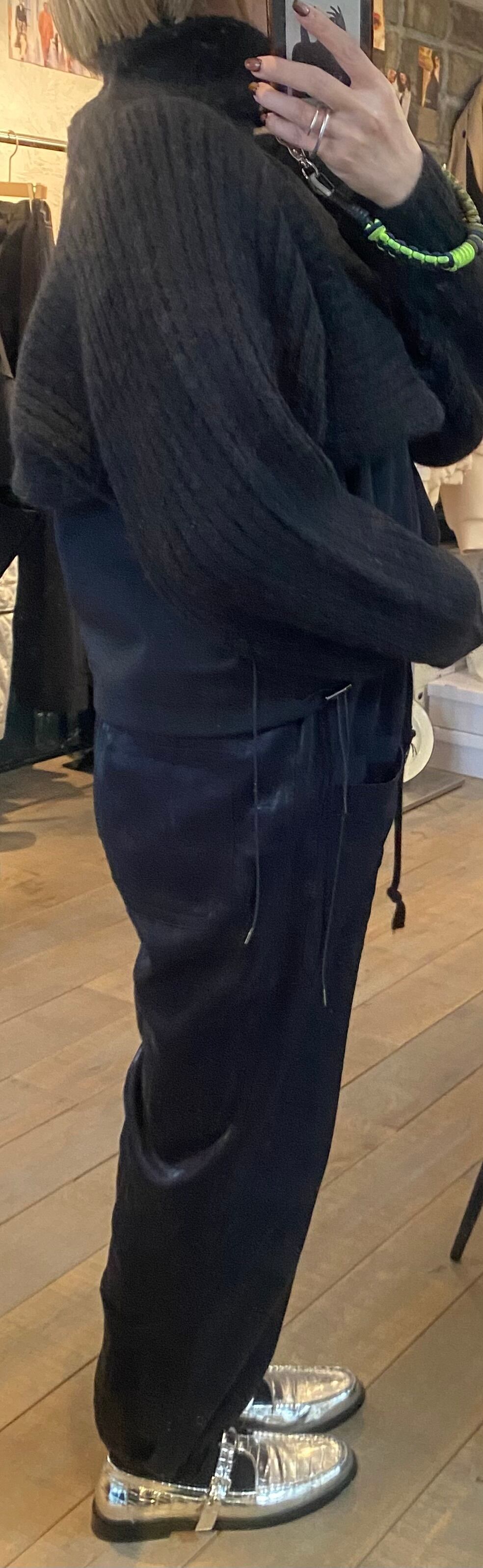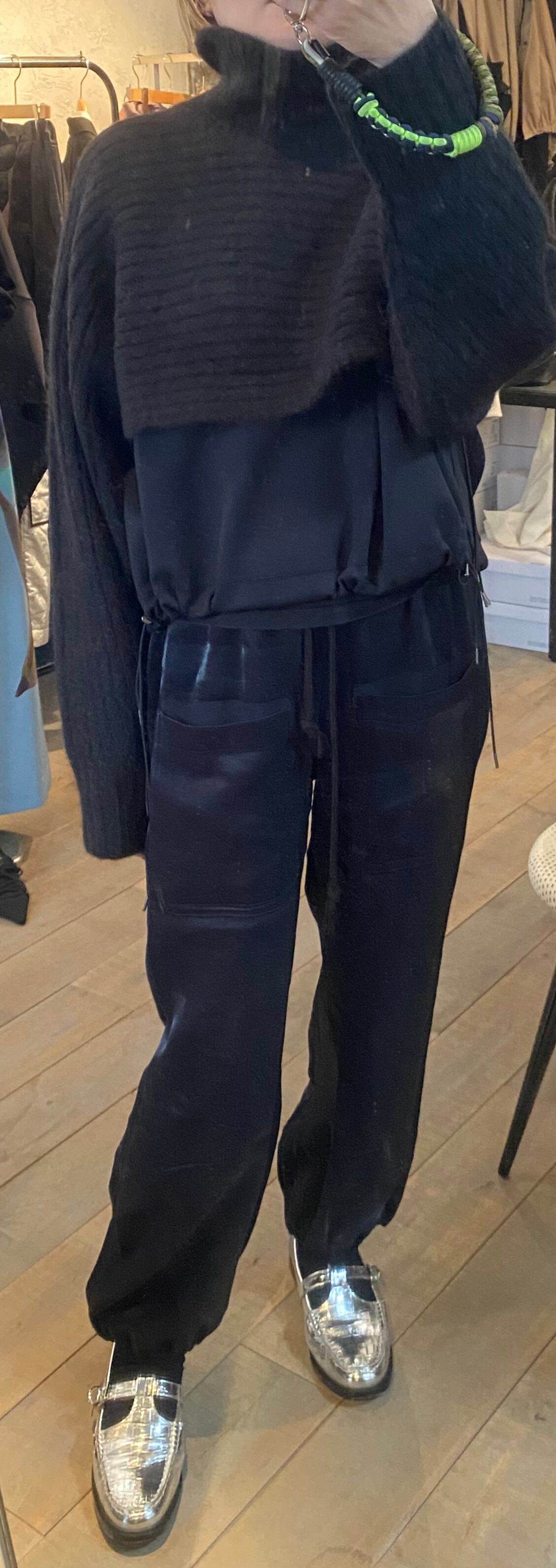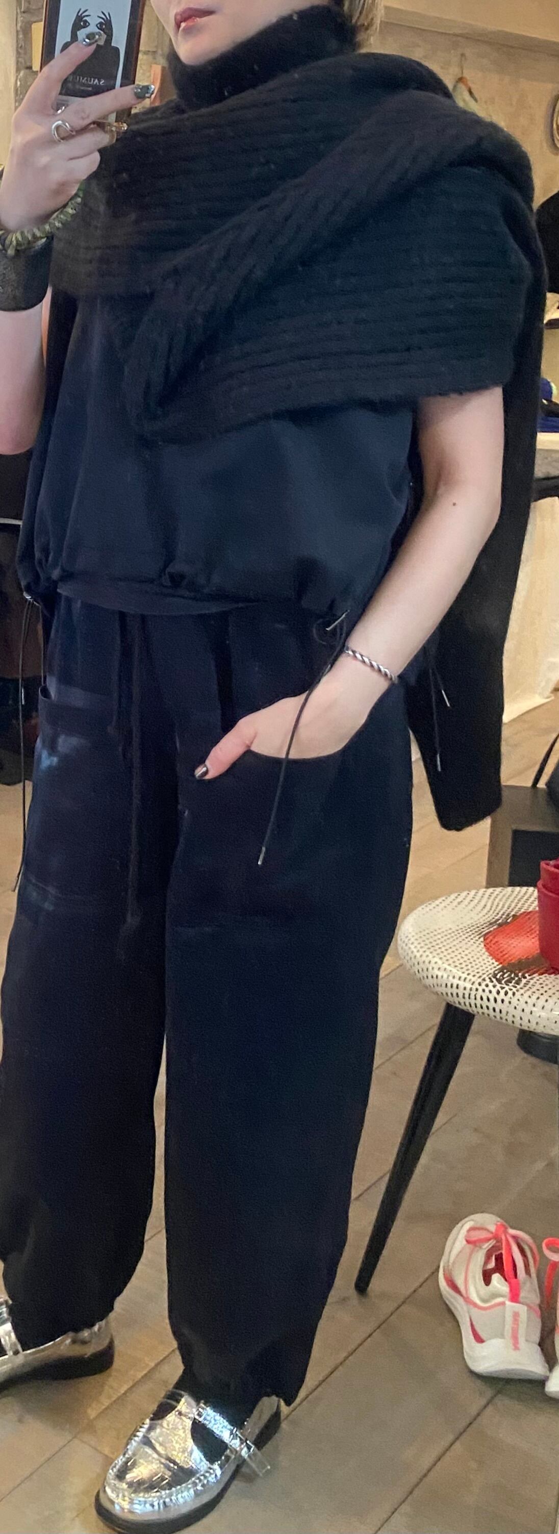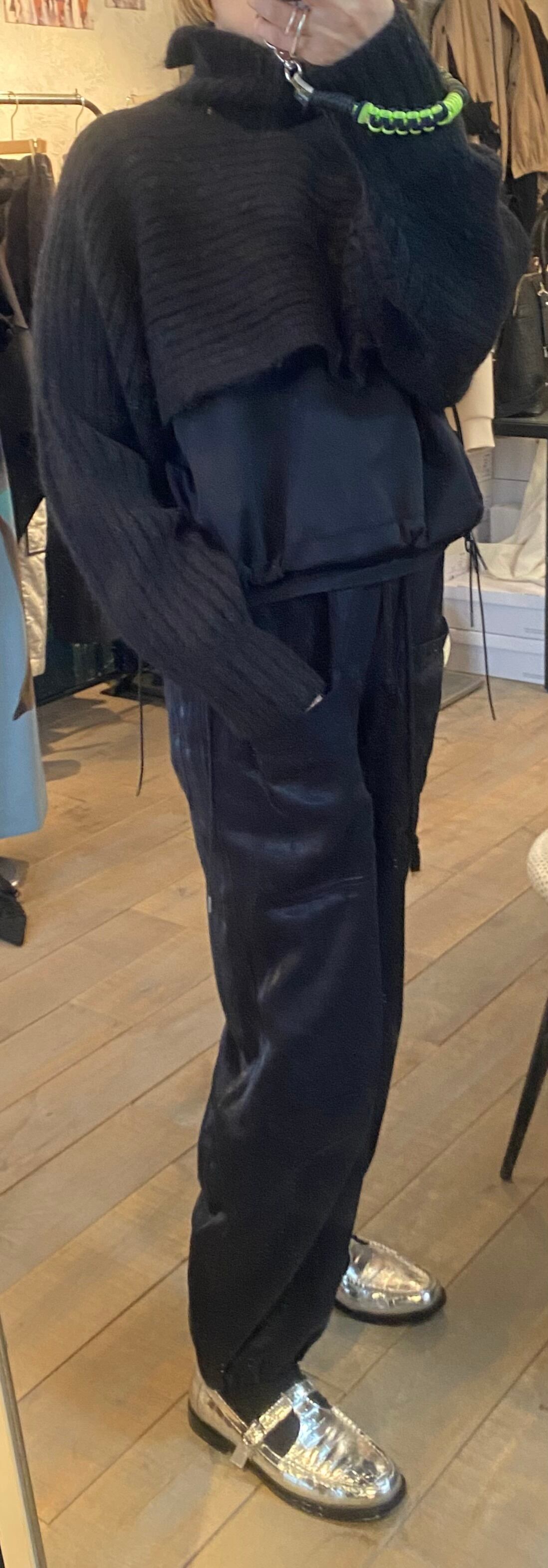 保温性に優れ、毛玉やシワになりにくいのが特徴のアルパカを使用し、獣毛特有の肌あたりを改良するためアクリルとナイロンを混紡する事で柔らかく、ふっくらとした感触に仕上げました。ボリュームのある袖とクロップド丈のバランスにこだわったタートルネックニットです。レイヤードスタイルが楽しめるアイテムになっています。
