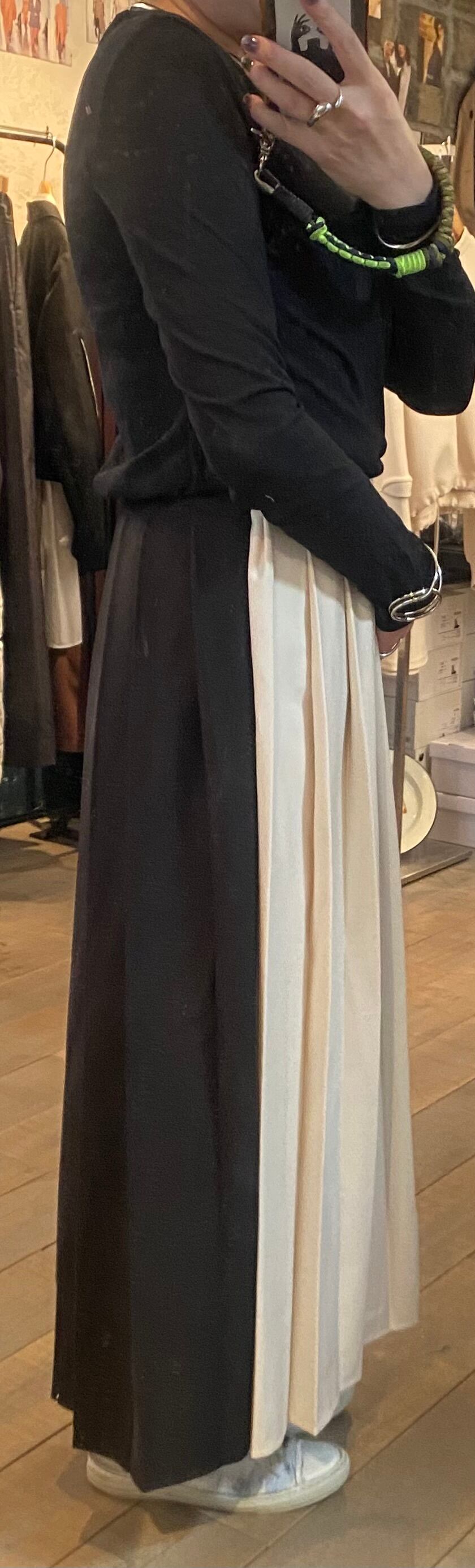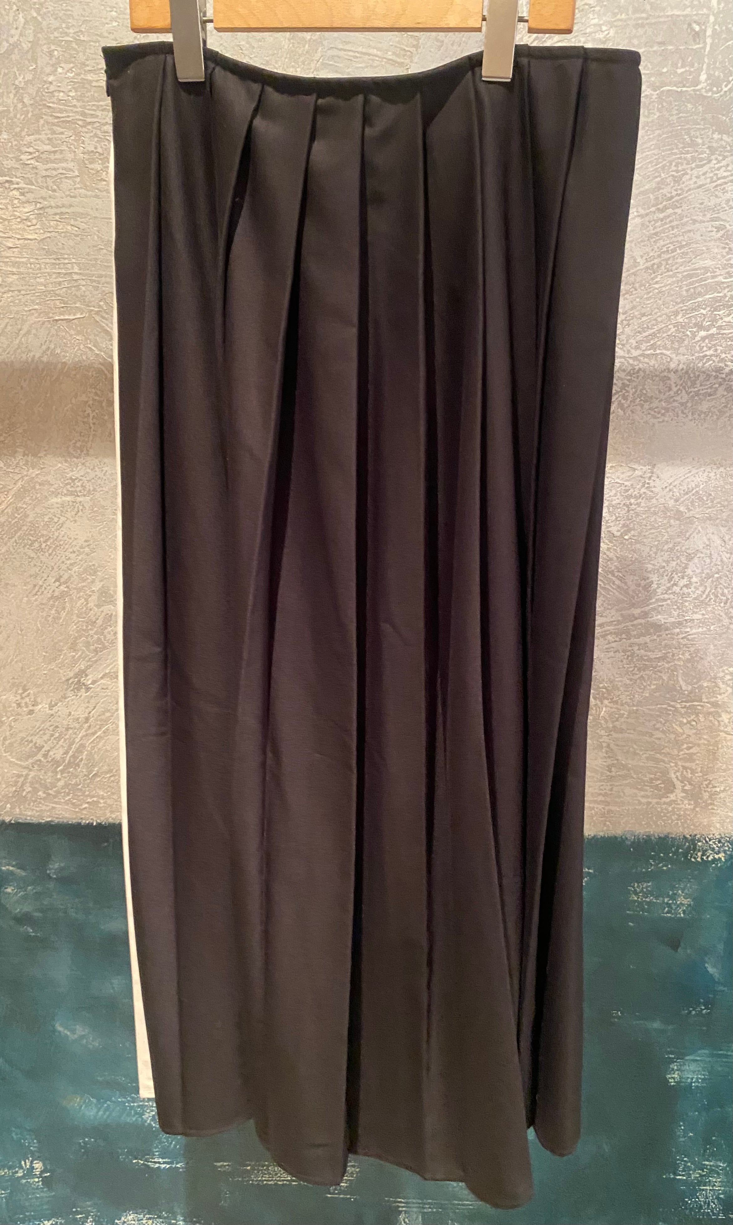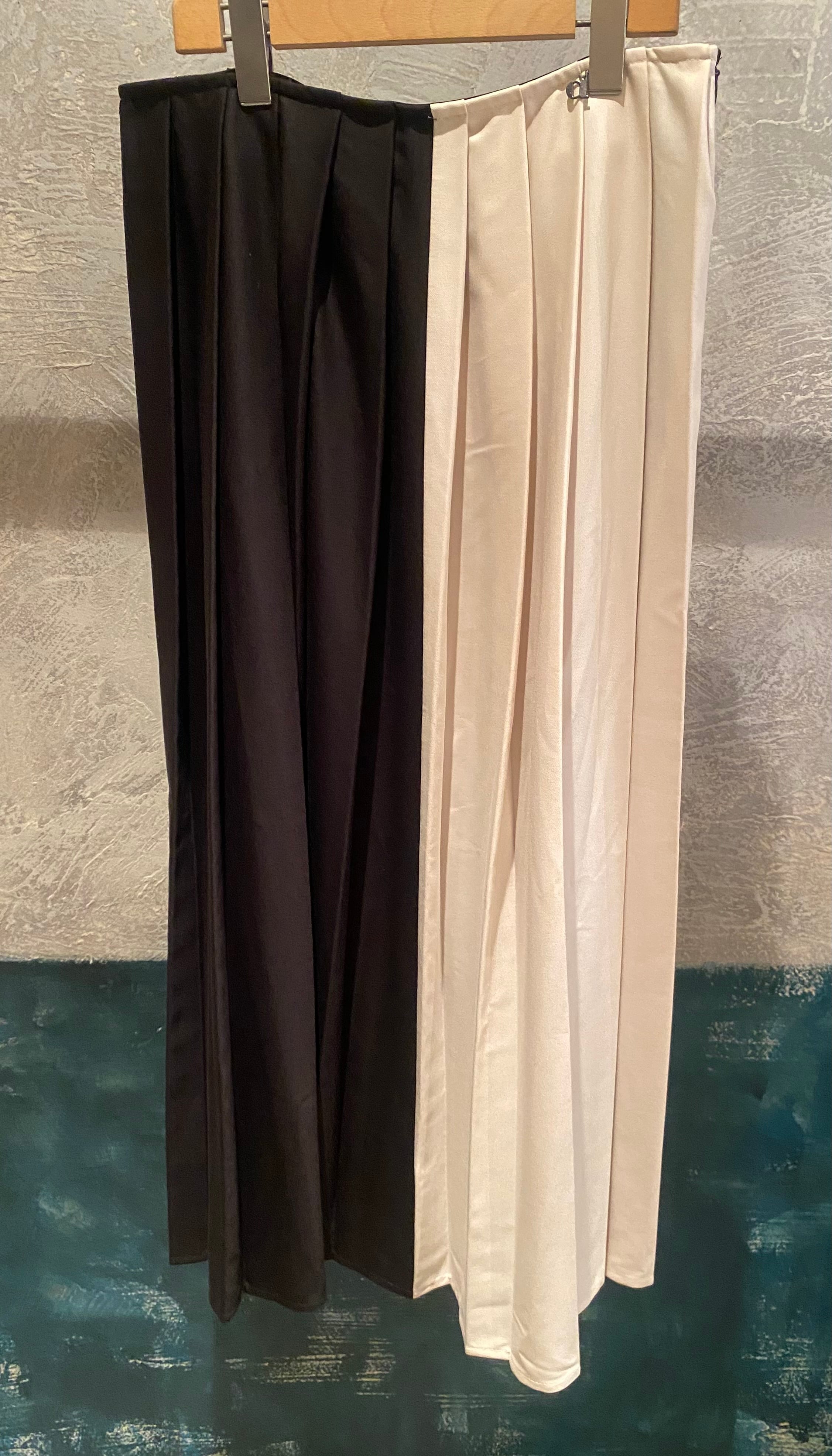 バイカラーの配色が目を引くプリーツスカート。オチ感もあり。プリーツスカート特有の腰周りの着膨れもなくスッキリはいて頂けます。トップスも選ばすスタイリングできる着回し力抜群のスタイリングの主役になるスカートです。シーズンレスで着用できます。