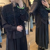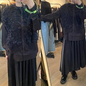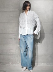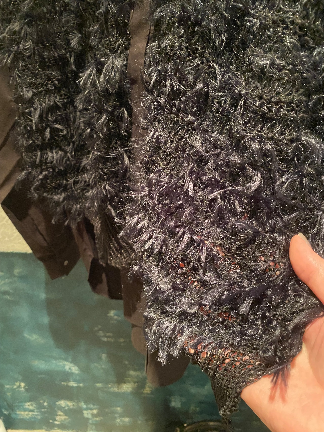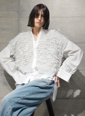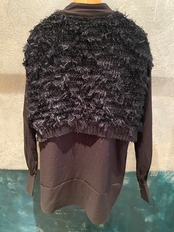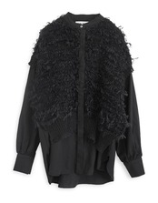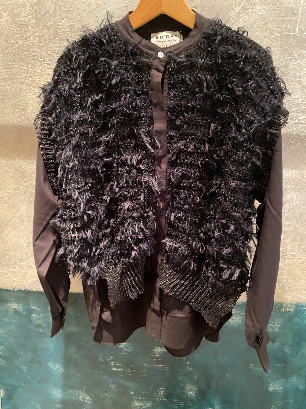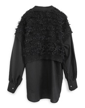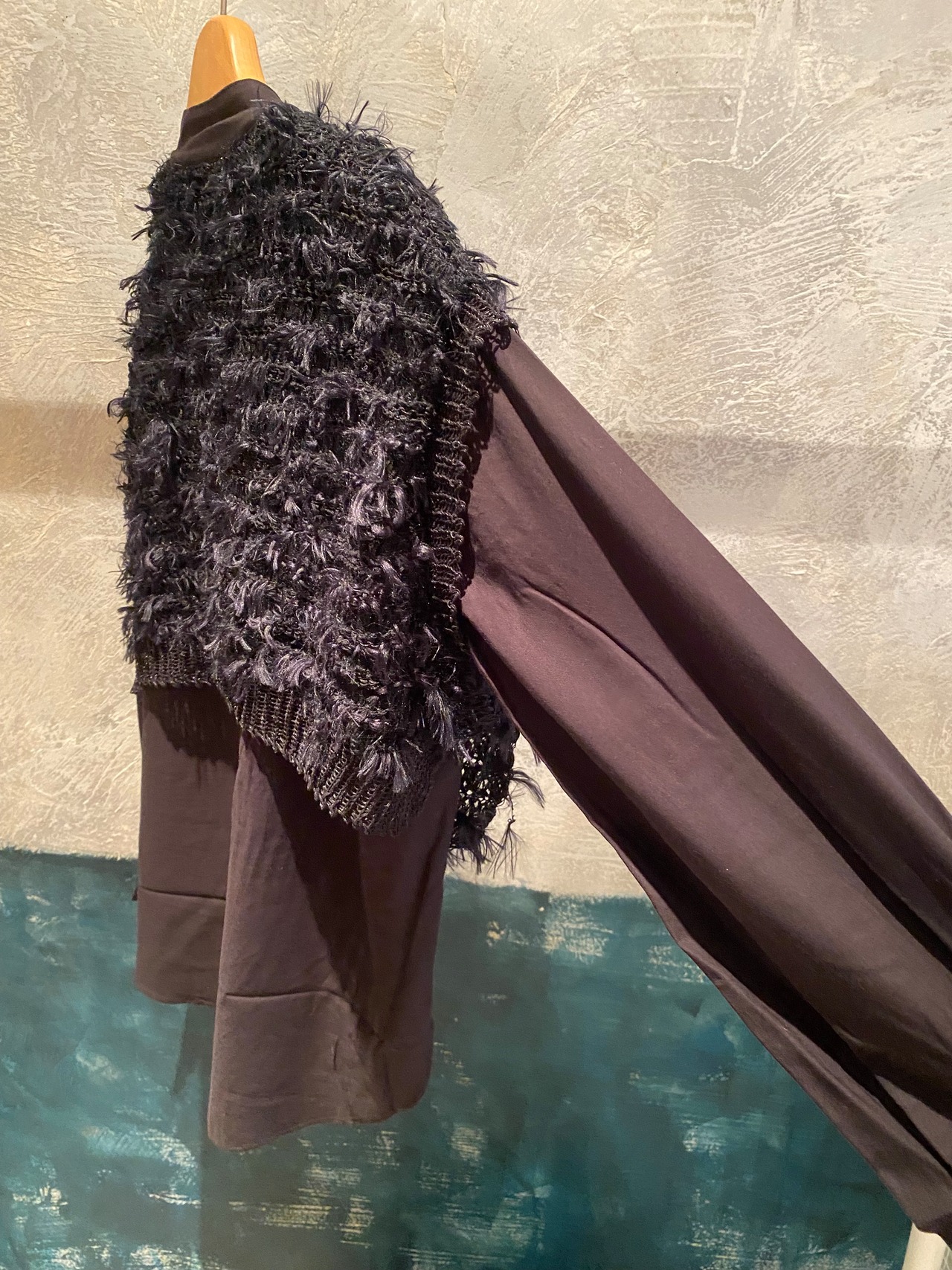 シャツにベストを重ねたような、1枚仕立てのレイヤードデザインブラウス。重なるニット部分は濡れ羽色のような艶めきを放つシャギーヤーンを使用。立体感のある編み地が、冬の装いに華やかさをプラスさせます。シャツ部分はソフトで膨らみのあるコットンビエラ素材。長袖デザインで、カジュアルコーデでもオケージョンにも対応する便利アイテム。国内でも数少ない編み機を使用して作られた、職人の手仕事が光る貴重なニット素材。