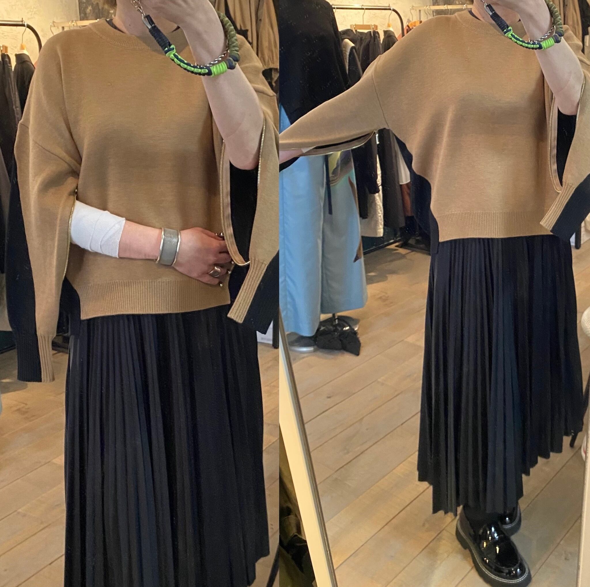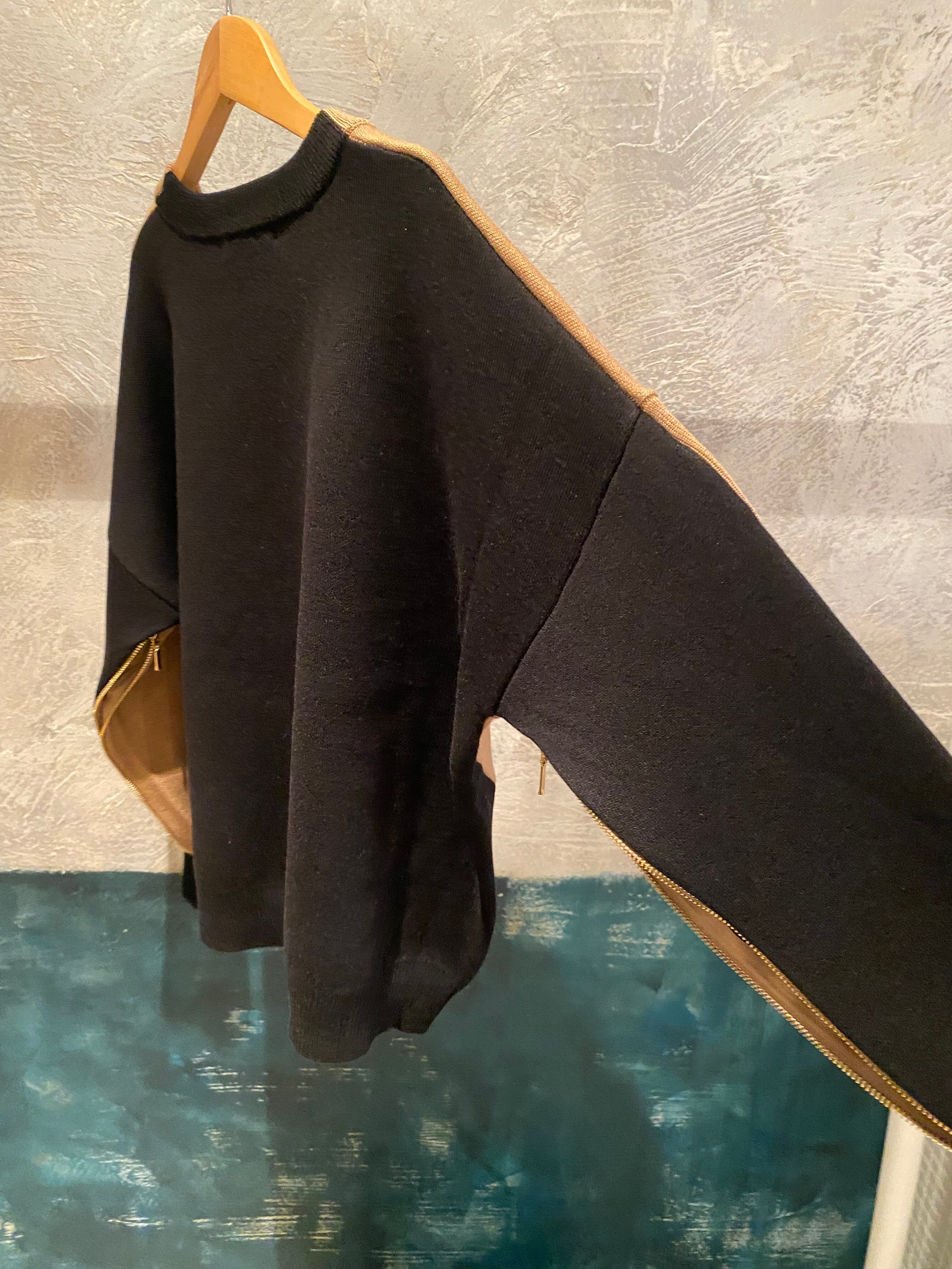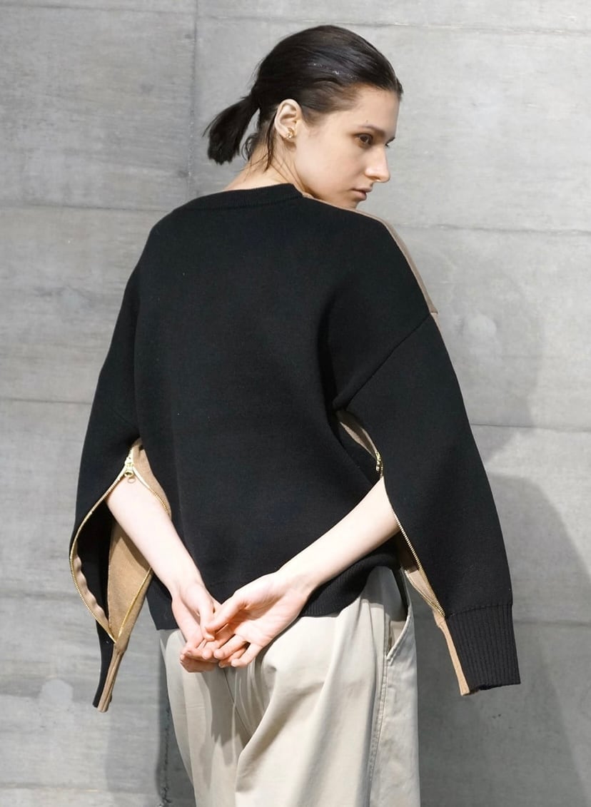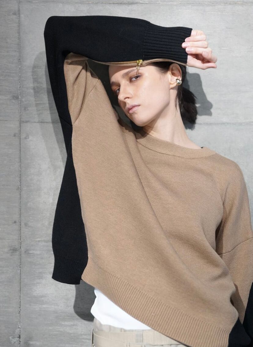 ハリと光沢のある整った編み地でスタイリッシュにまとまったオーバーシルエットのプルオーバートップス。袖下のジップがアクセントを効かせ、大人の女性の遊び心を演出。ジップを開けて手首を通すと肩がけしたような動きが生まれ、シルエットの変化を楽しめます。長めの着丈なので細身のボトムスと合わせメリハリを効かせたり、ワイドパンツやロングスカートを合わせてルーズなシルエットでこなれ感のあるスタイルも◎