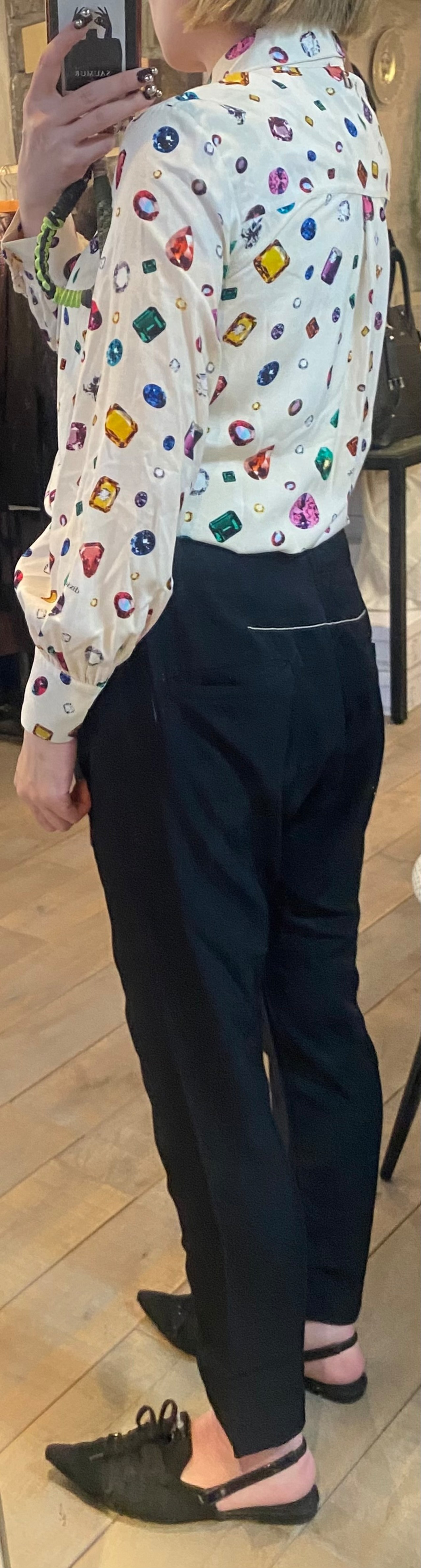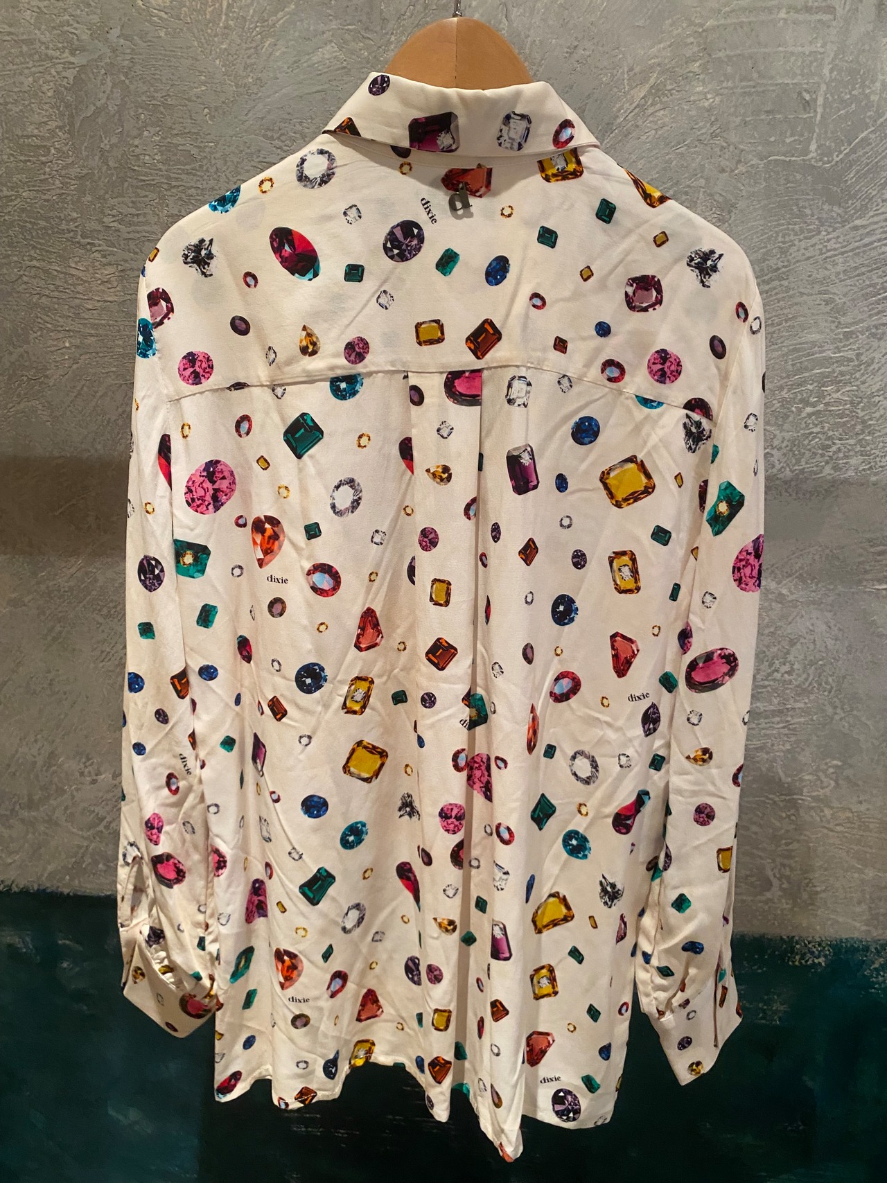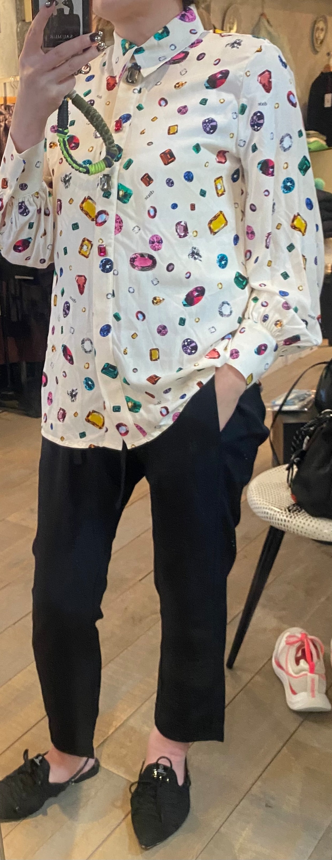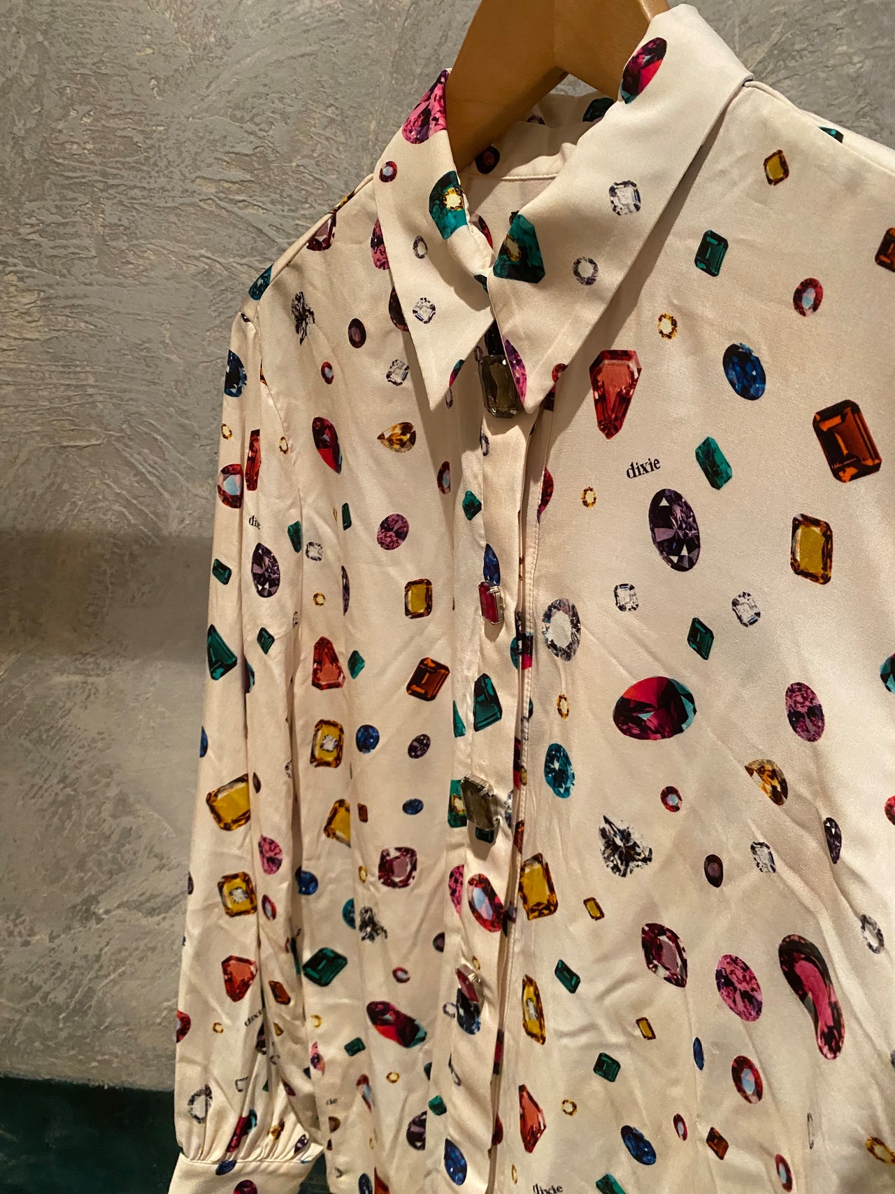 シルエットはシンプルなデザイン。フロント部分の大小様々な宝石のようなボタンがポイント。全体的に施されたプリントもスタイリングのポイントに。メインでもインナーでも活躍するロングシーズン着回せるブラウスです。