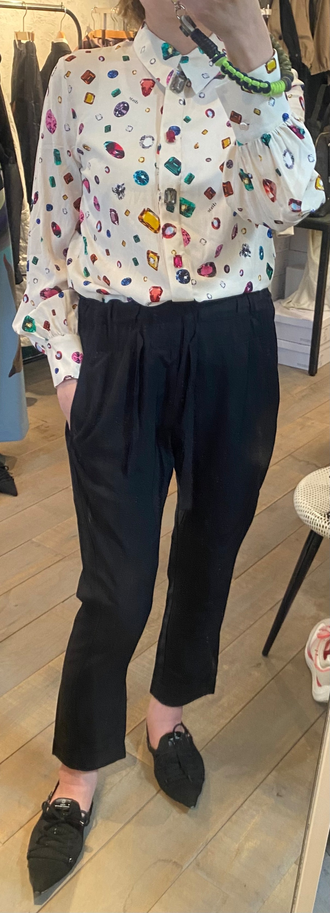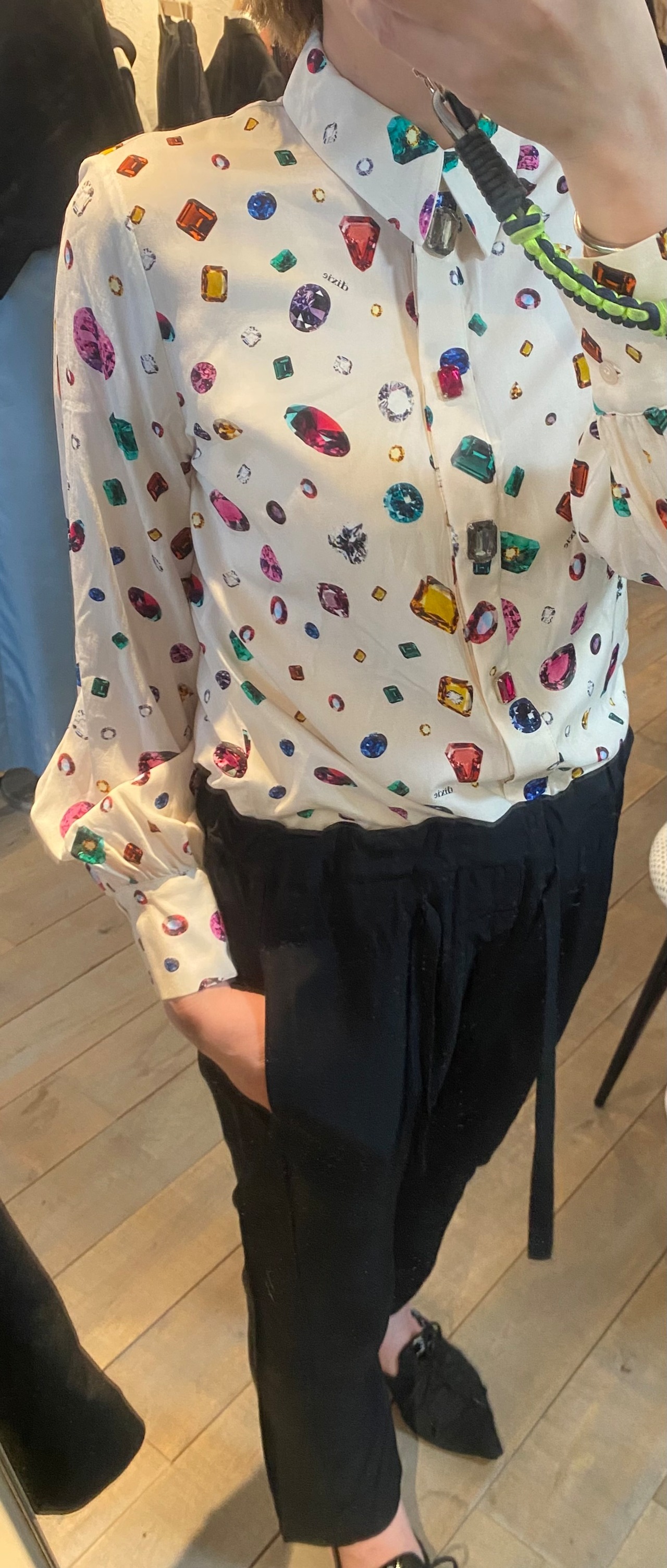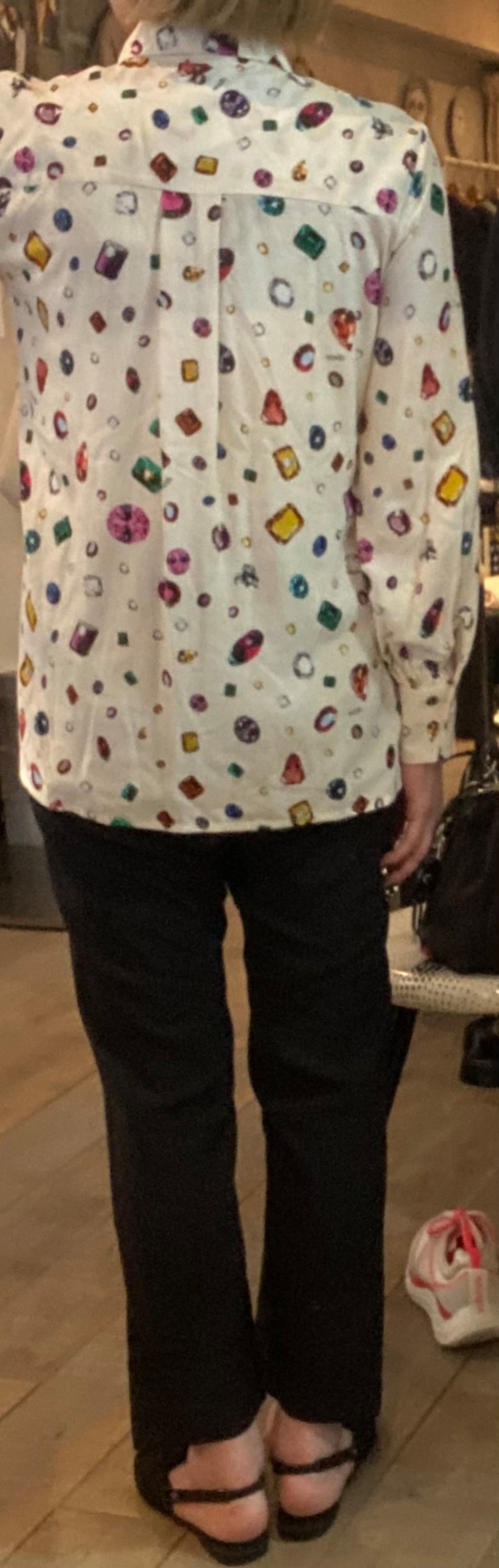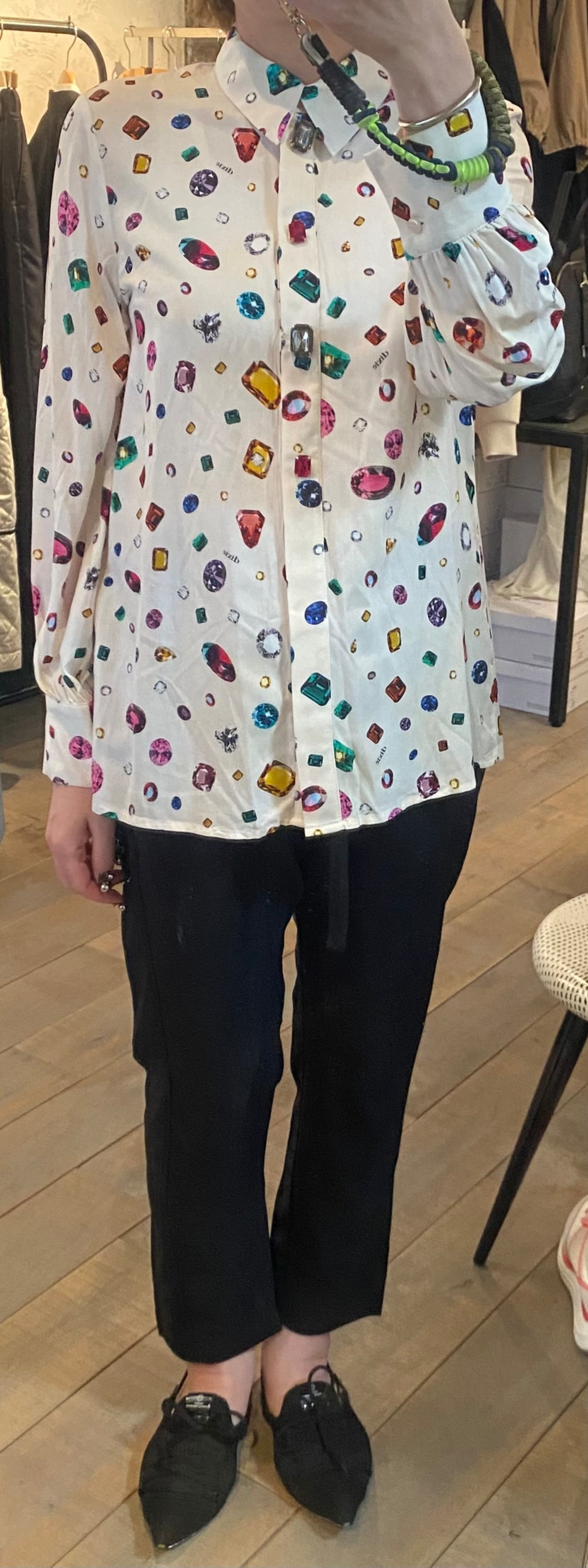 シルエットはシンプルなデザイン。フロント部分の大小様々な宝石のようなボタンがポイント。全体的に施されたプリントもスタイリングのポイントに。メインでもインナーでも活躍するロングシーズン着回せるブラウスです。