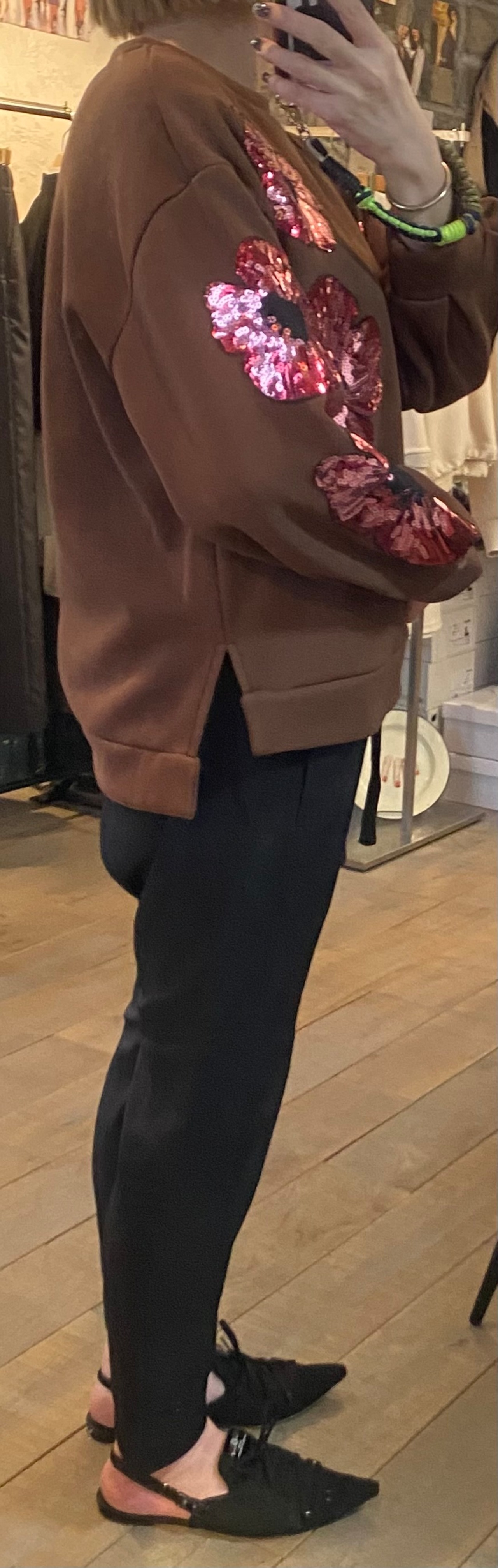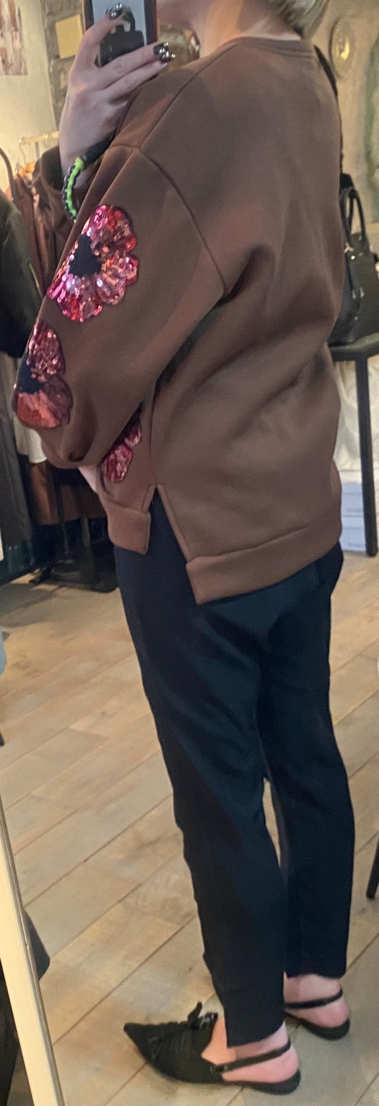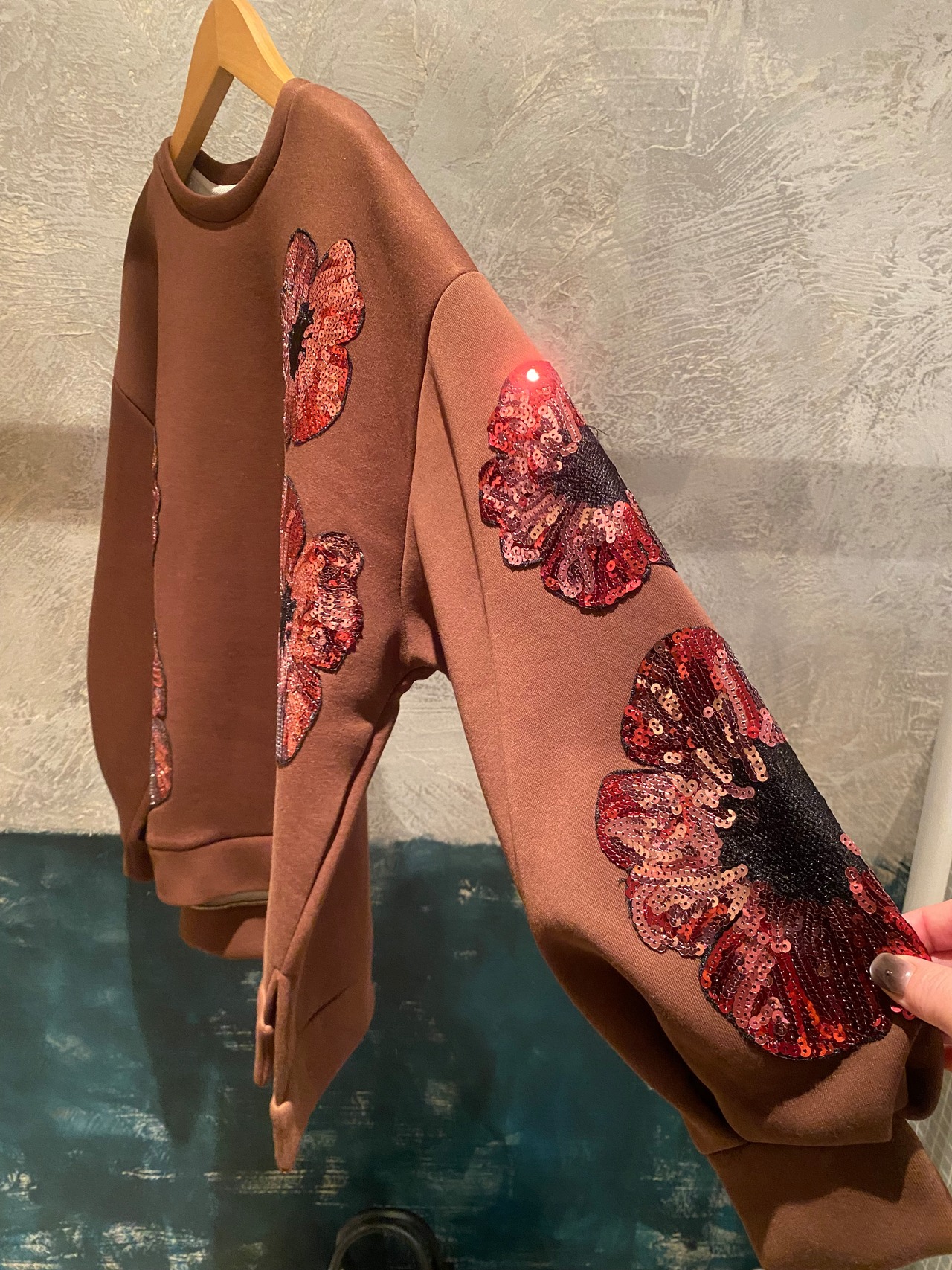裏起毛で保温力抜群のプルオーバートップス。程よくオーバーシルエットで、スパンコールのフラワーデザインがランダムに施されたデザインがポイントのトップスです。スタイリングのポイントに。