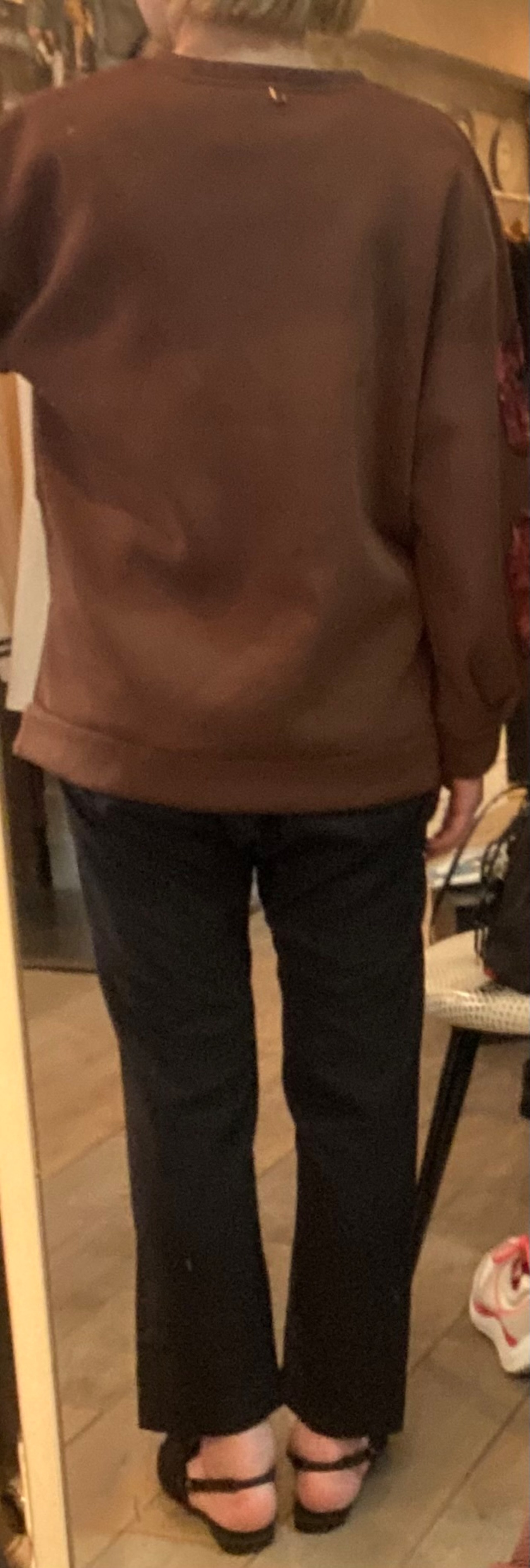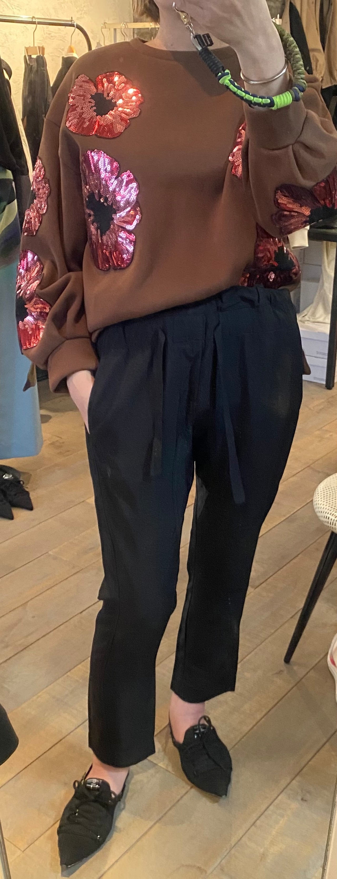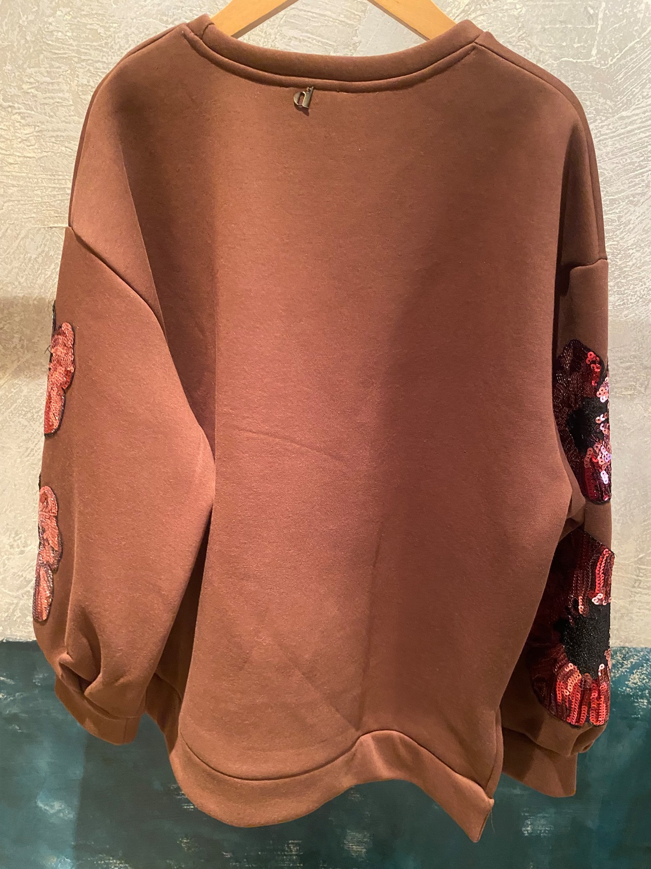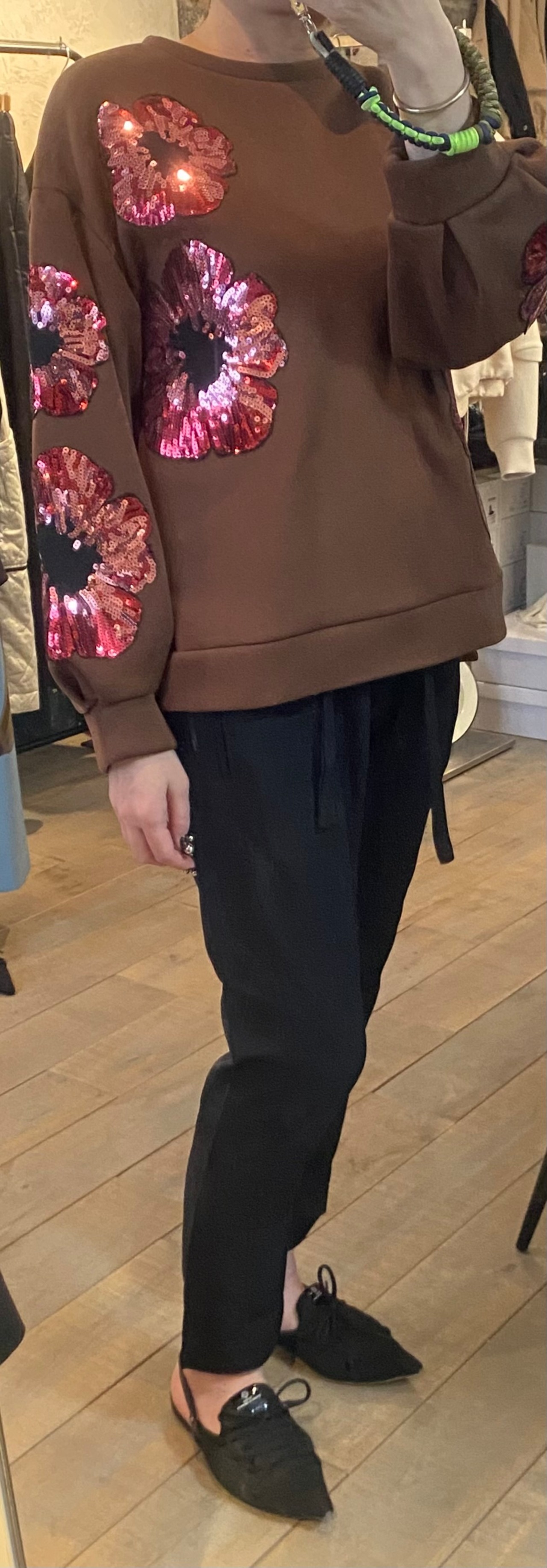 裏起毛で保温力抜群のプルオーバートップス。程よくオーバーシルエットで、スパンコールのフラワーデザインがランダムに施されたデザインがポイントのトップスです。スタイリングのポイントに。