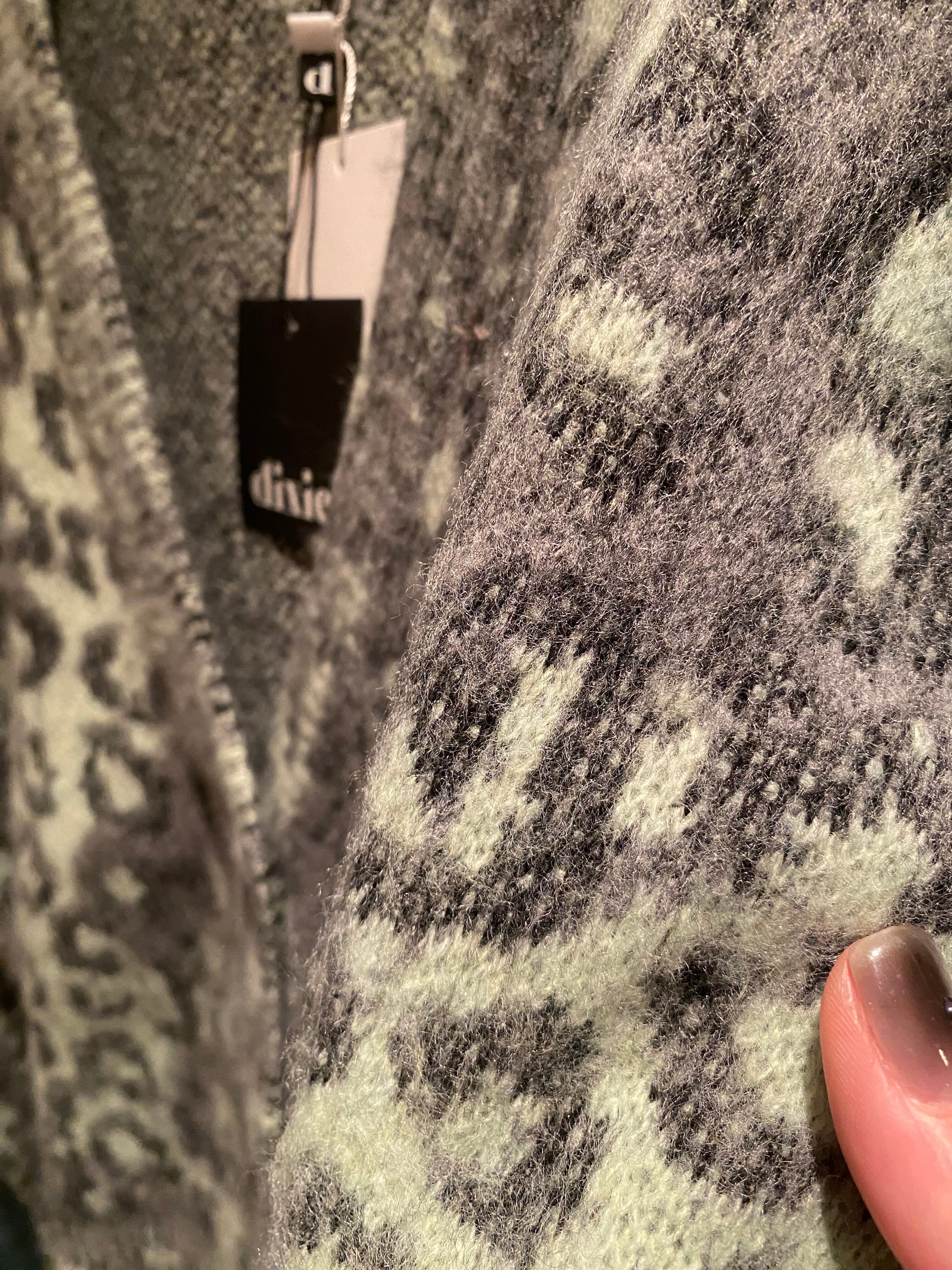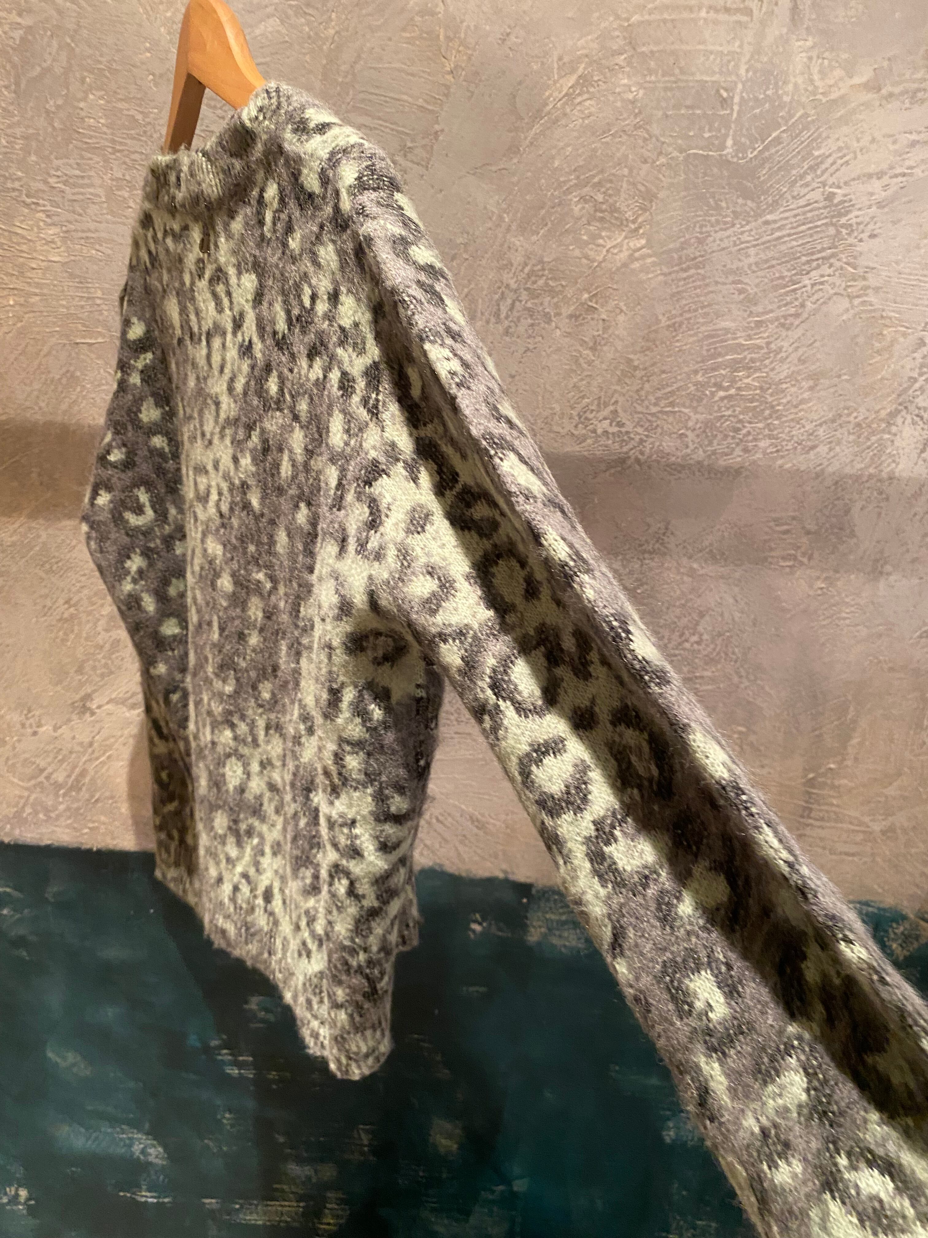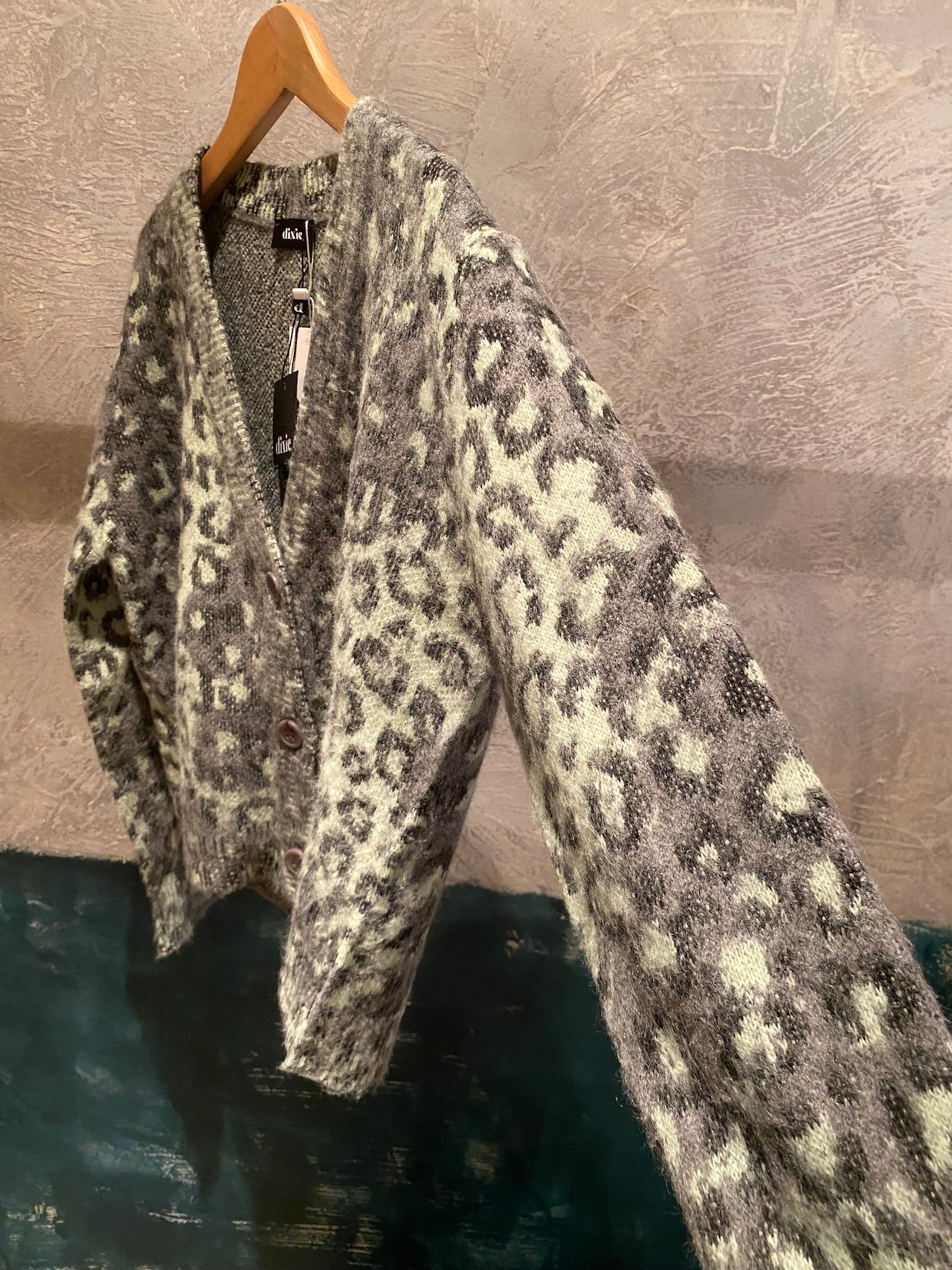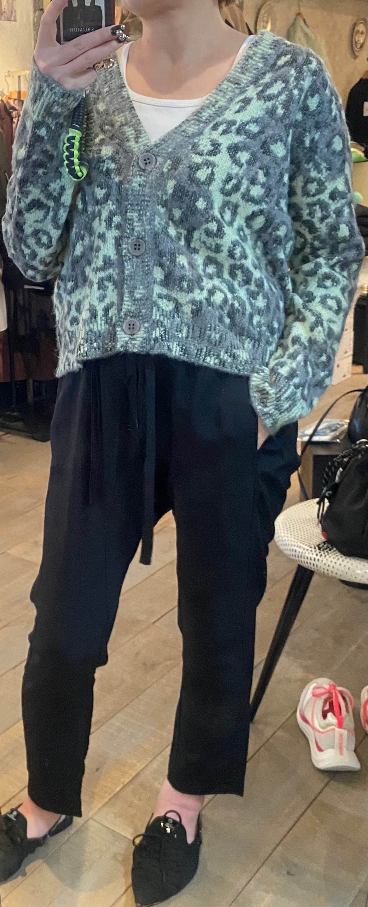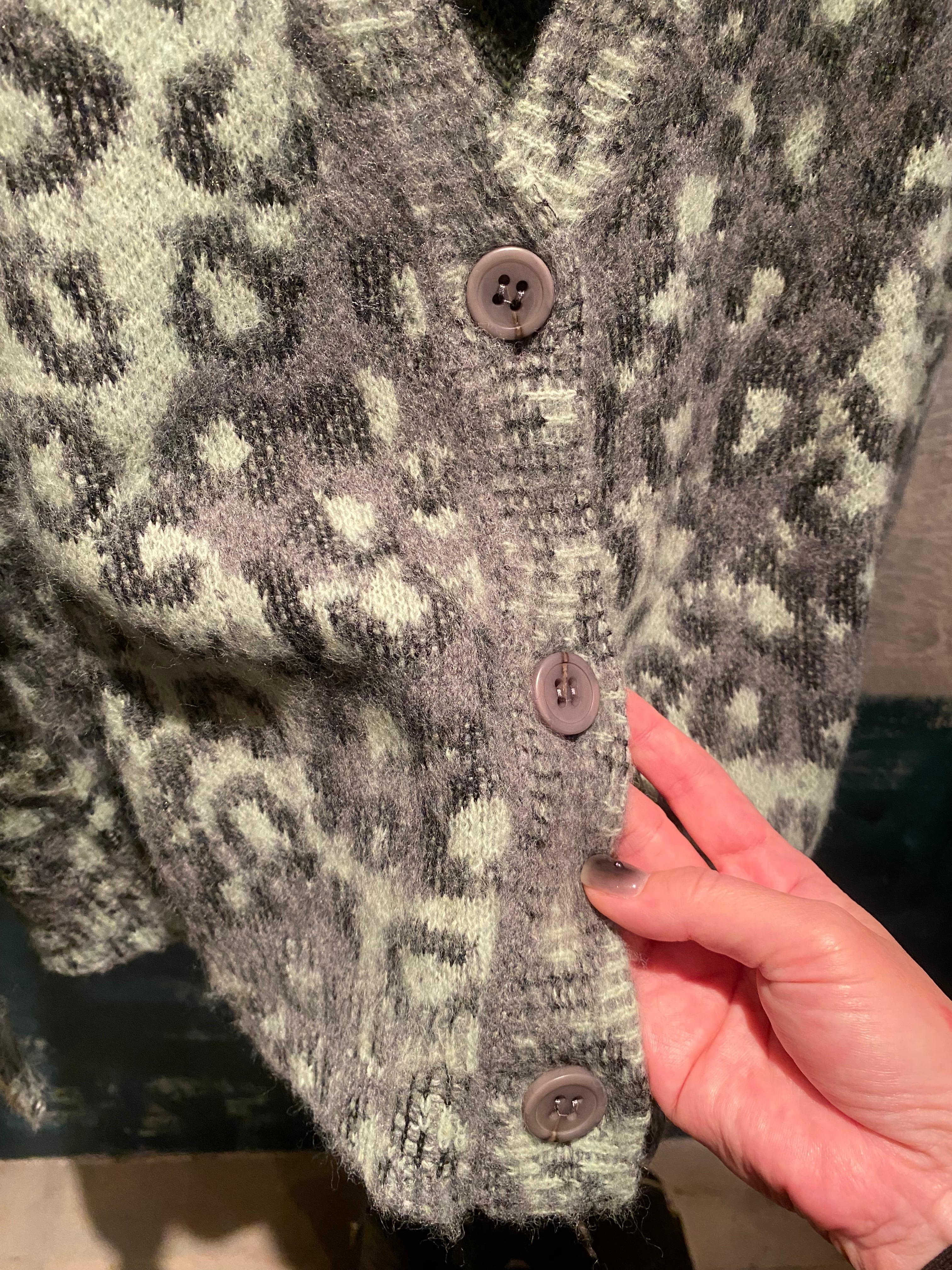 あまりない配色の上品なカラーのレオパード柄がポイントのカーディガン。ニットの柔らかい風合いが特徴的。軽量で程よくゆったり着用でき、カットソーやブラウスなどとレイヤードを楽しんで頂けるアイテムです♪