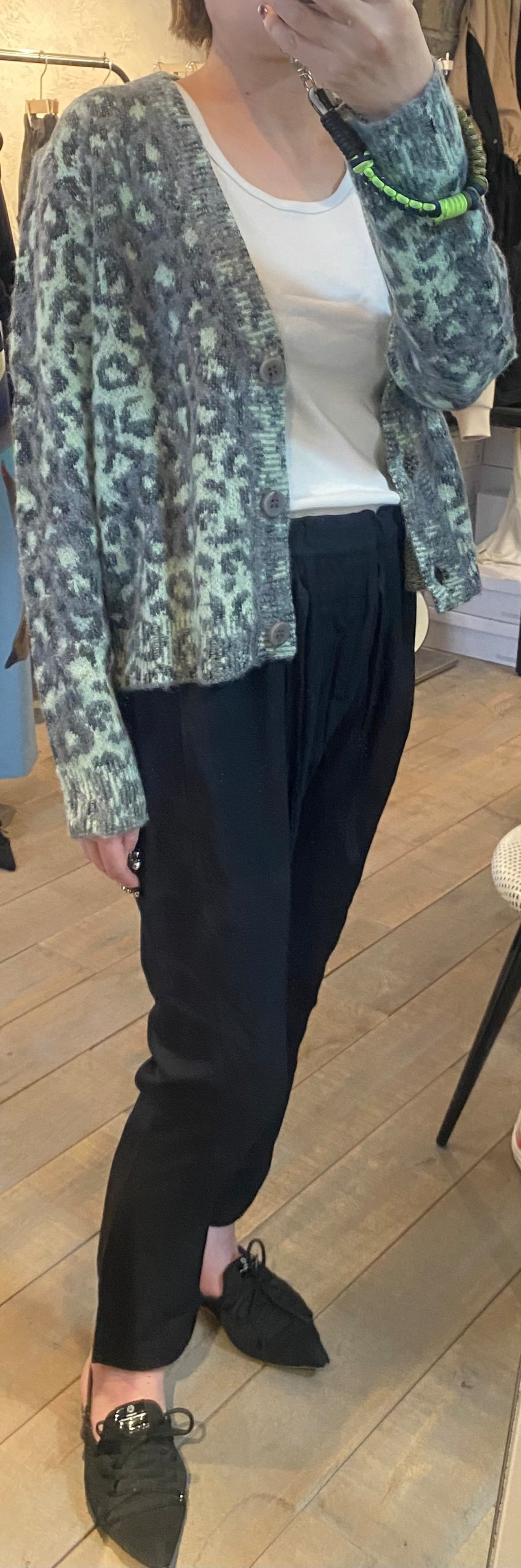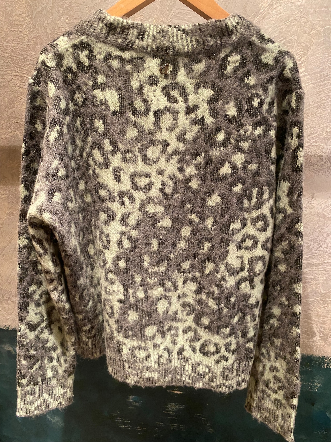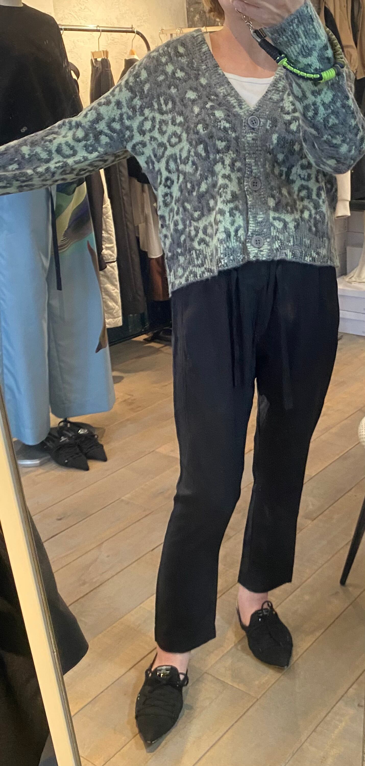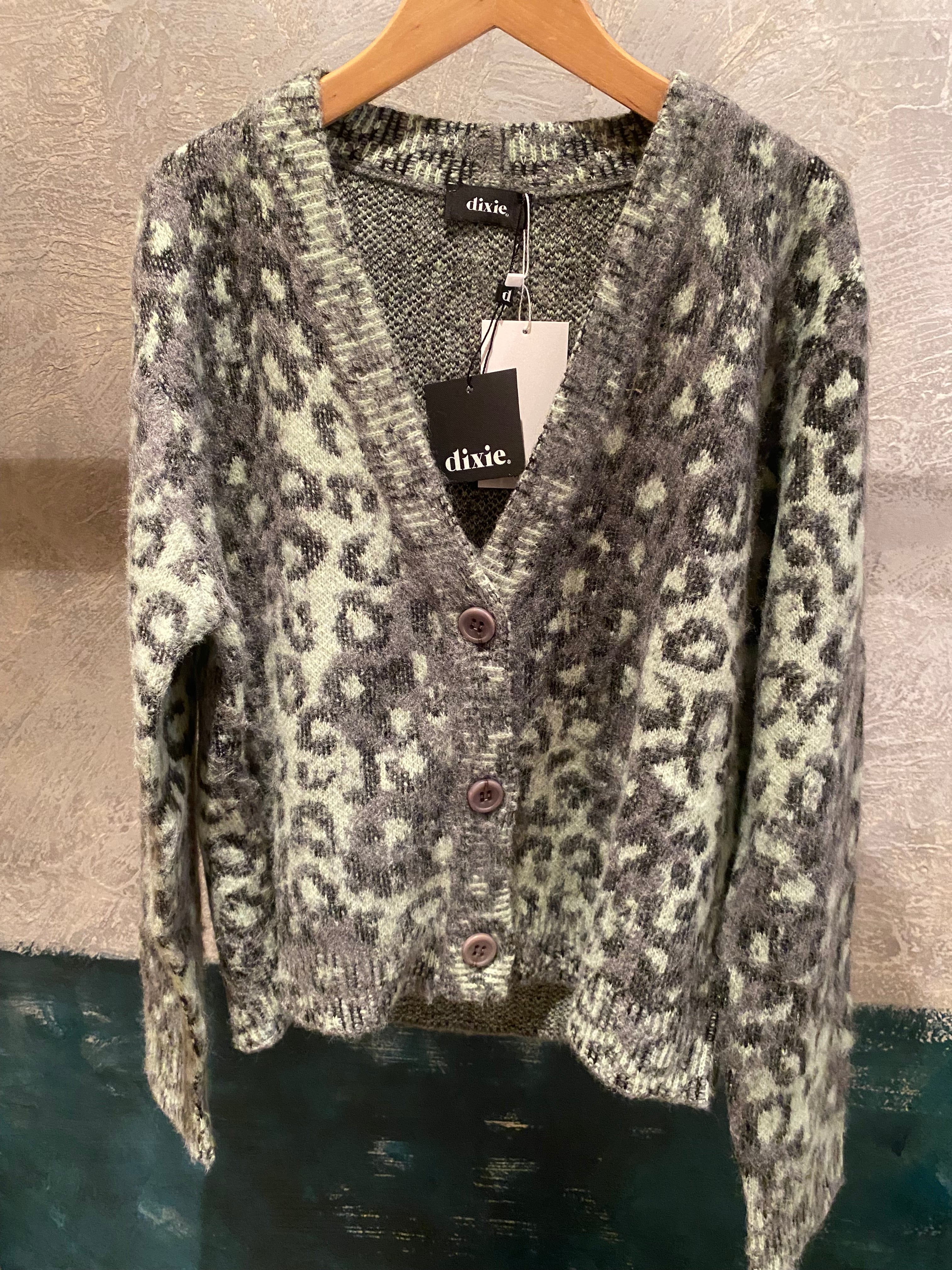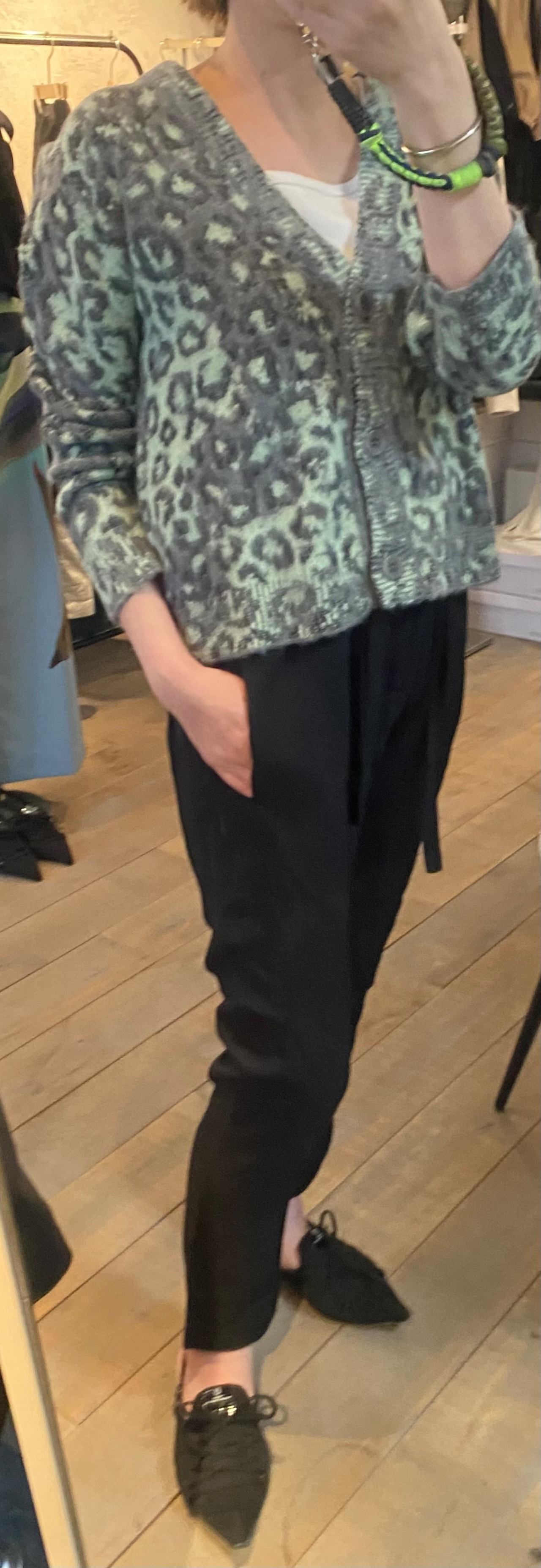 あまりない配色の上品なカラーのレオパード柄がポイントのカーディガン。ニットの柔らかい風合いが特徴的。軽量で程よくゆったり着用でき、カットソーやブラウスなどとレイヤードを楽しんで頂けるアイテムです♪