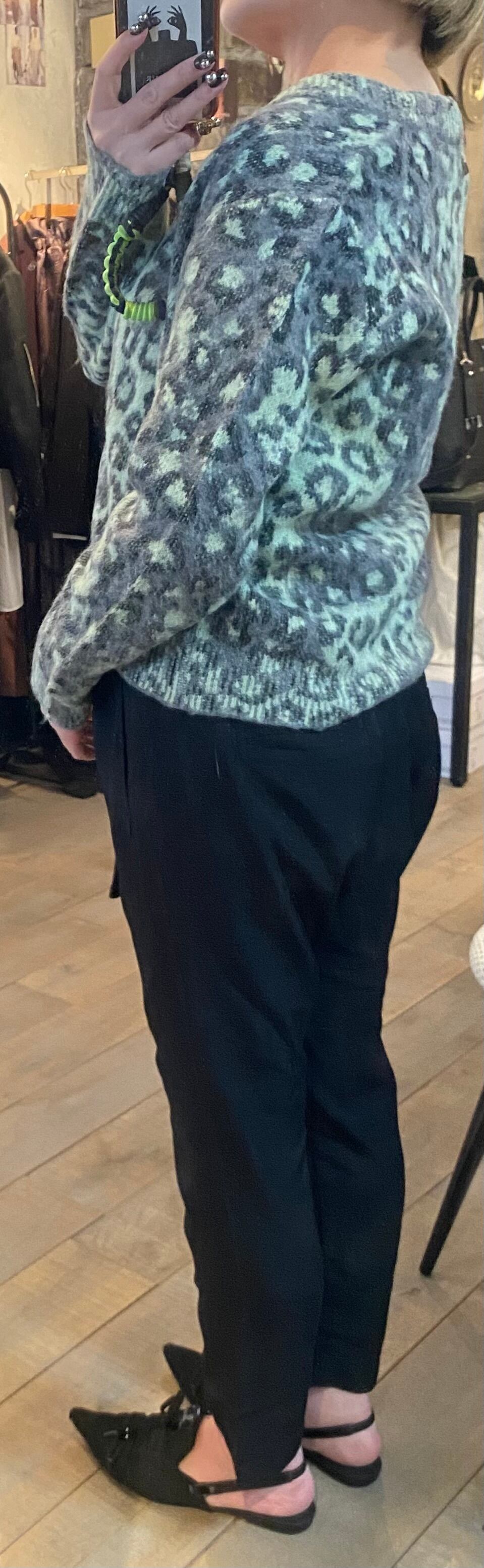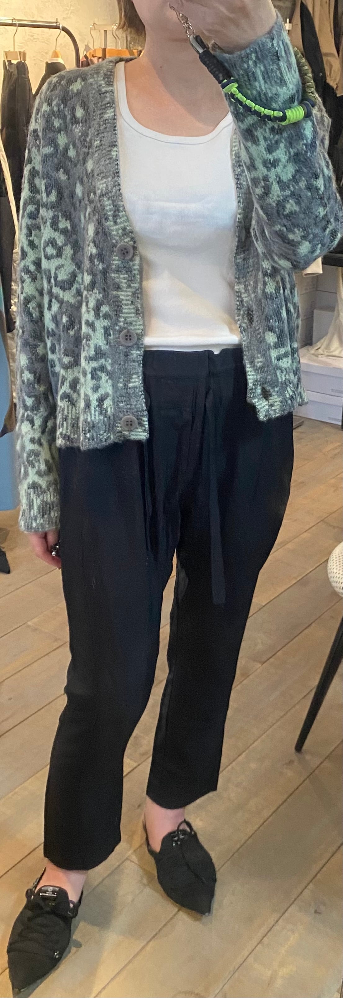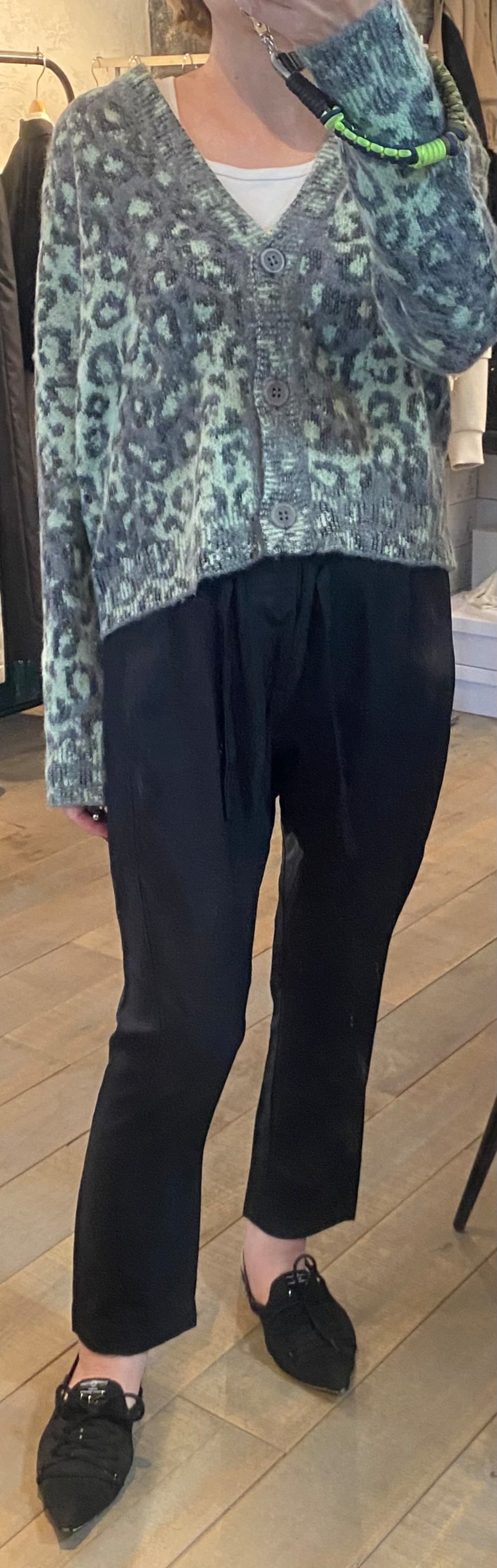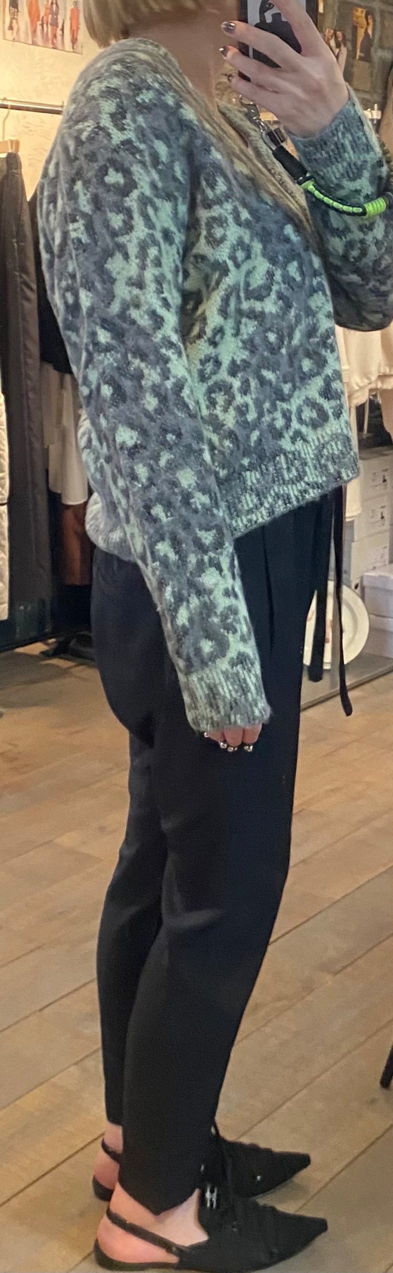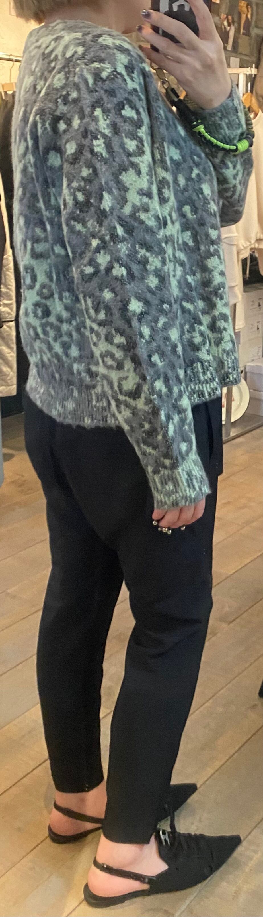 あまりない配色の上品なカラーのレオパード柄がポイントのカーディガン。ニットの柔らかい風合いが特徴的。軽量で程よくゆったり着用でき、カットソーやブラウスなどとレイヤードを楽しんで頂けるアイテムです♪