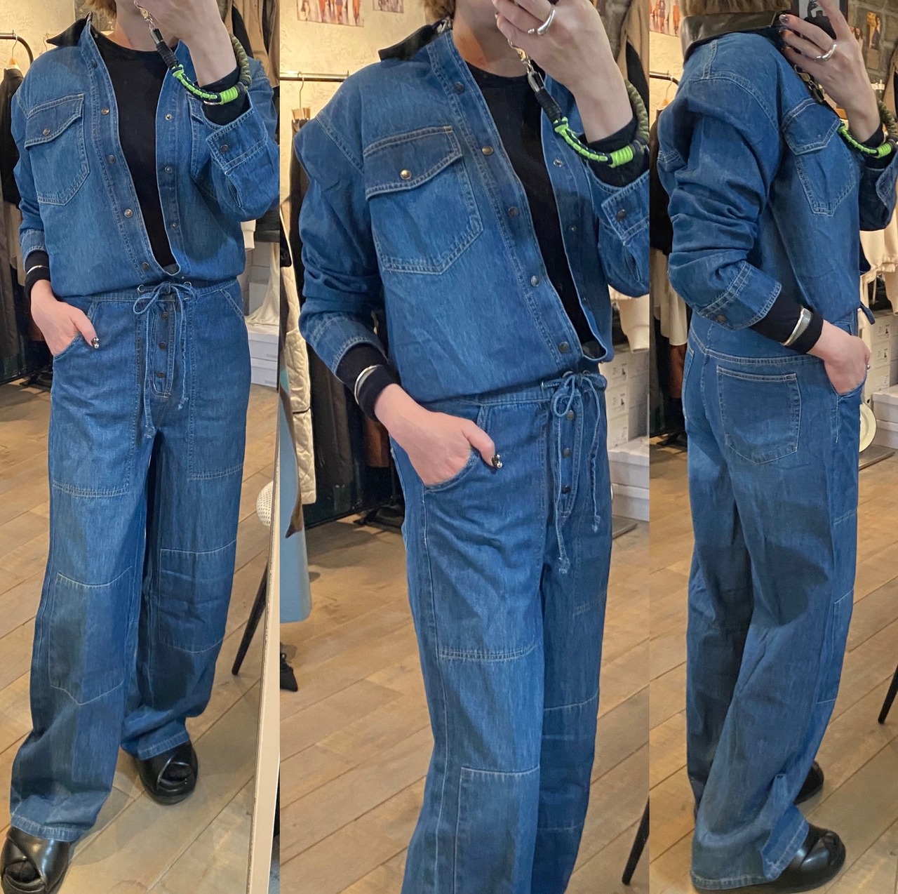 リラックスしたボイラースタイルのジャンプスーツ。襟元のフェイクレザーの異素材がポイント。キチッと着ても、開けてお袖もロールアップさせて着崩すスタイルも◎スタイリングが完結するロングシーズン着回せるアイテムです。ソフトなデニムなので着心地も◎