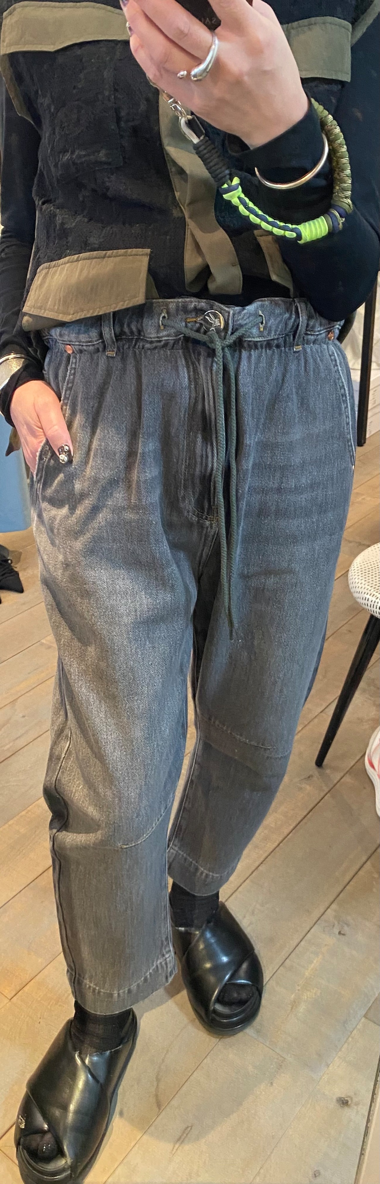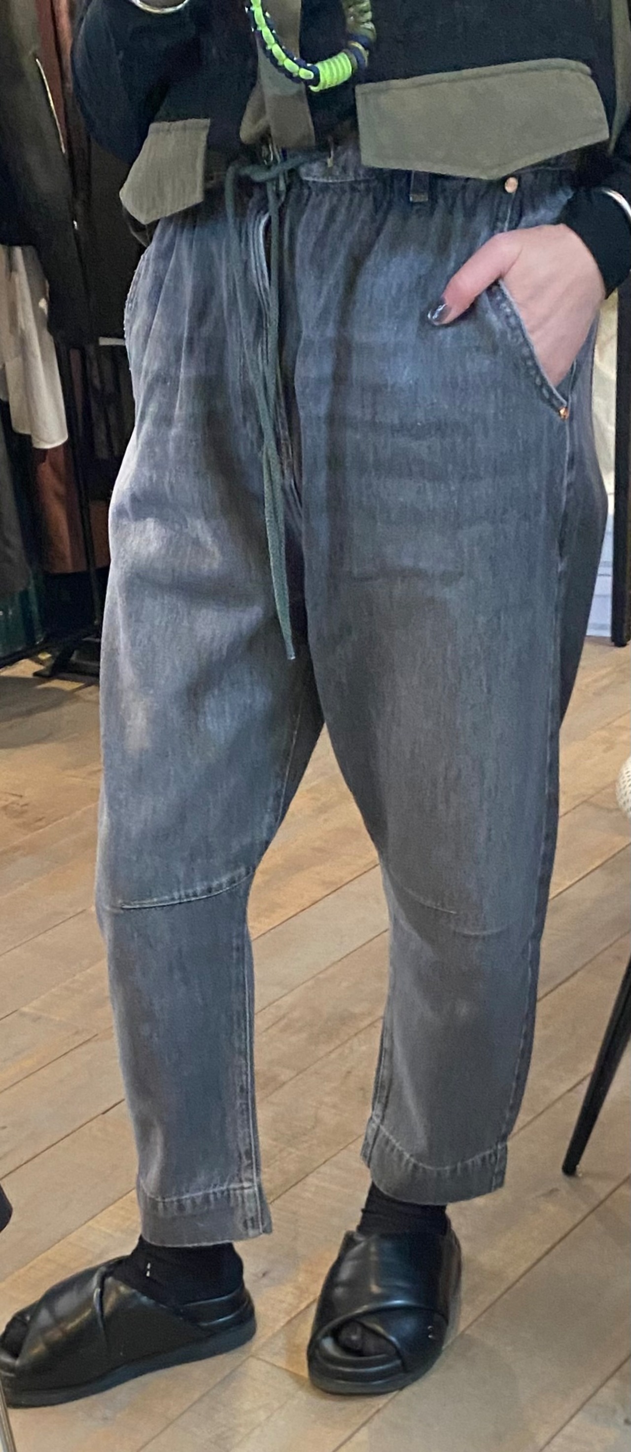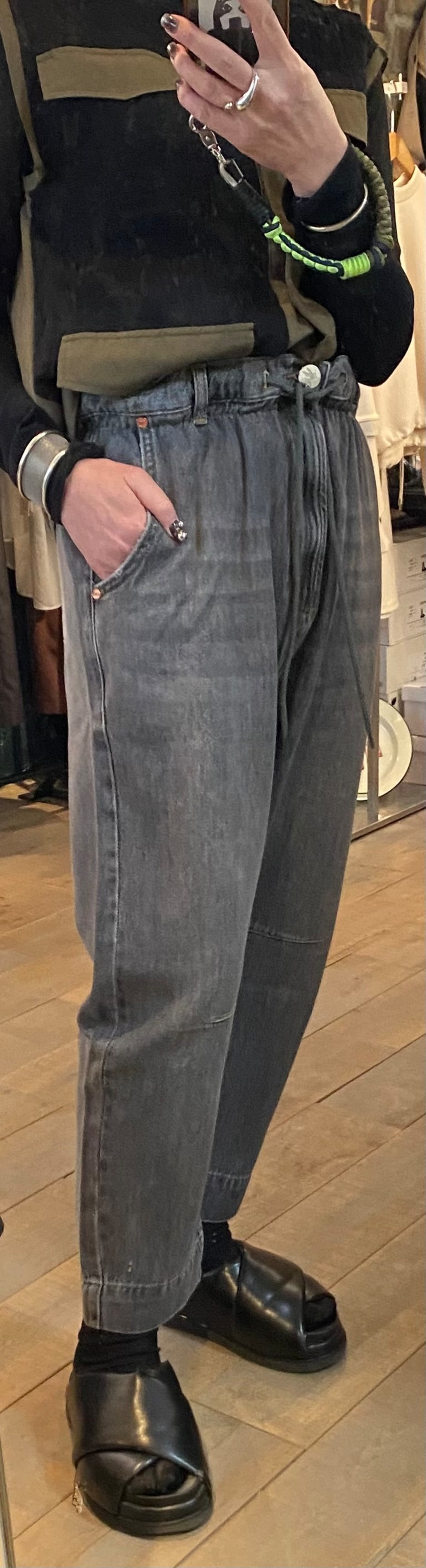ペーパーバックのウエストとハーレムスタイルの脚がスッキリとしたシルエットを演出。足首にややテーパーがかるボウレッグカットで、リラックスした仕立てを演出。フィット感のあるトップスでも、オーバーシルエットのトップスでも相性の良いオールシーズン着回せるデニムです。ウエストは内蔵されたゴムと紐でサイズ調節可能。