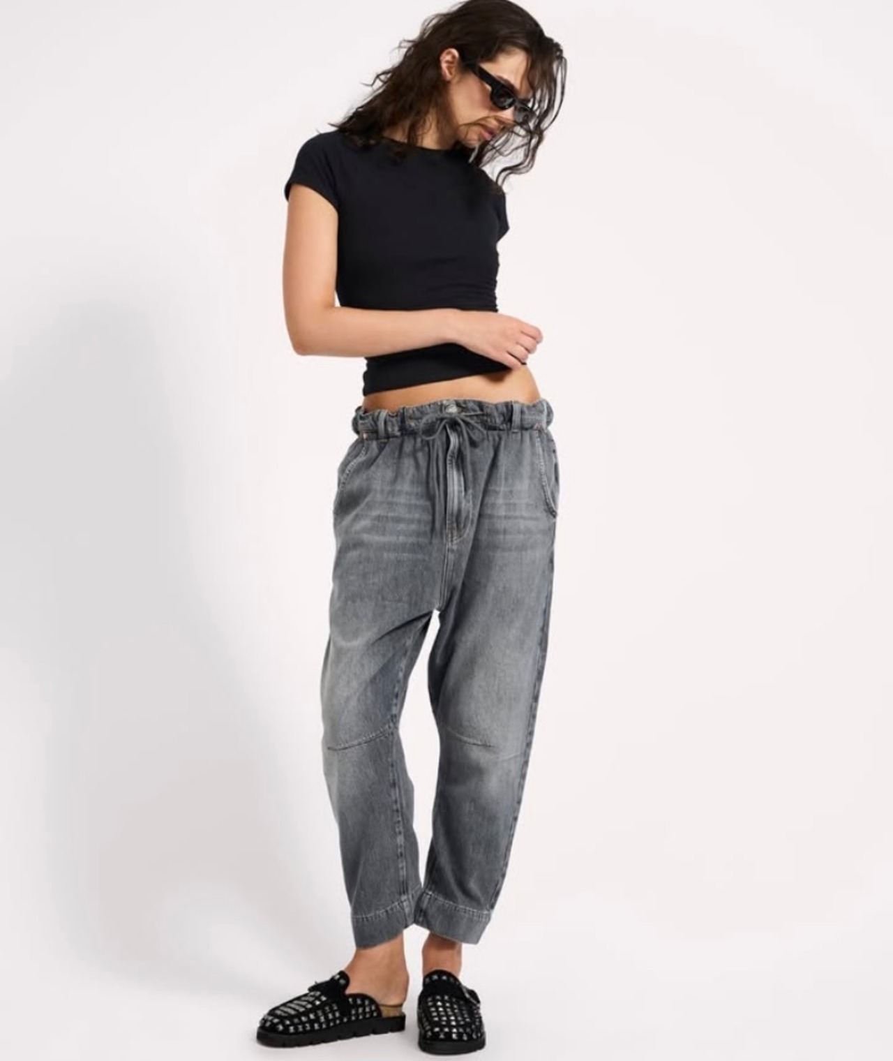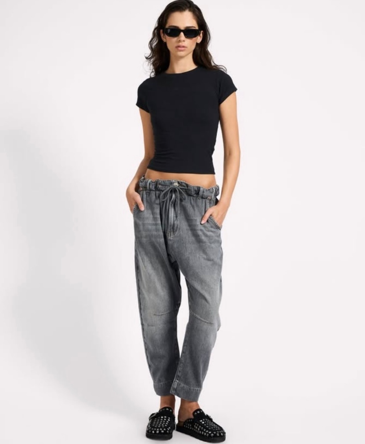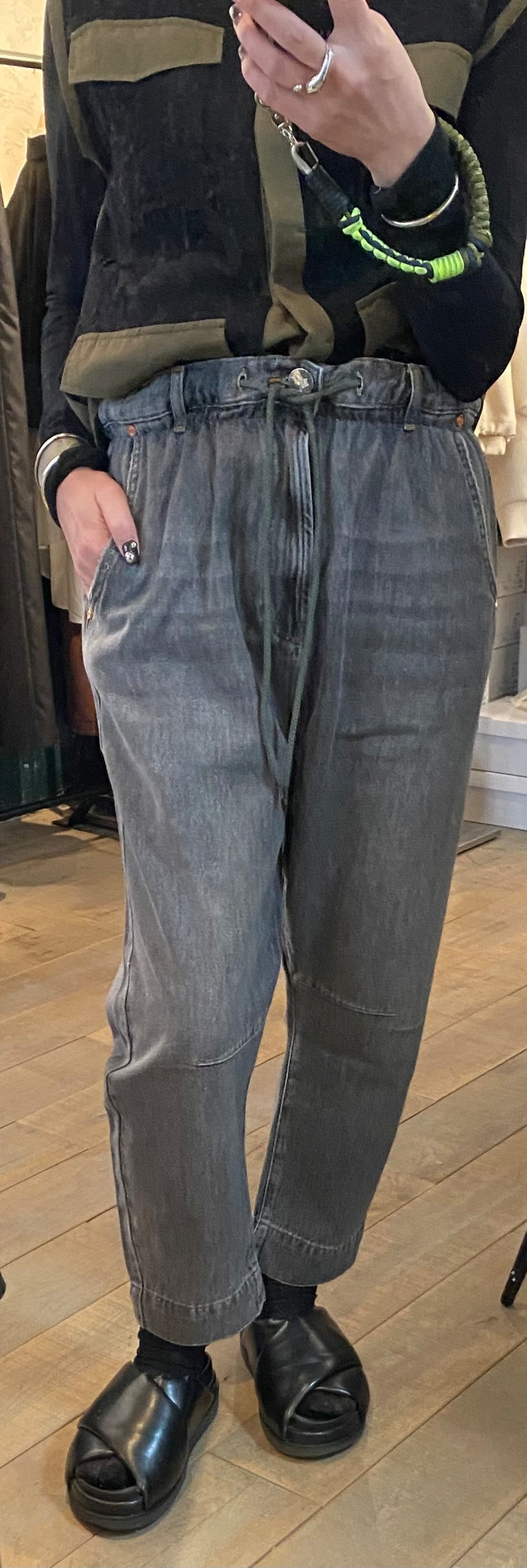 ペーパーバックのウエストとハーレムスタイルの脚がスッキリとしたシルエットを演出。足首にややテーパーがかるボウレッグカットで、リラックスした仕立てを演出。フィット感のあるトップスでも、オーバーシルエットのトップスでも相性の良いオールシーズン着回せるデニムです。ウエストは内蔵されたゴムと紐でサイズ調節可能。