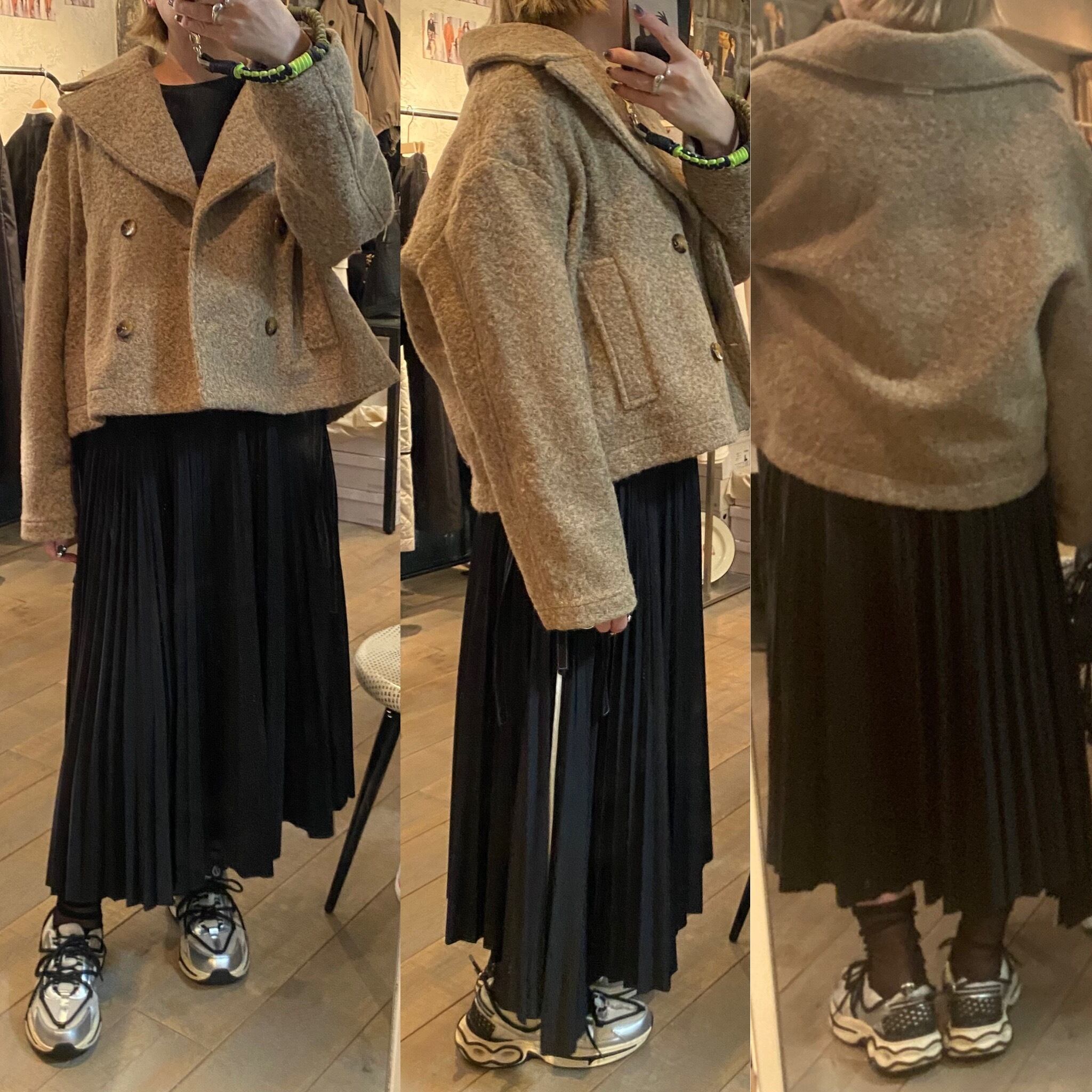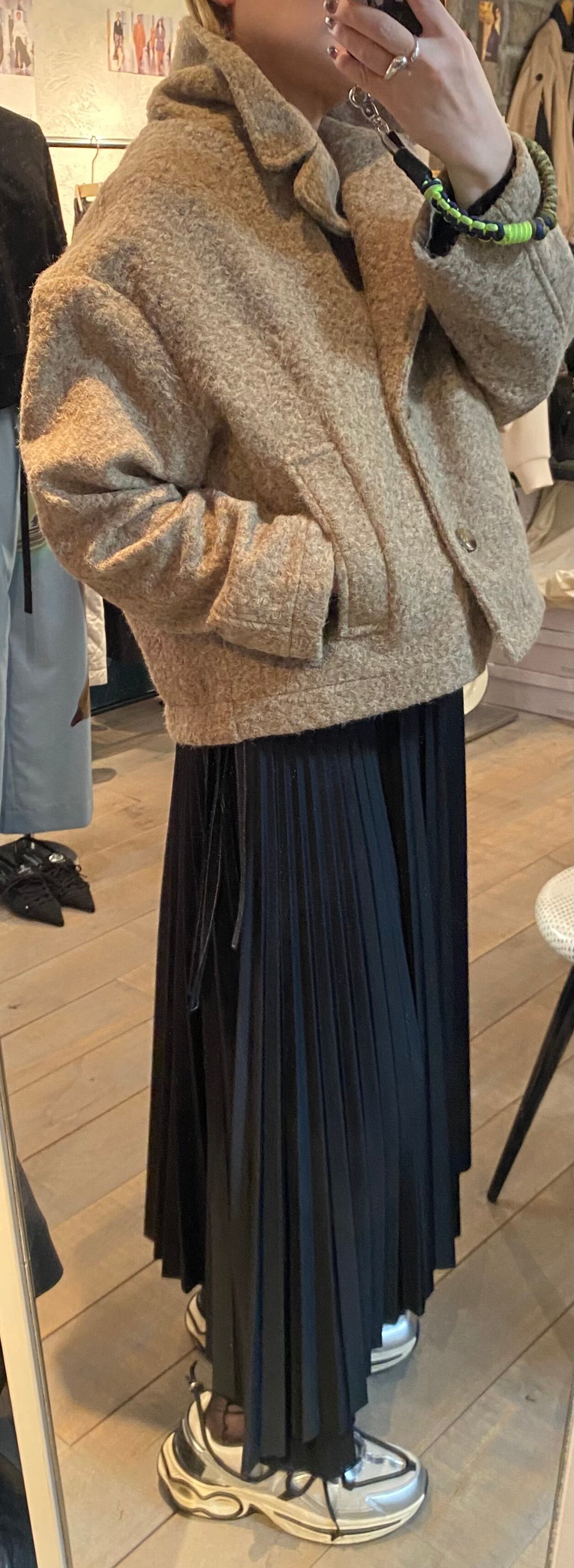 オーバーシルエットで、サラッと着るだけで雰囲気の出るショートコート。馴染みのいいモカベージュカラーで合わせやすいです。バランスのとりやすい着丈なので合わせるボトムスも選びません。軽くて着心地も◎素材感が特徴的。