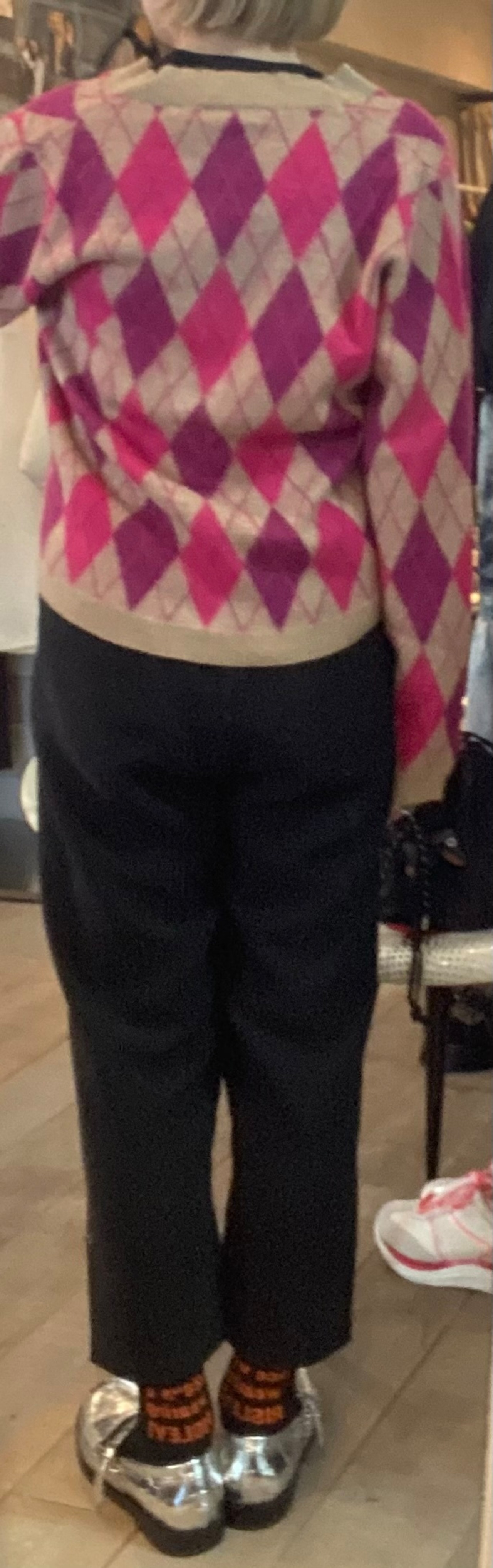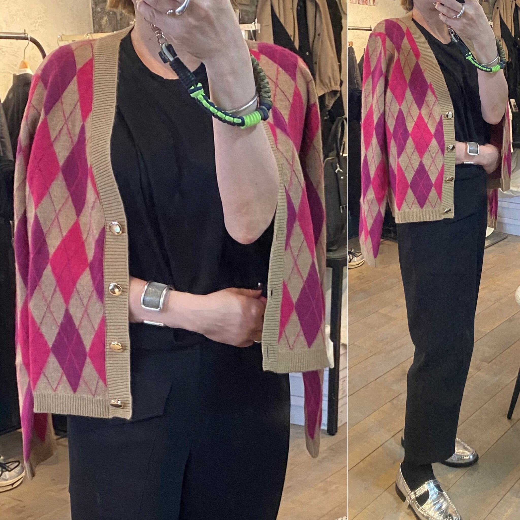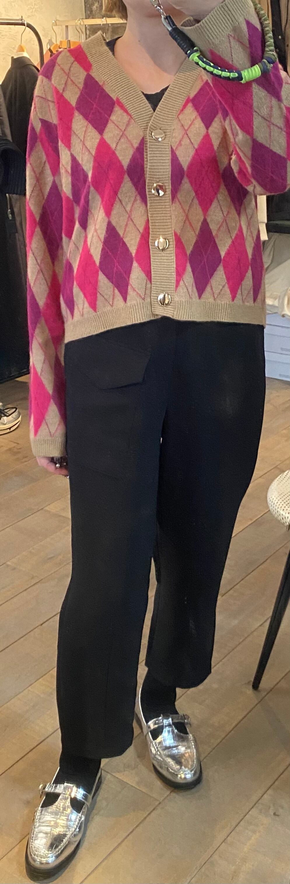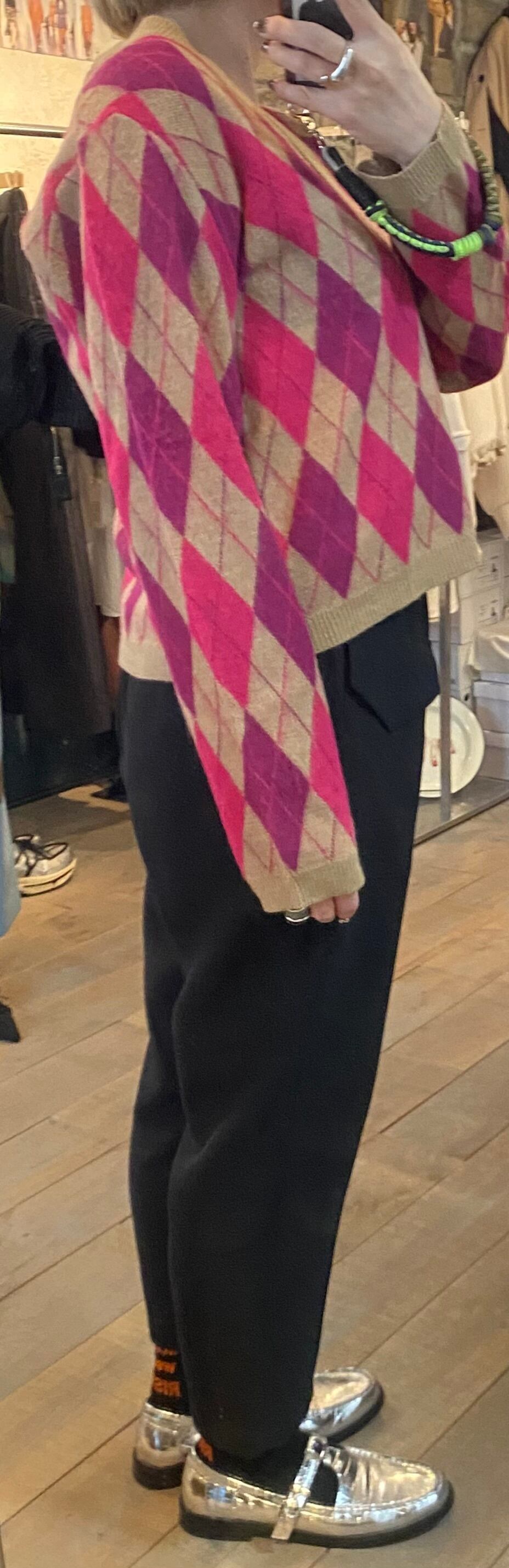 軽くて羽織りやすいVneckカーディガン。アーガイルの配色が素敵です。スタイリングのポイントになるアイテム。メインでの着回しも、アウターの下でも嵩張らないので着回し力抜群です♪