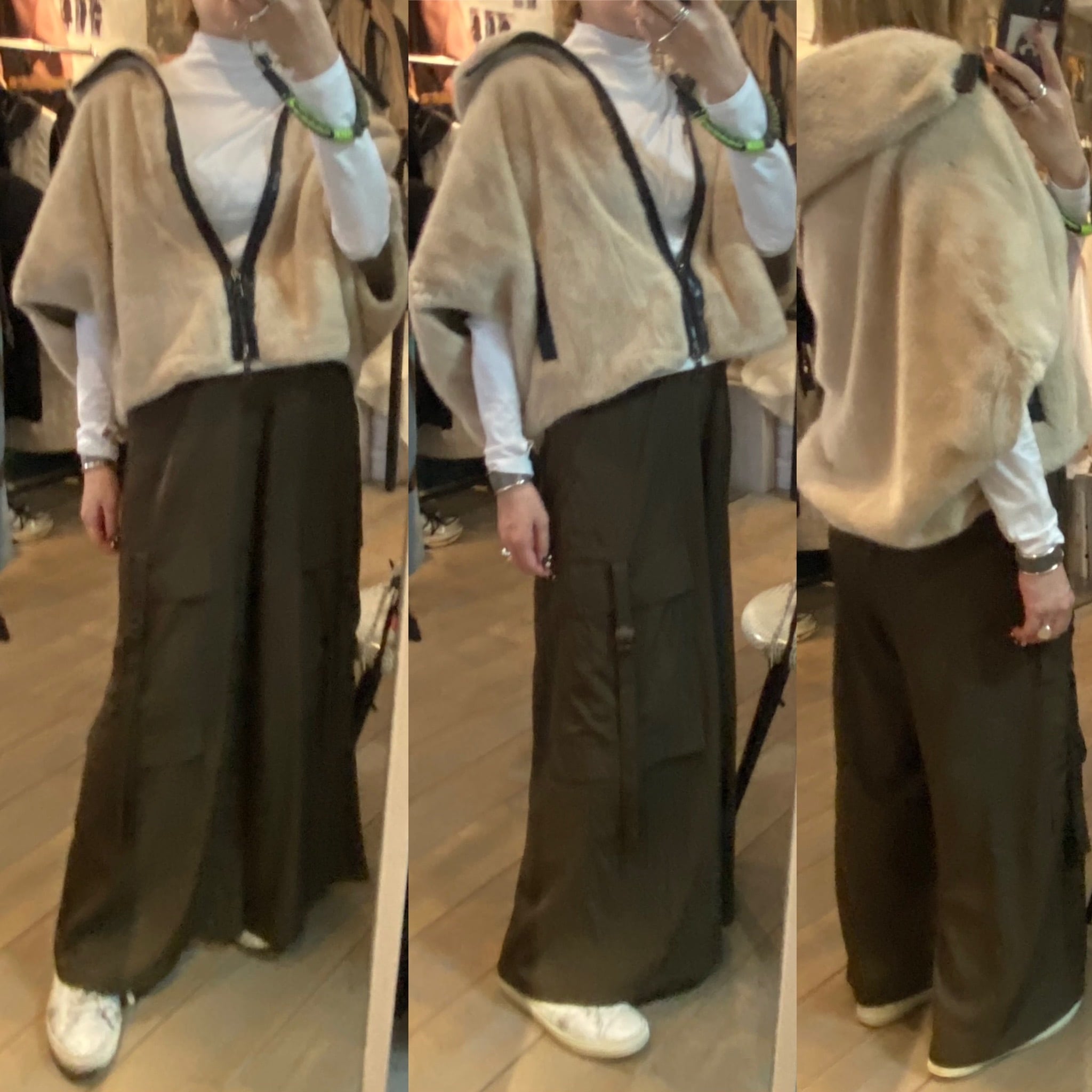 エコファーのベスト。柔らかい印象のライトベージュに、フェイクレザーの異素材でのポケットとフロントジップの縁取りでスッキリしまった印象に。ダプルジップ仕様で、着方も様々楽しめます。カットソーやニット、シャツなどとのレイヤードや、アウターなどの上にレイヤードするのも◎