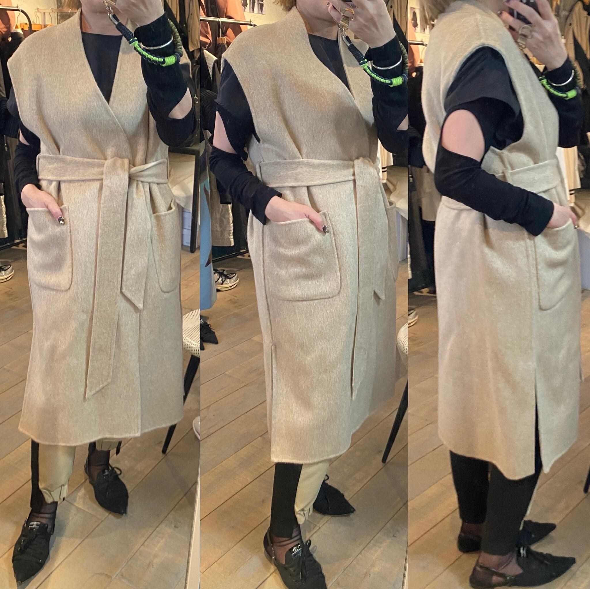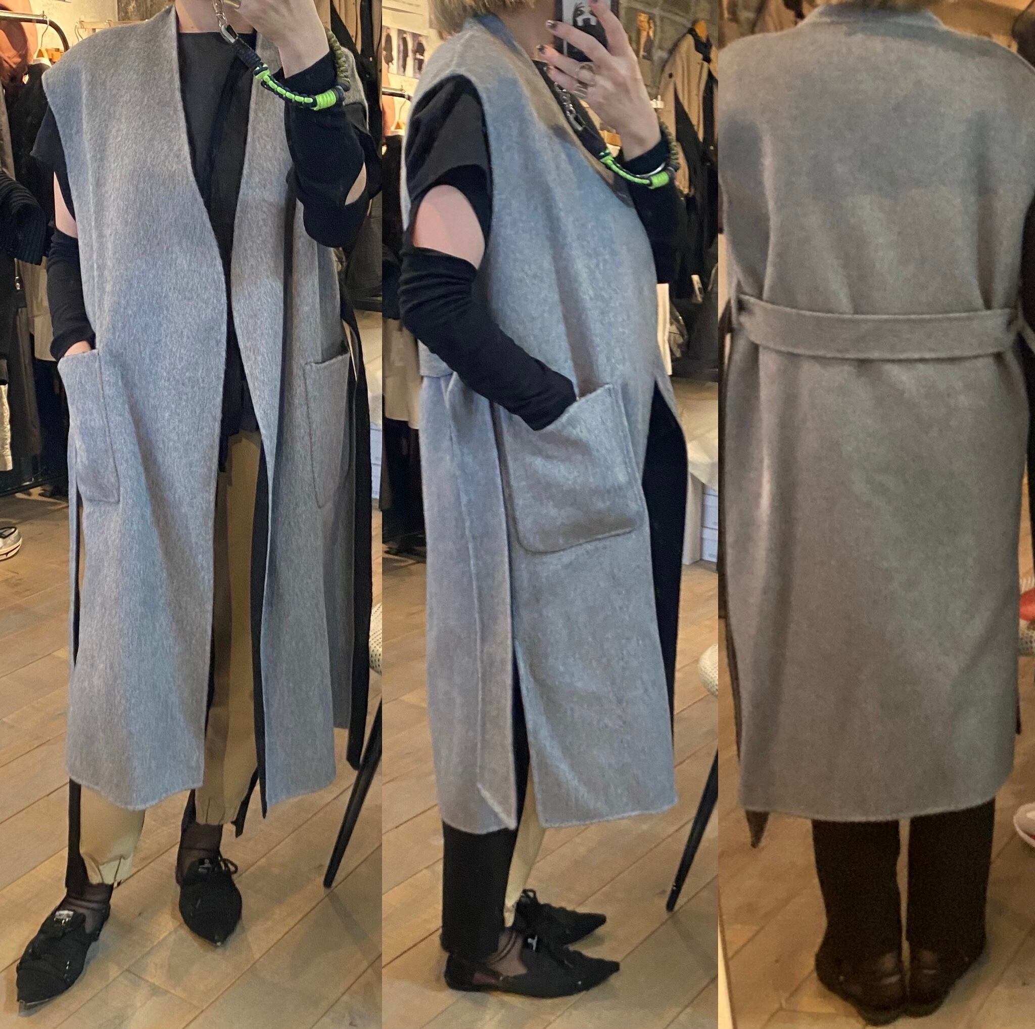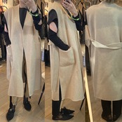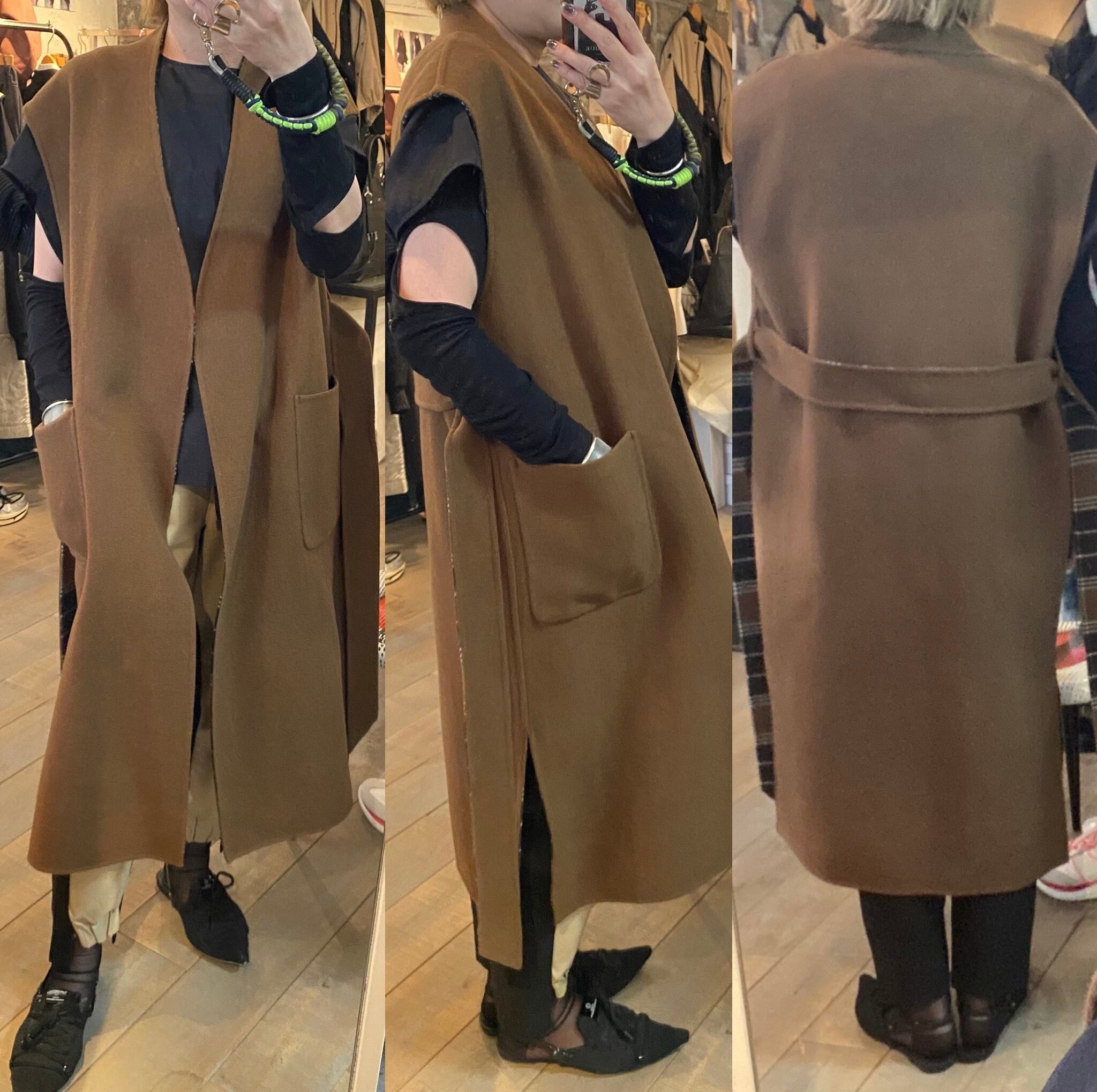 レイヤードに便利なベルテッドジレ。リバーシブルで楽しんで頂け、コーディネートの幅を広げてくれます。ダブルフェイスで上品な印象。フロントサイドにポケット有り。ベルトを開けてサラッと羽織っても、ベルトマークしてワンピース見えさせるのも◎