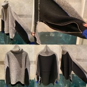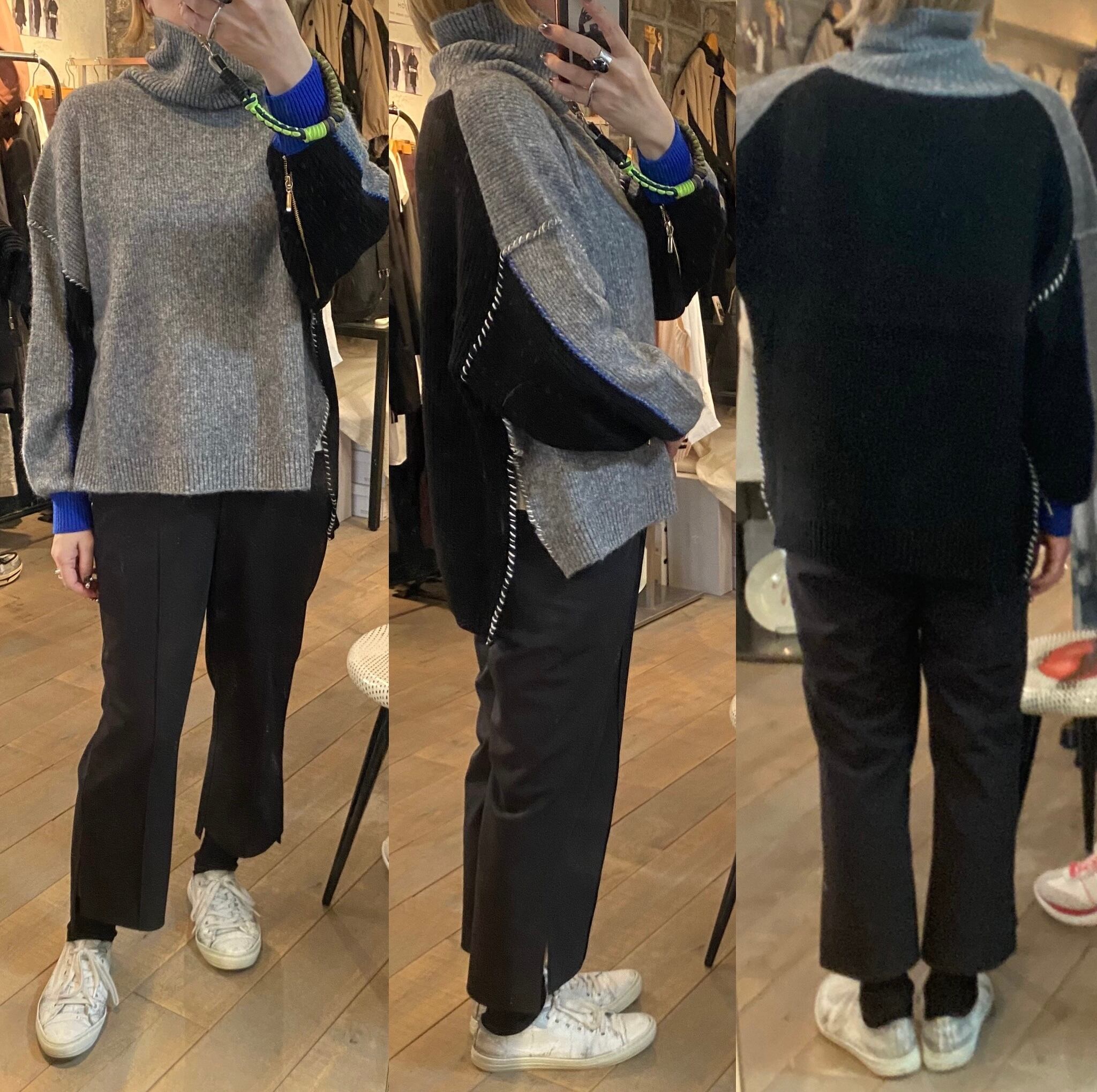 ソフトな風合いのモヘアストレッチとストレートヤーン、2つの異なる素材をバイカラーで合わせる事でコントラストを与えるアイテムです。パッチワーク切り替え部分には、1針づつ丁寧に縫われたハンドステッチ。袖口のアクセントカラーや袖下のジップディテールが目を惹き、さりげなく印象を残す存在感に。