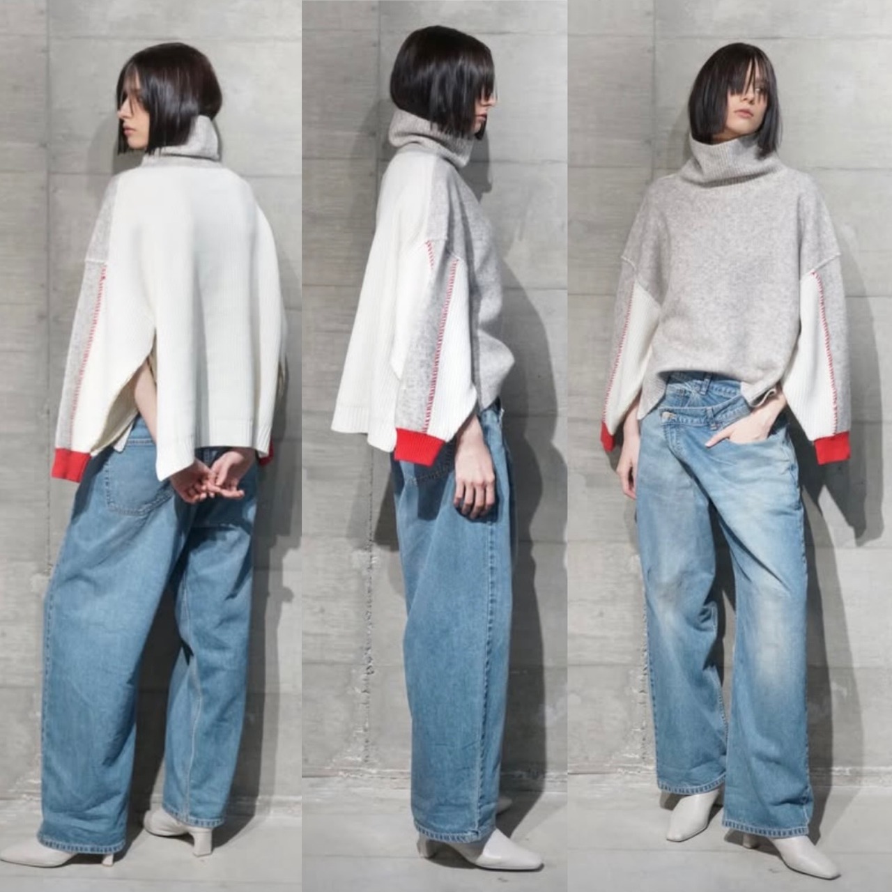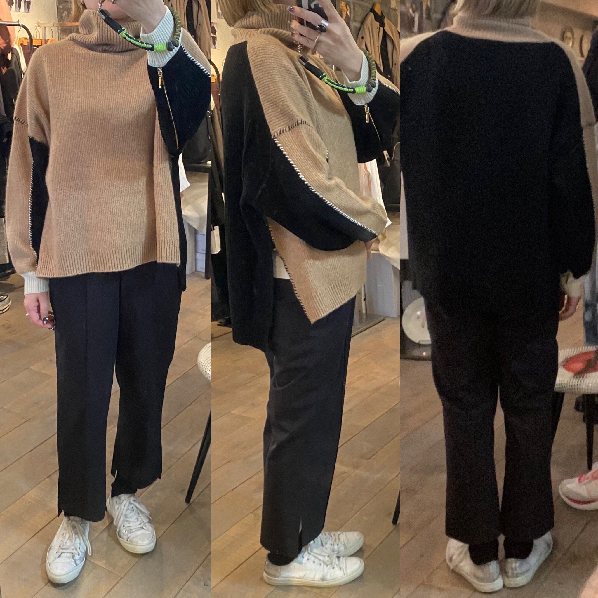 袖下のジップはさりげないアクセントで、手首を通して開ければ肩掛けしたような動きが生まれ、シルエットの変化を楽しめます。背面ははっきりしたバイカラーで、後ろ姿の印象もグッと変化します。前より長めに設定した後ろ着丈が気になるヒップラインをさりげなくカバーし、裾の前後差を活かしてフロントだけボトムにインする着方も◎首周りはゆったりめのボリュームタートルで折り返せばスッキリ、折らずにルーズに着用すれば首周りのニュアンスが出て雰囲気も出ます。