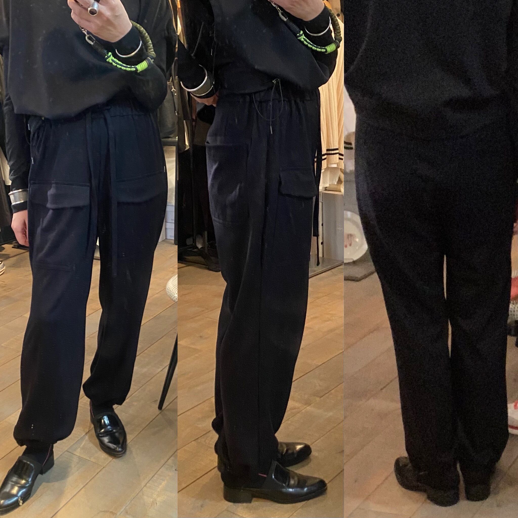 ウエストにゴムベルトと調整紐を内蔵したストレートカーゴパンツ。くるぶしぐらいの着丈、開きはなくスポッと履く形です。ウエスト、ヒップにゆとりがあり、裾の窄まりをゴムで調節できます。前見頃両サイドフラップパッチポケット、後ろ見頃両サイドパッチポケット付きです。ワイドすぎないスッキリとしたシルエットです。