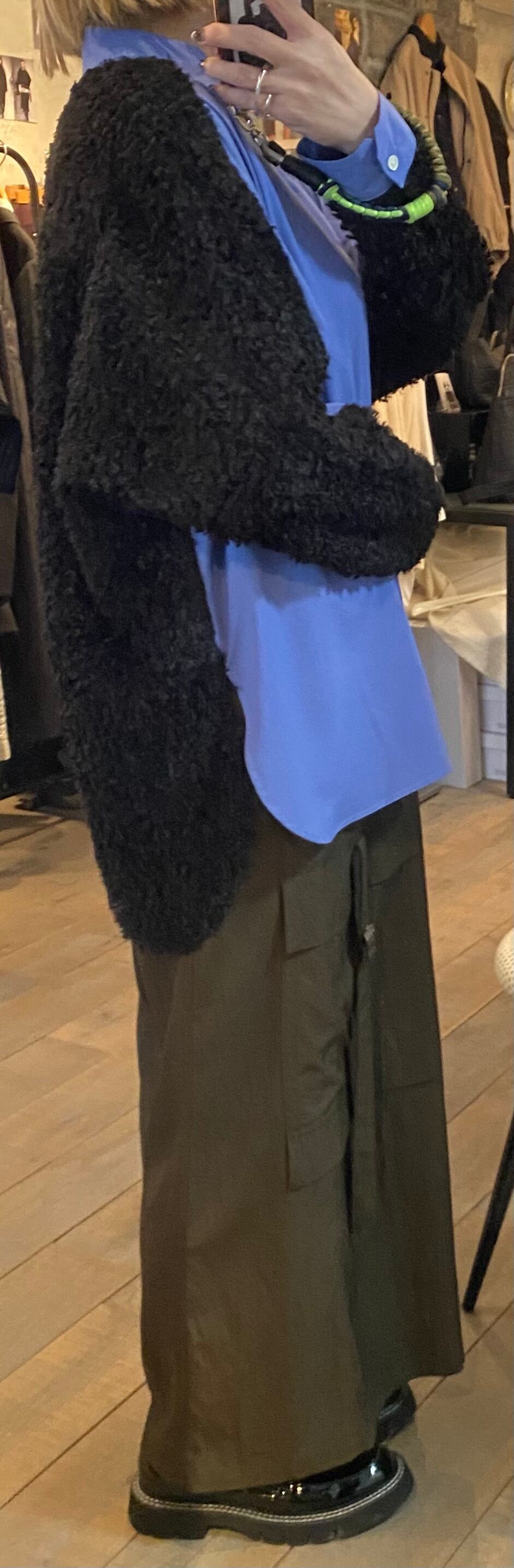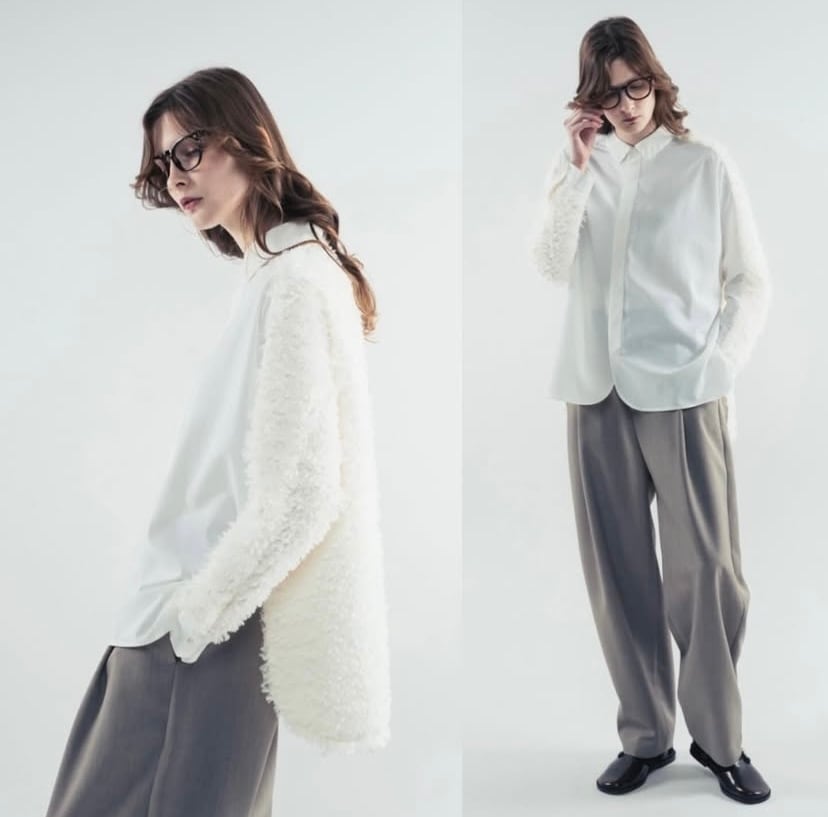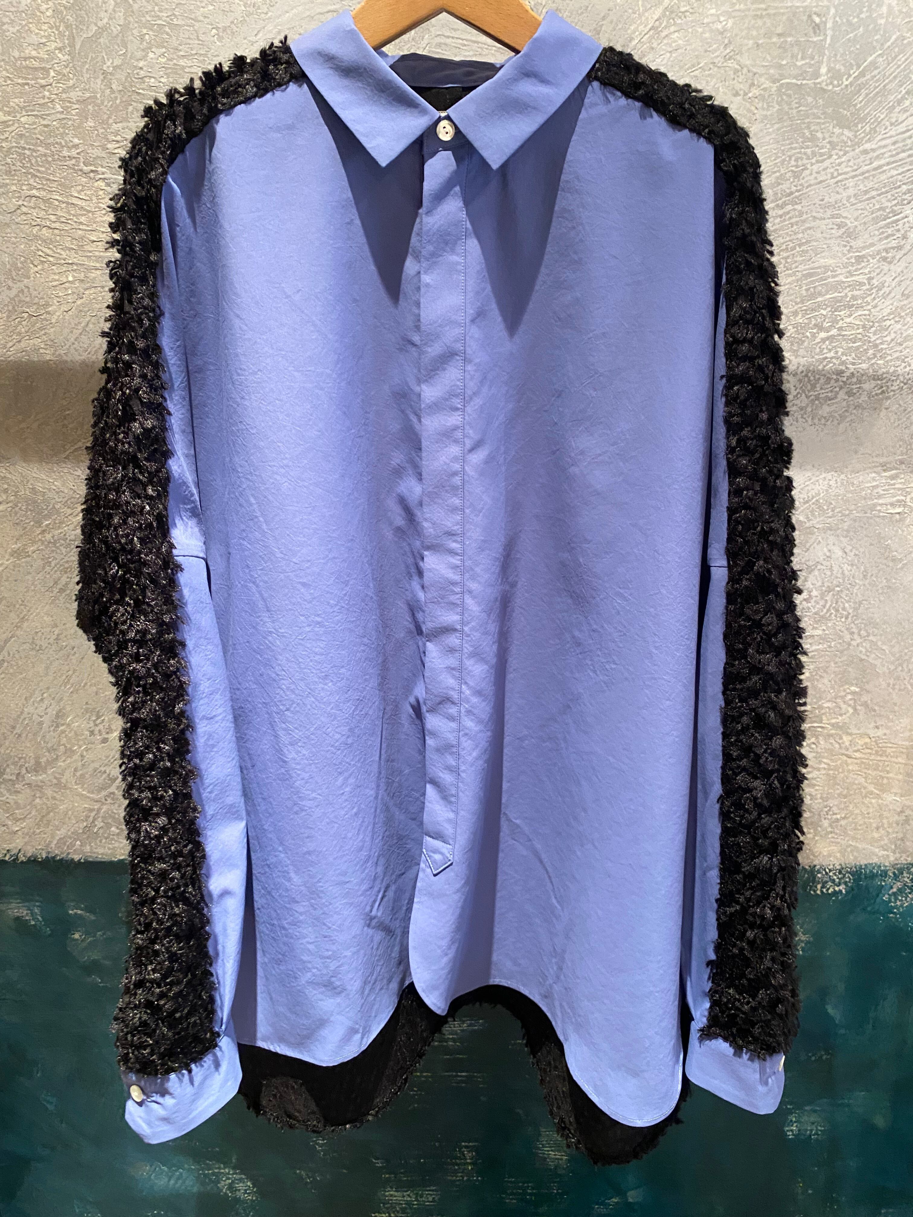メンズライクなタイプライターとプードルのような毛足がフェミニンな印象を与えるカットジャガードという2種類の素材を使用したオーバーシルエットのスペシャルシャツ。ボタンを隠した比翼仕様に美しいカーブを描いたヘムライン、肩のラインを美しく見せるカッティング技術が特徴的な、シーズンを通して活躍するアイテムです。サイズ3はユニセックスで着用可能。