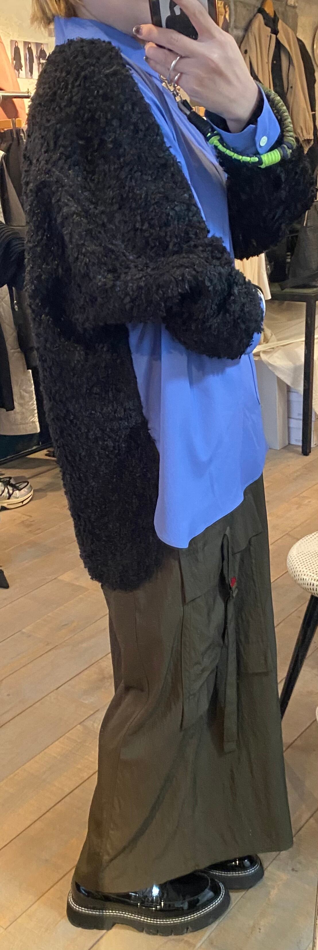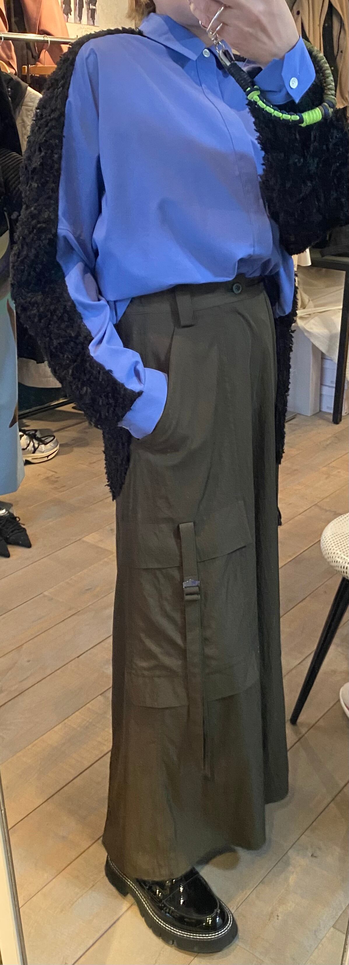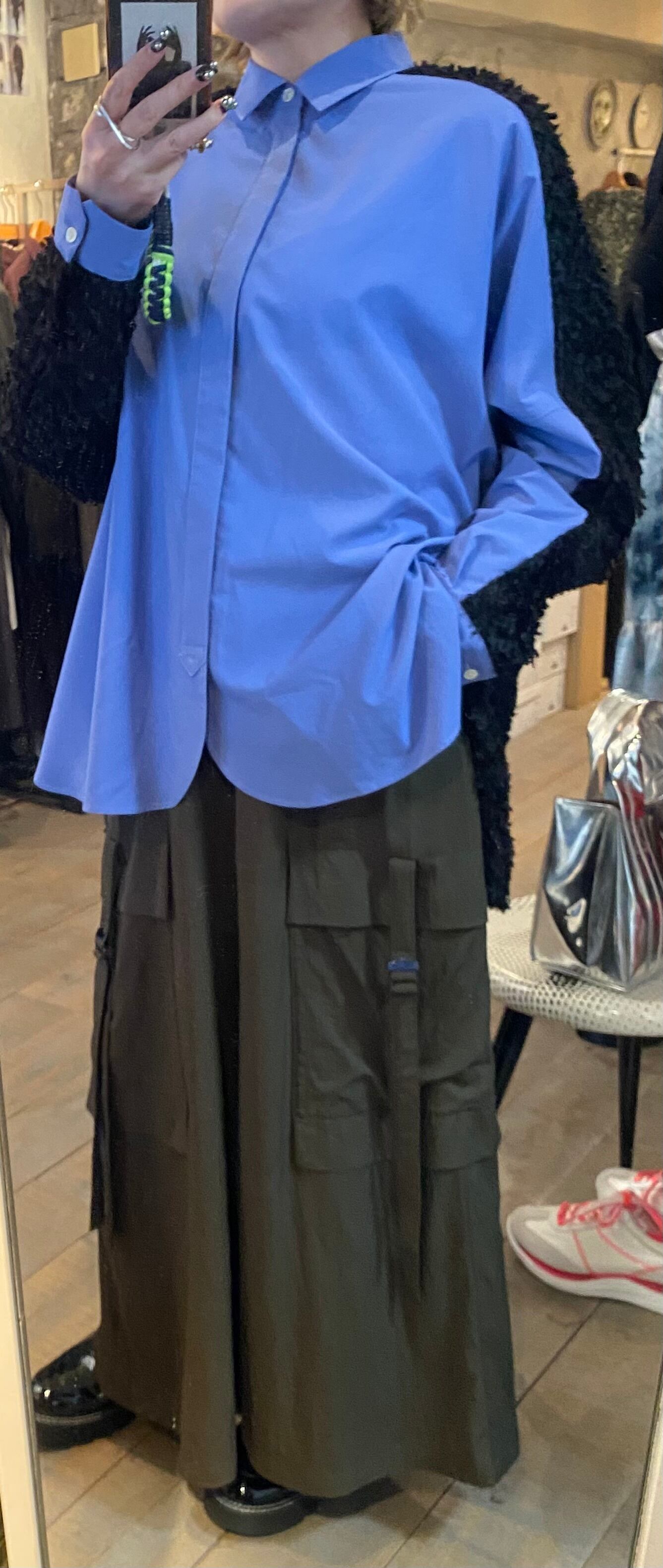 メンズライクなタイプライターとプードルのような毛足がフェミニンな印象を与えるカットジャガードという2種類の素材を使用したオーバーシルエットのスペシャルシャツ。ボタンを隠した比翼仕様に美しいカーブを描いたヘムライン、肩のラインを美しく見せるカッティング技術が特徴的な、シーズンを通して活躍するアイテムです。サイズ3はユニセックスで着用可能。
