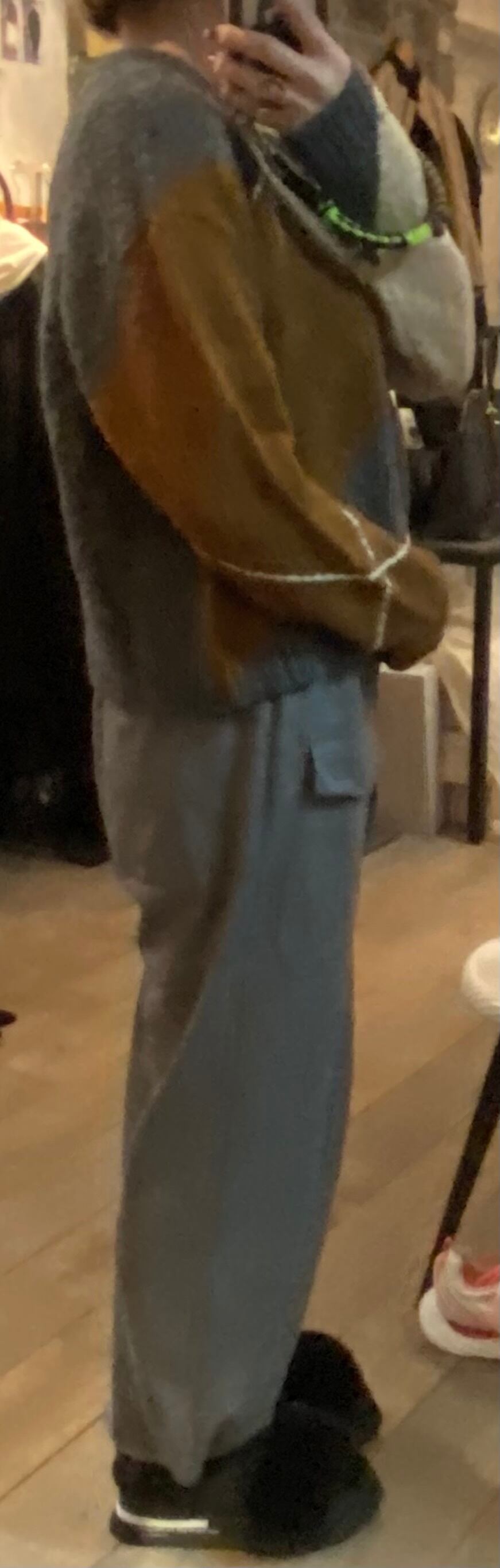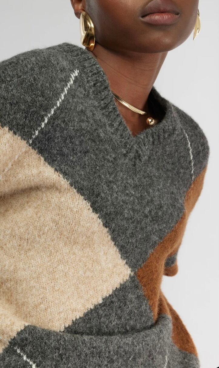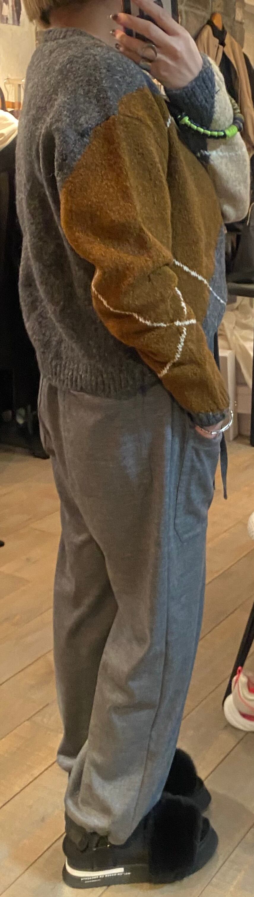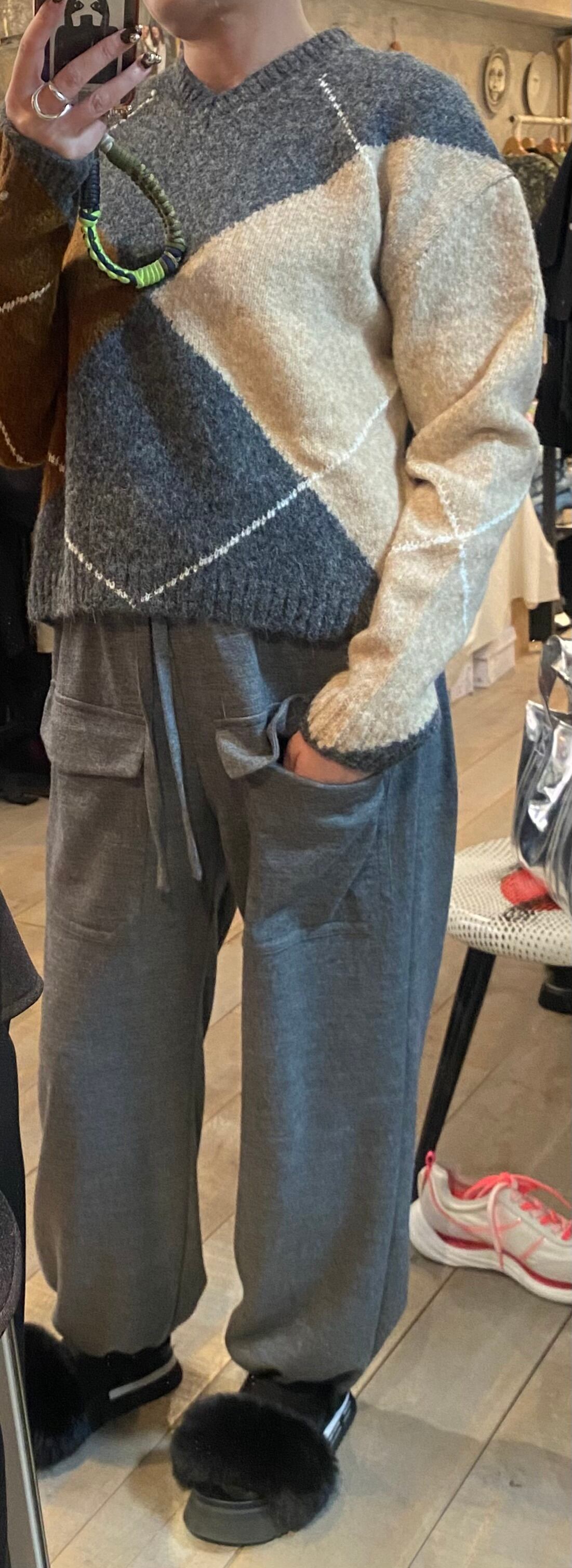 グレーベースにブラウン系でまとまったアーガイルニット。オーバーすぎず程よいゆとり感でサラッと着るだけでスタイリングの完結するニット。