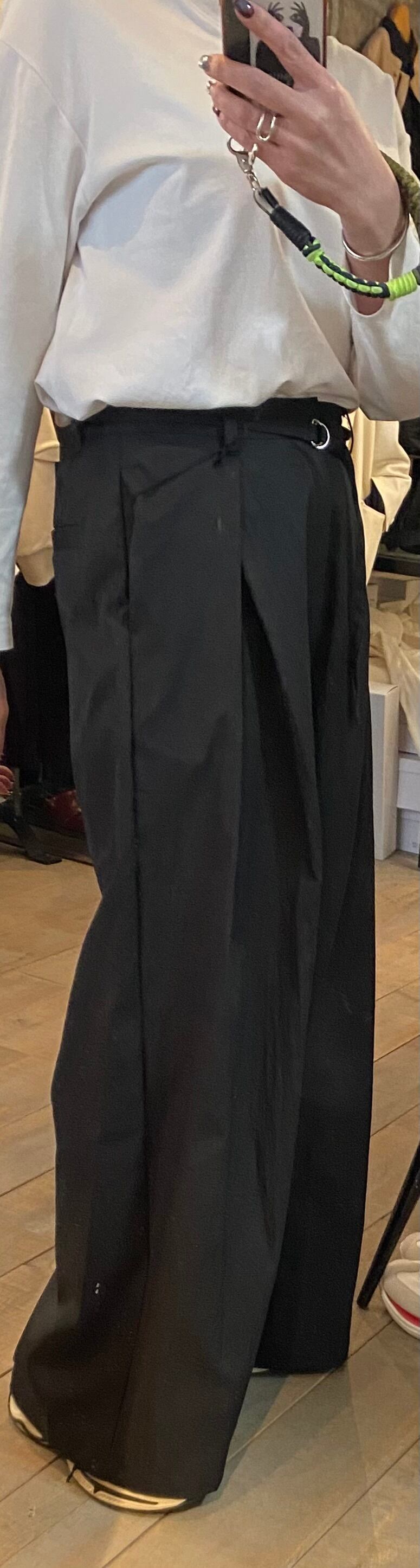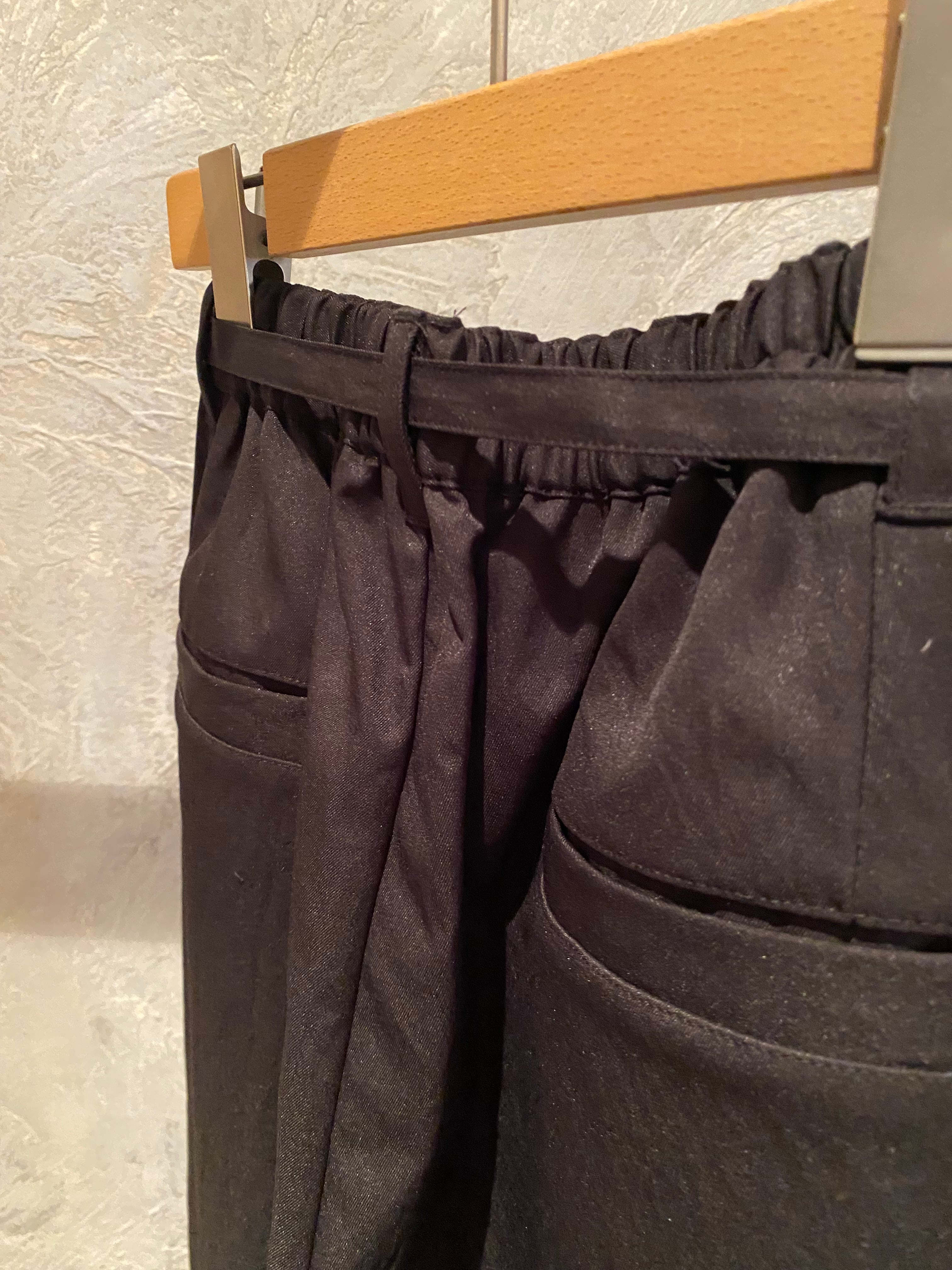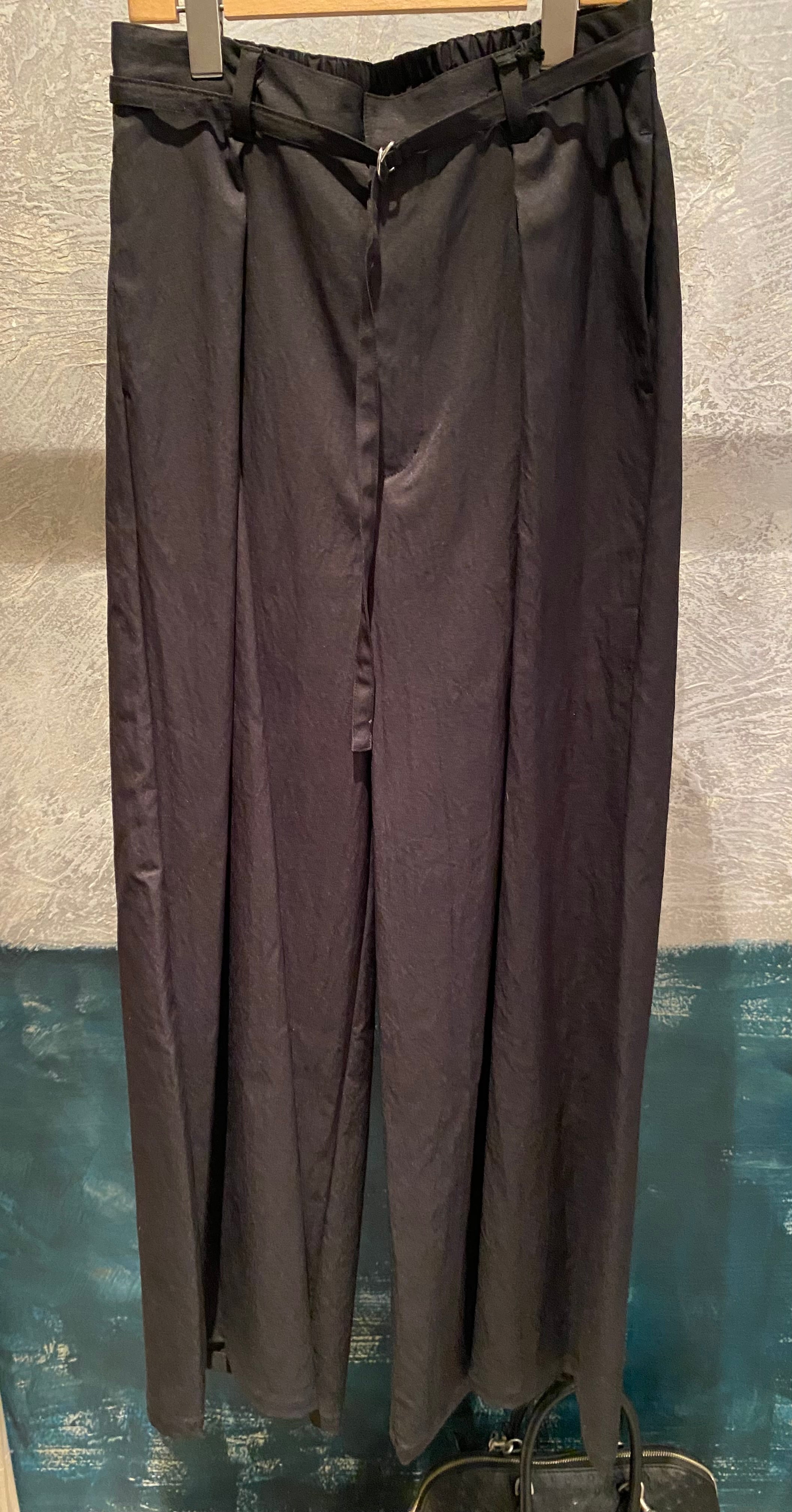 タックの入ったフレアワイドパンツは、オチ感もありワイドですがスッキリ見えします。ウエストの後ろ側がゴム仕様で楽にはいて頂け、共布のベルトの調節でジャストウエストではいて頂くのも、少し腰履きで履くのも◎オールシーズン着回せます。ユニセックスのブランドで着丈は少し長いので164㌢の身長で2を着用の場合3㌢程の丈つめで対応。