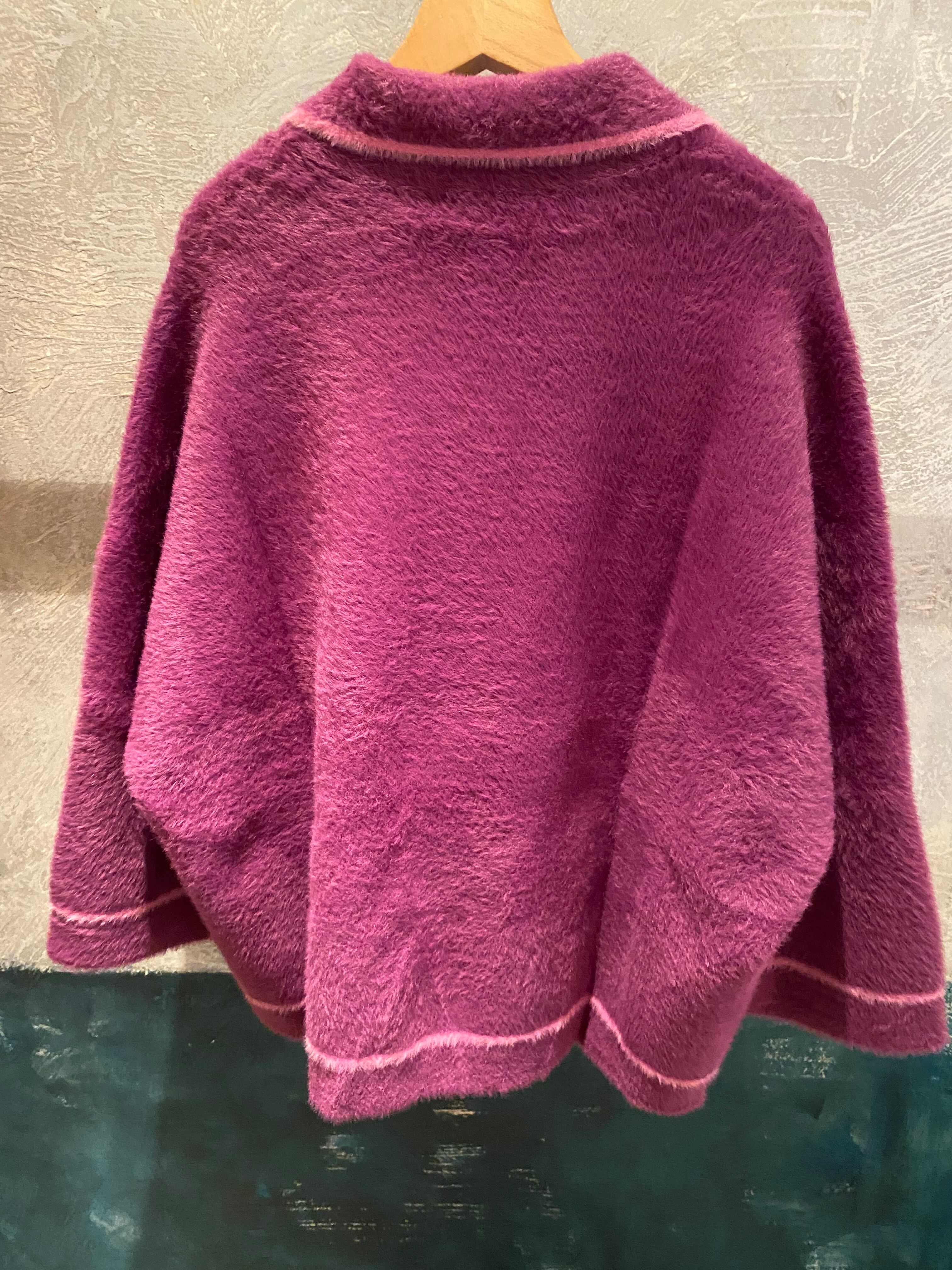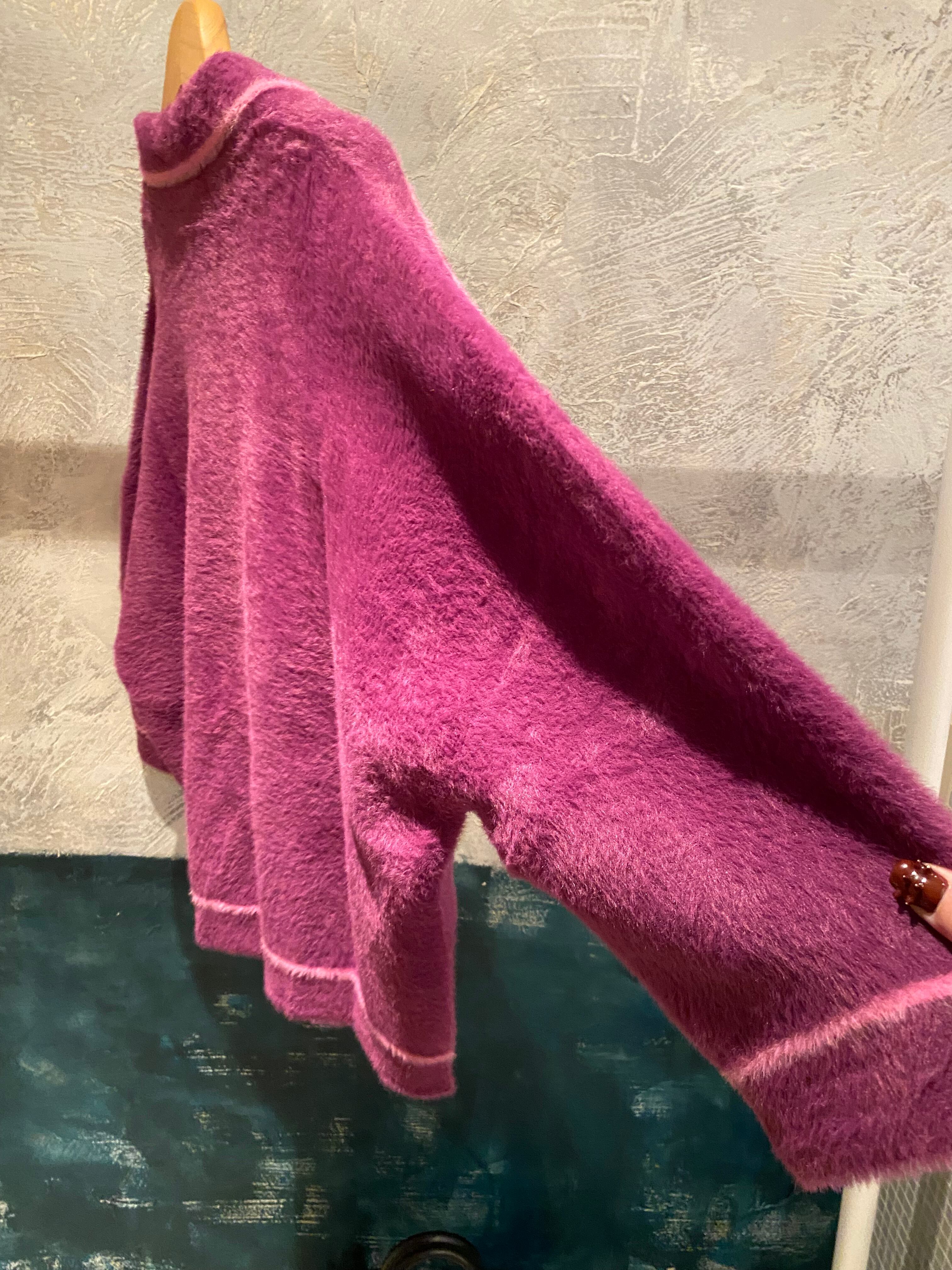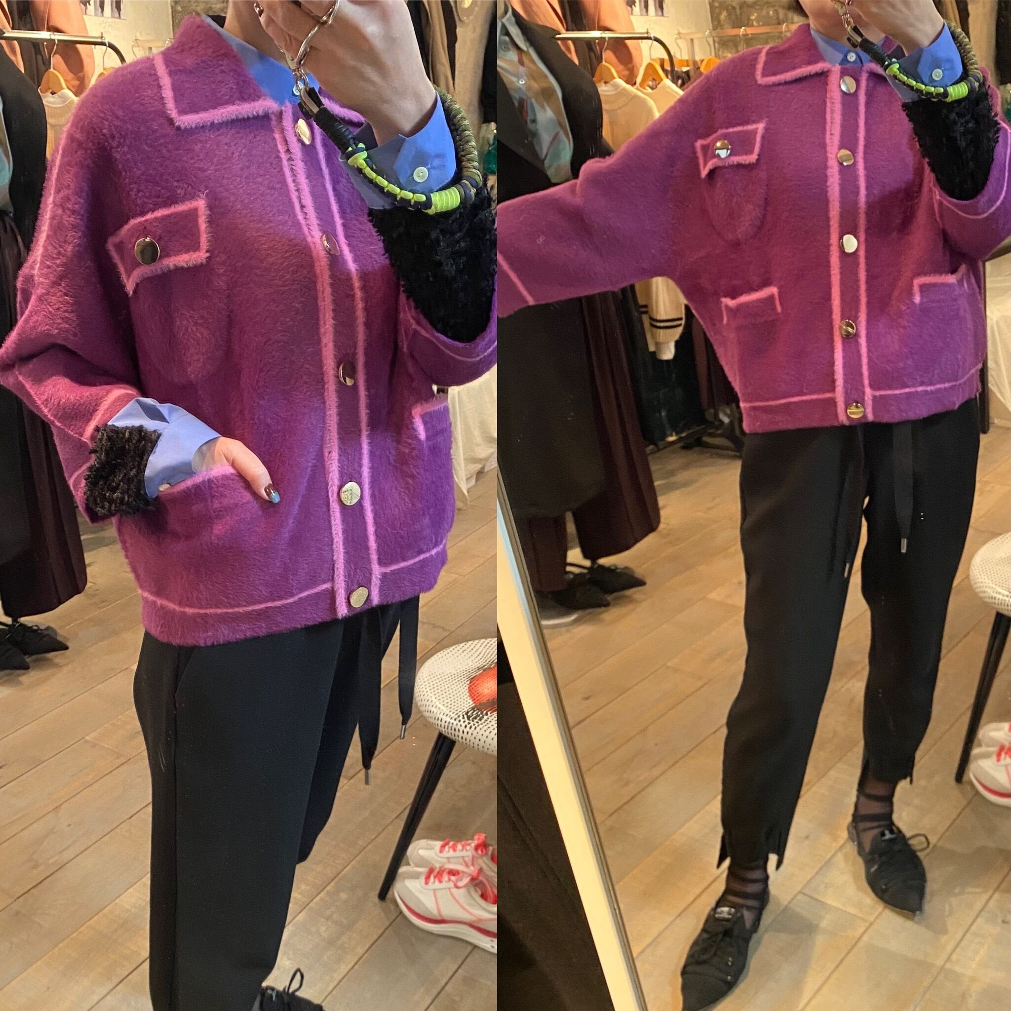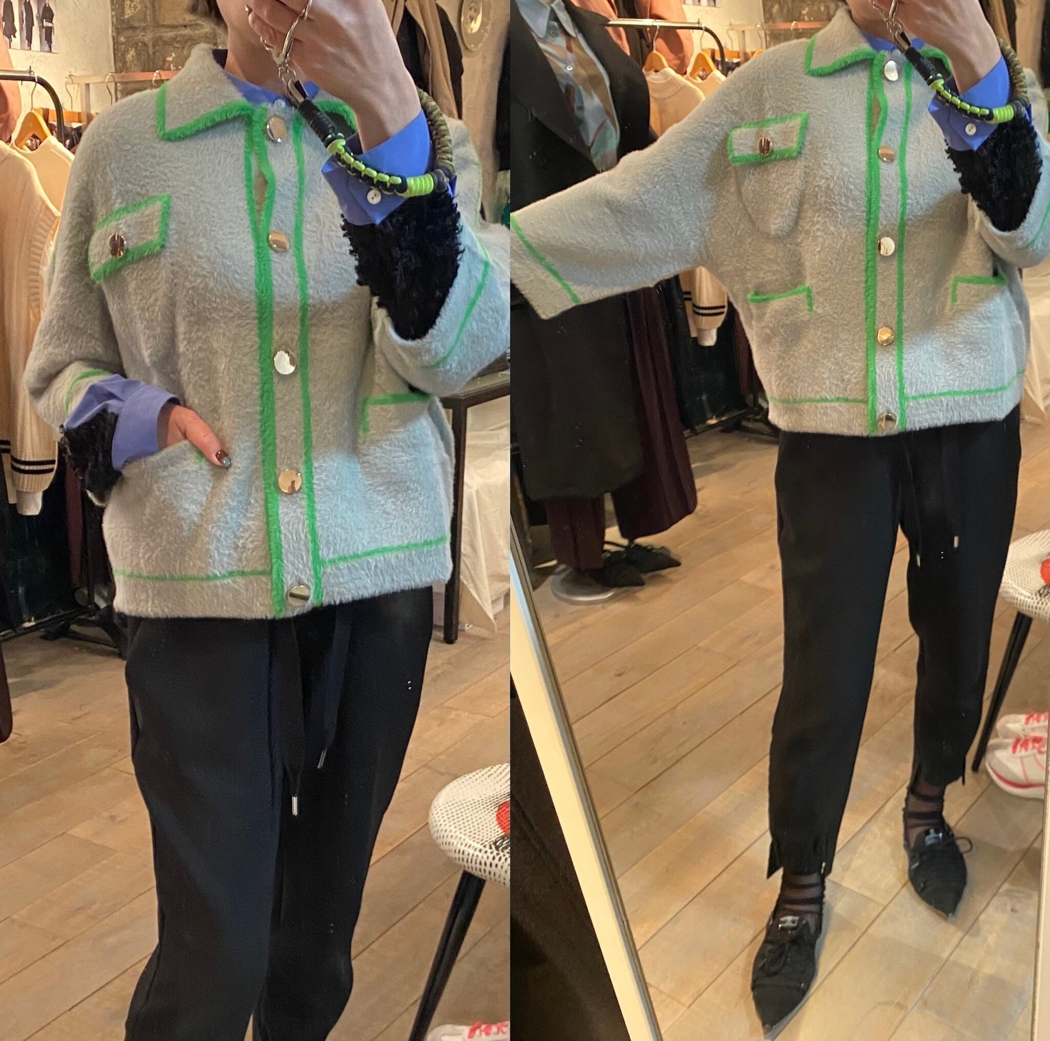 シャギーの風合いが可愛いニットジャケット。配色でトリミングされたデザインがポイント。7.8部丈のお袖が重たい印象にならずバランスのとりやすいアイテムです♪どちらの配色もとても素敵です。アウターの下でもかさばらない程の肉厚さとオーバー具合です。