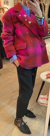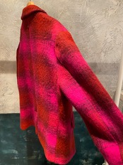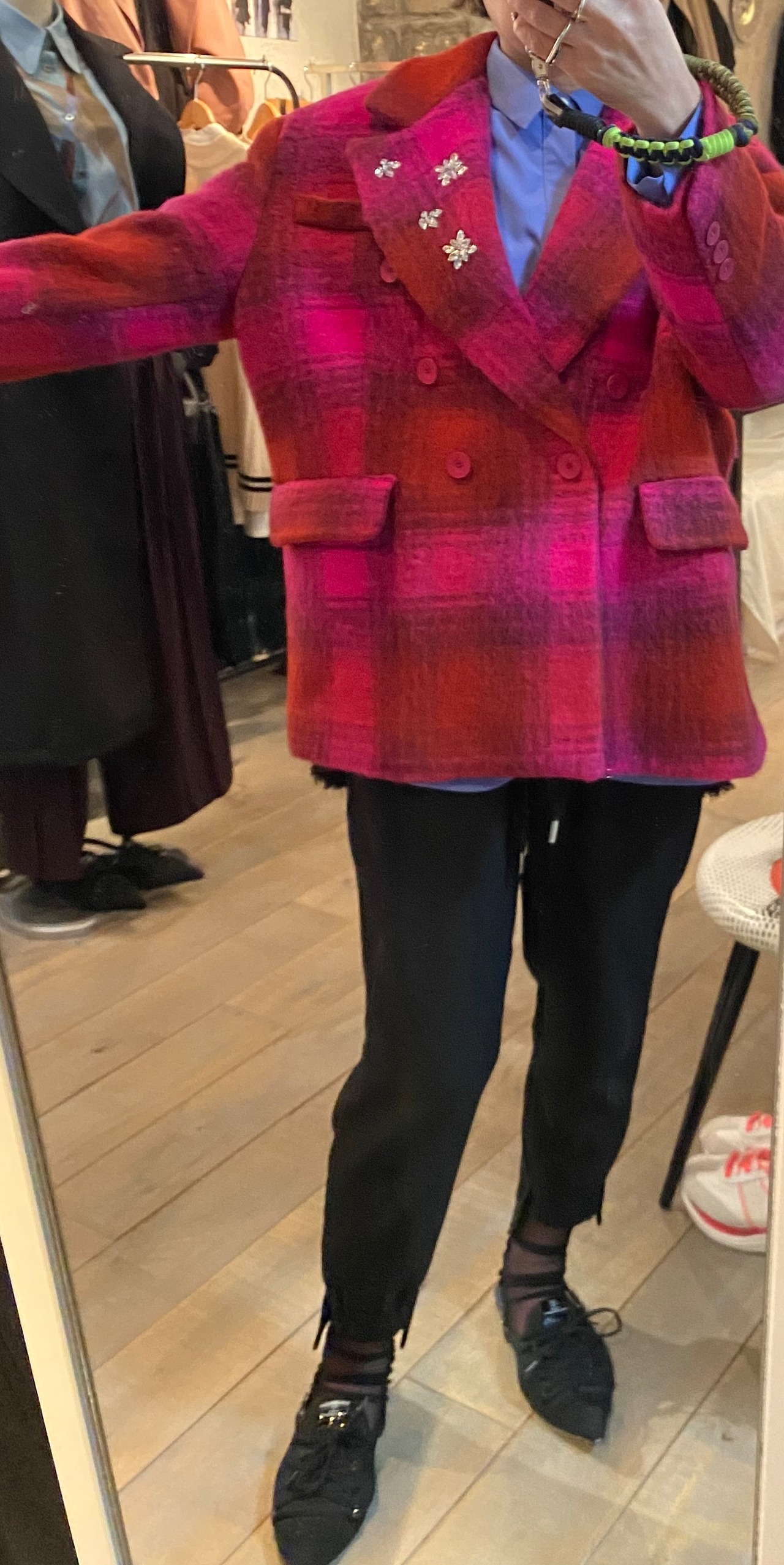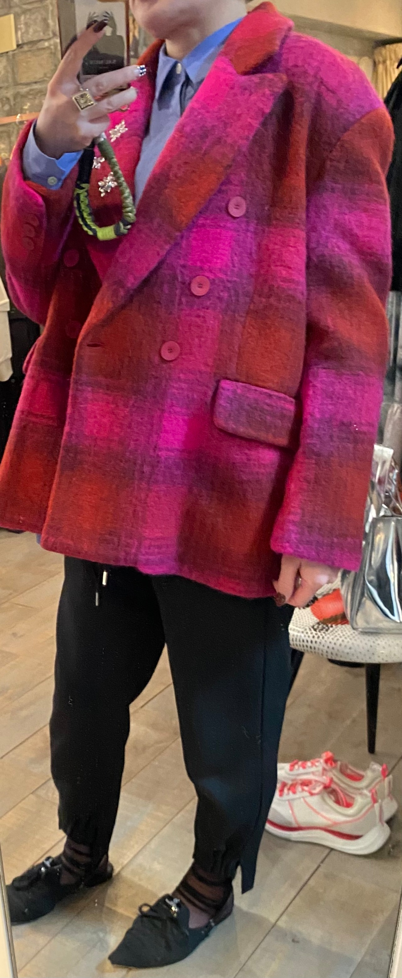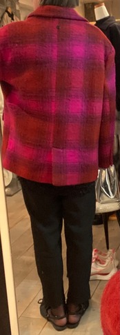 カラーバランスの綺麗なチェックのジャケットコート。オーバーシルエットが古臭くならず、丈感も着回し力抜群。襟元のさりげないビジューがポイントに。軽くて暖かくパッと羽織りやすいです。