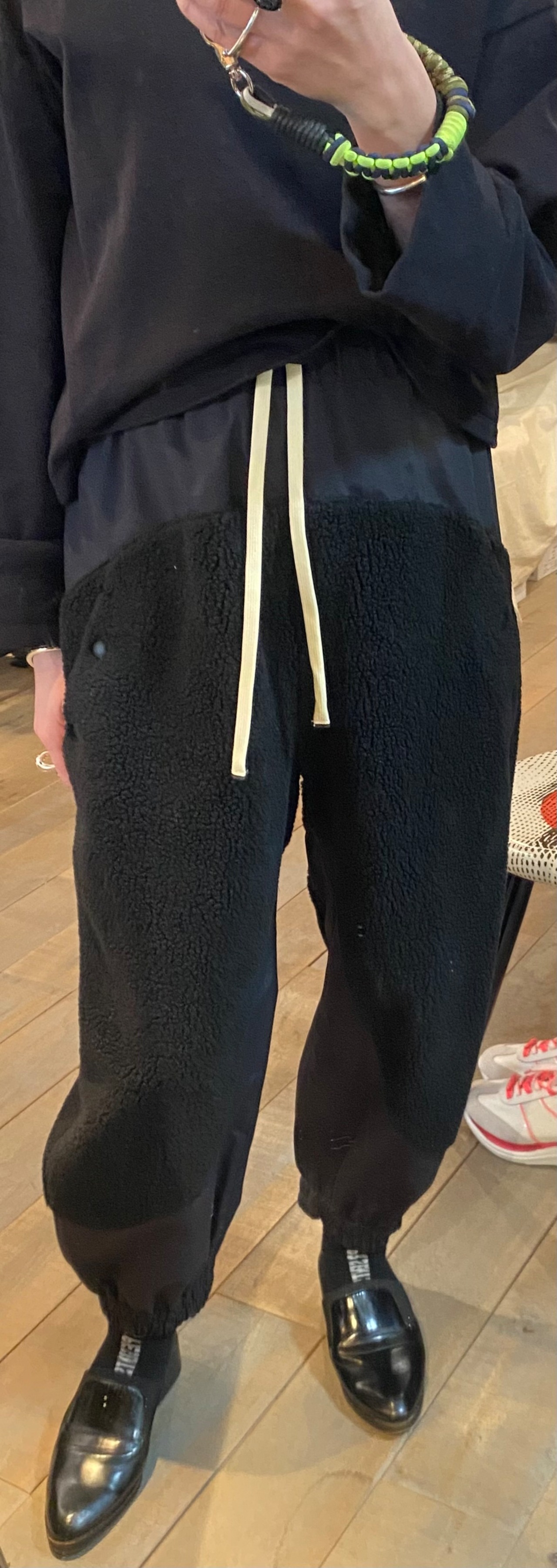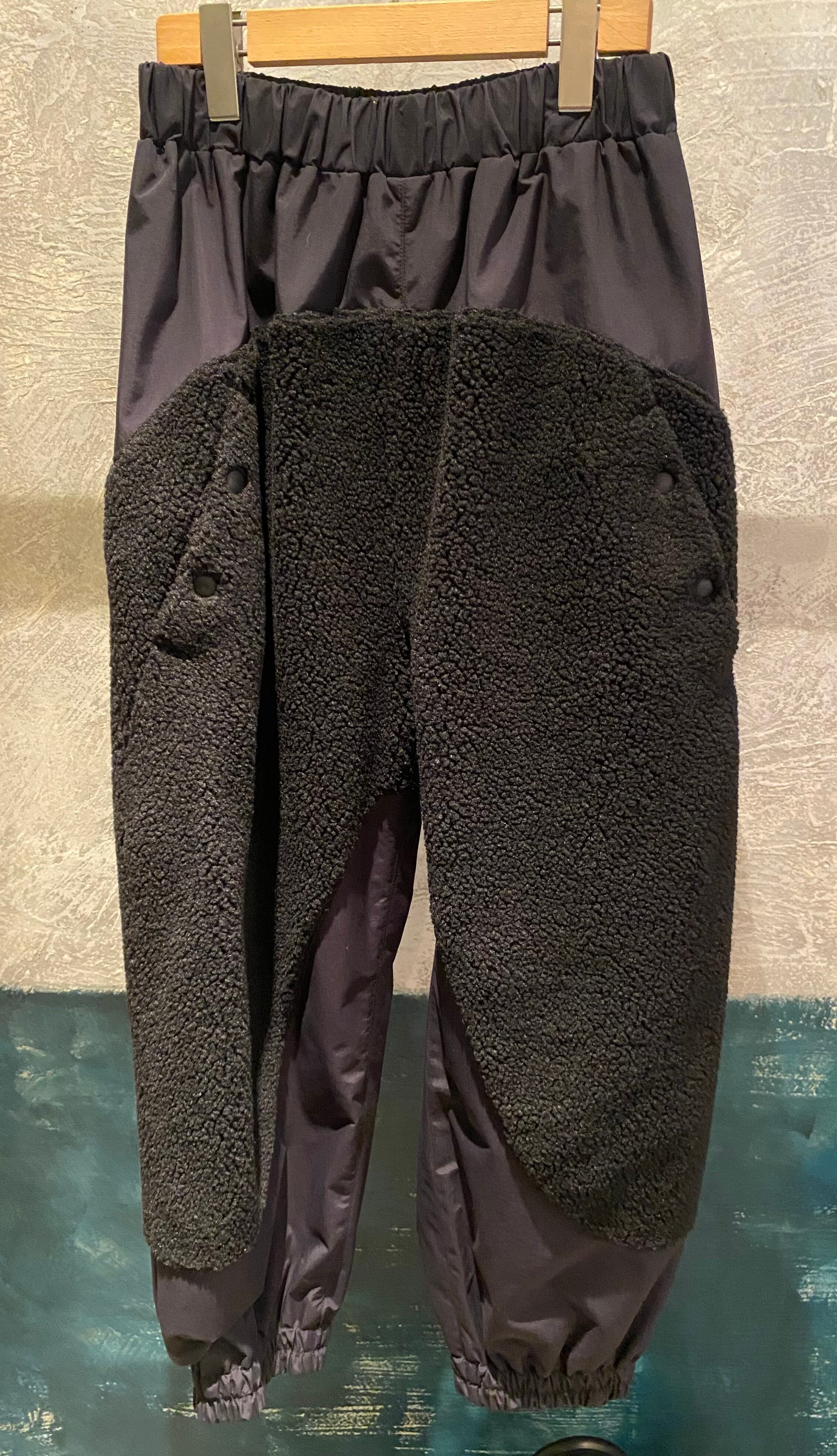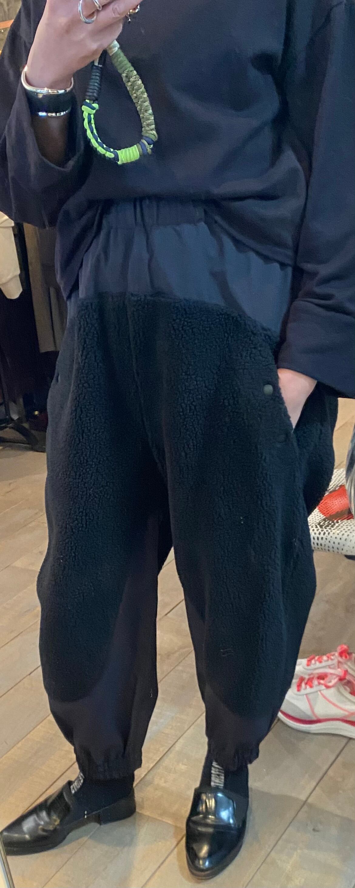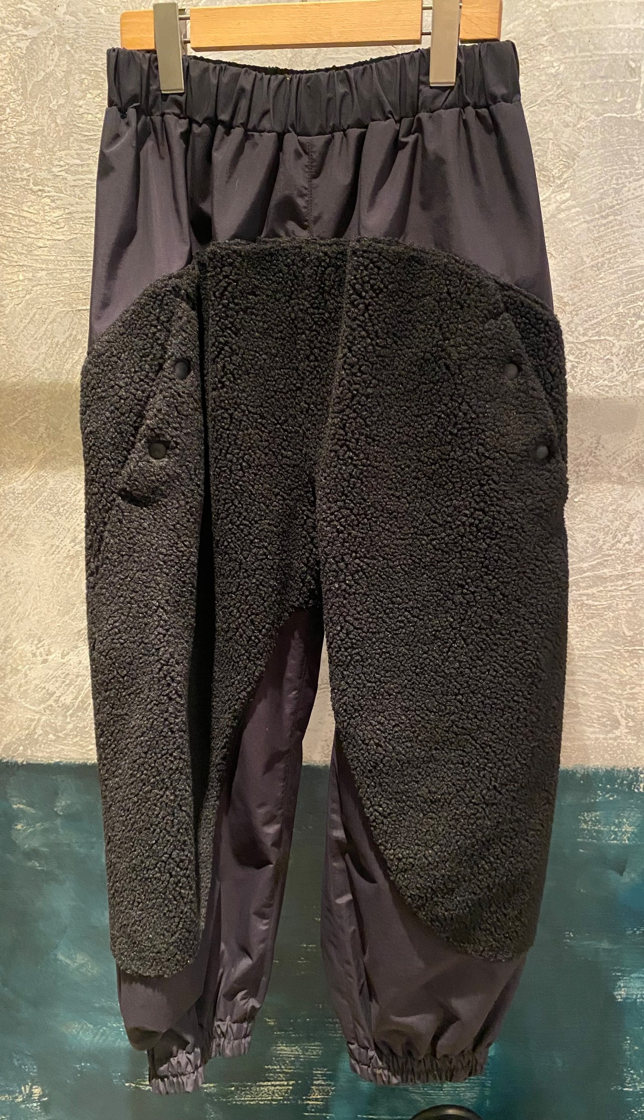 ボリュームのあるボア部分を中心に配置し、ウエスト部分と裾部分はスッキリと着用できるようにナイロン素材を使用しています。冬には手放せないパンツとしてオススメです。