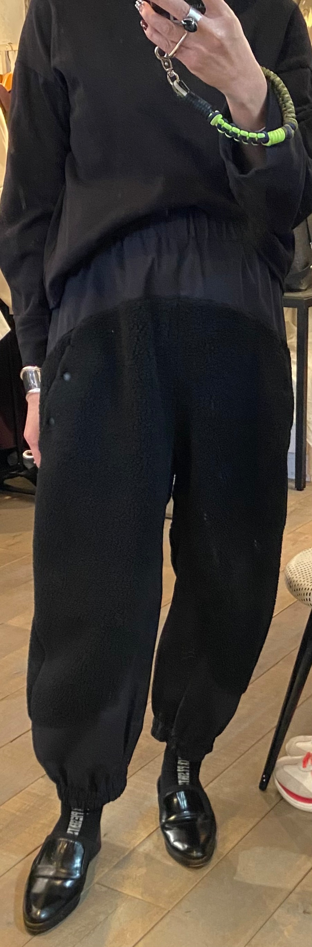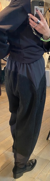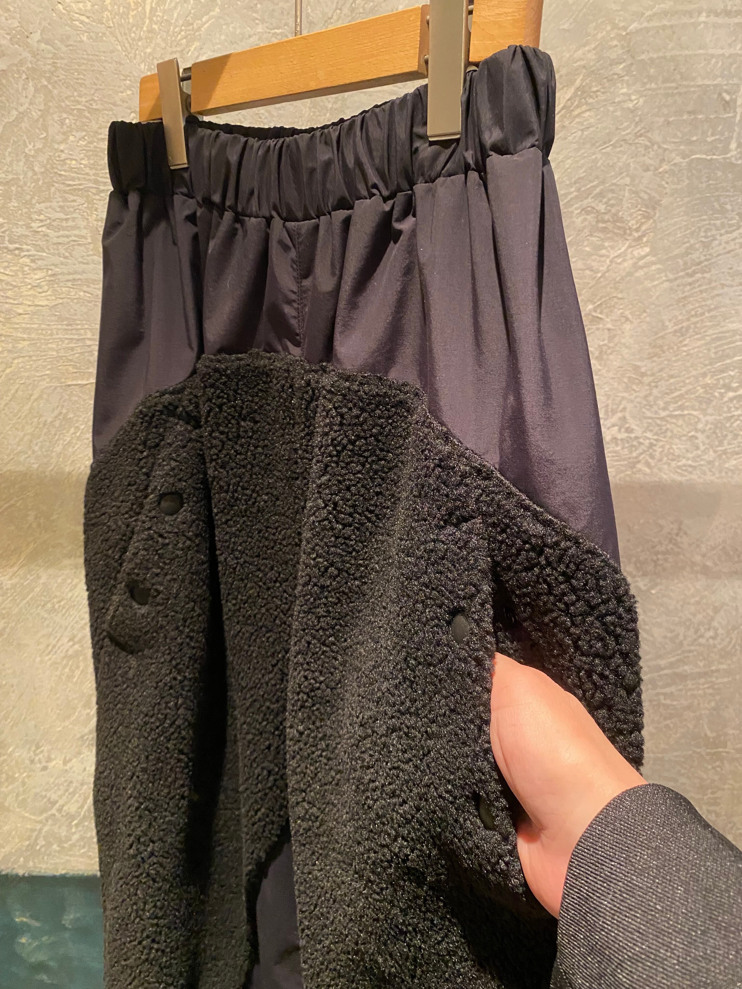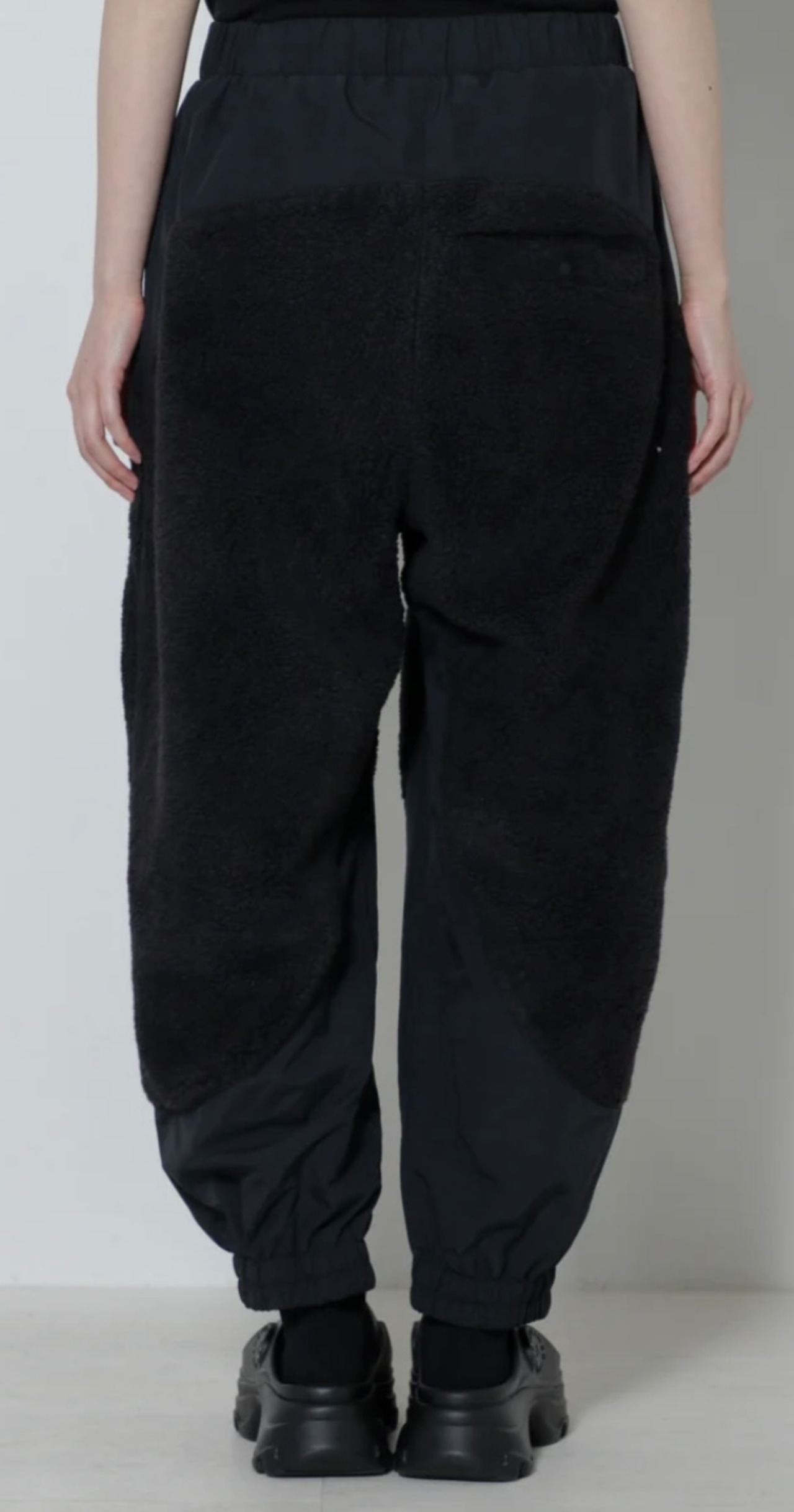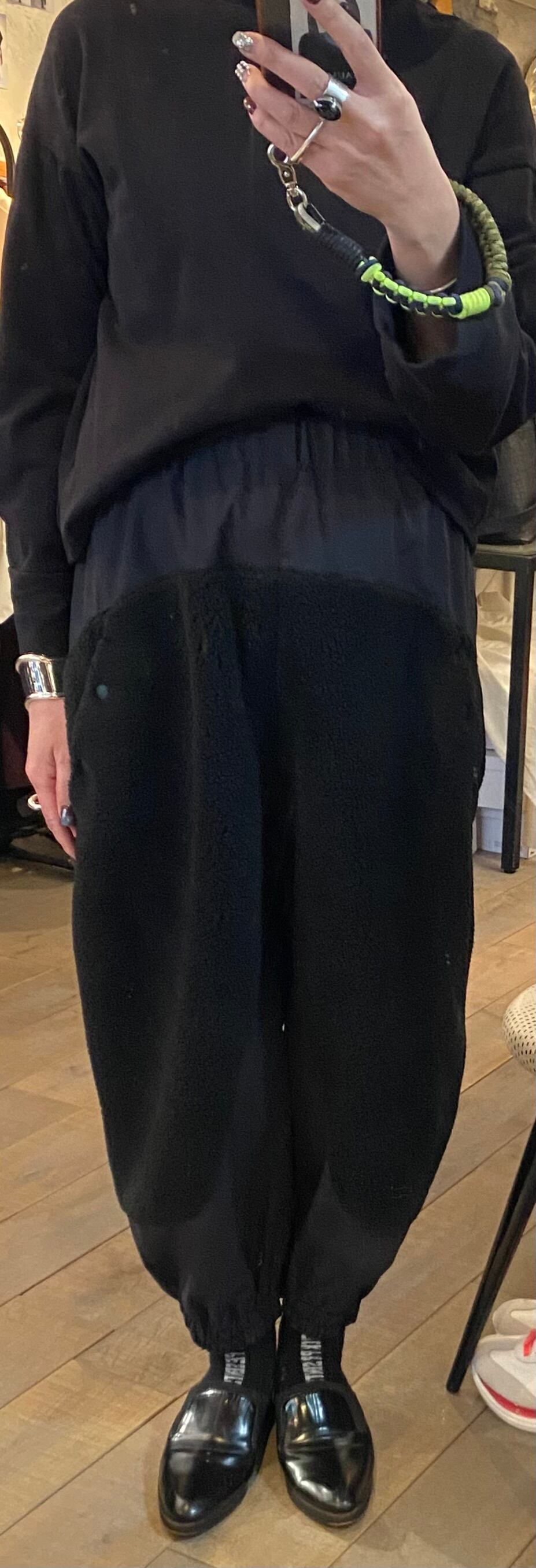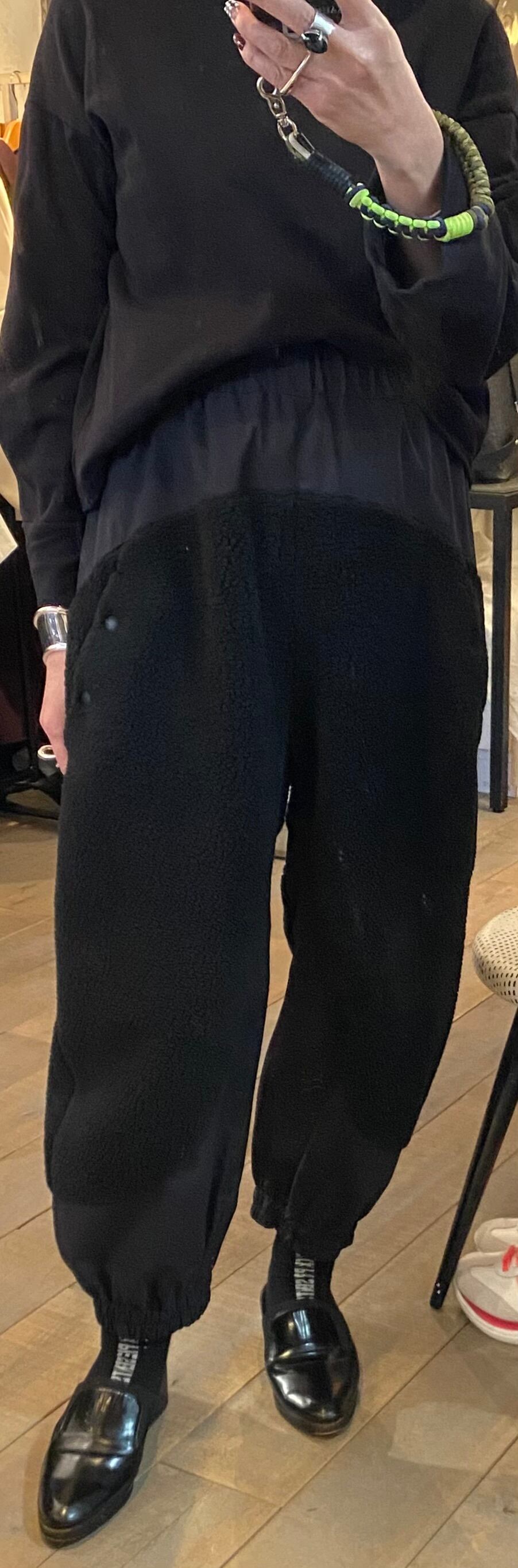 ボリュームのあるボア部分を中心に配置し、ウエスト部分と裾部分はスッキリと着用できるようにナイロン素材を使用しています。冬には手放せないパンツとしてオススメです。