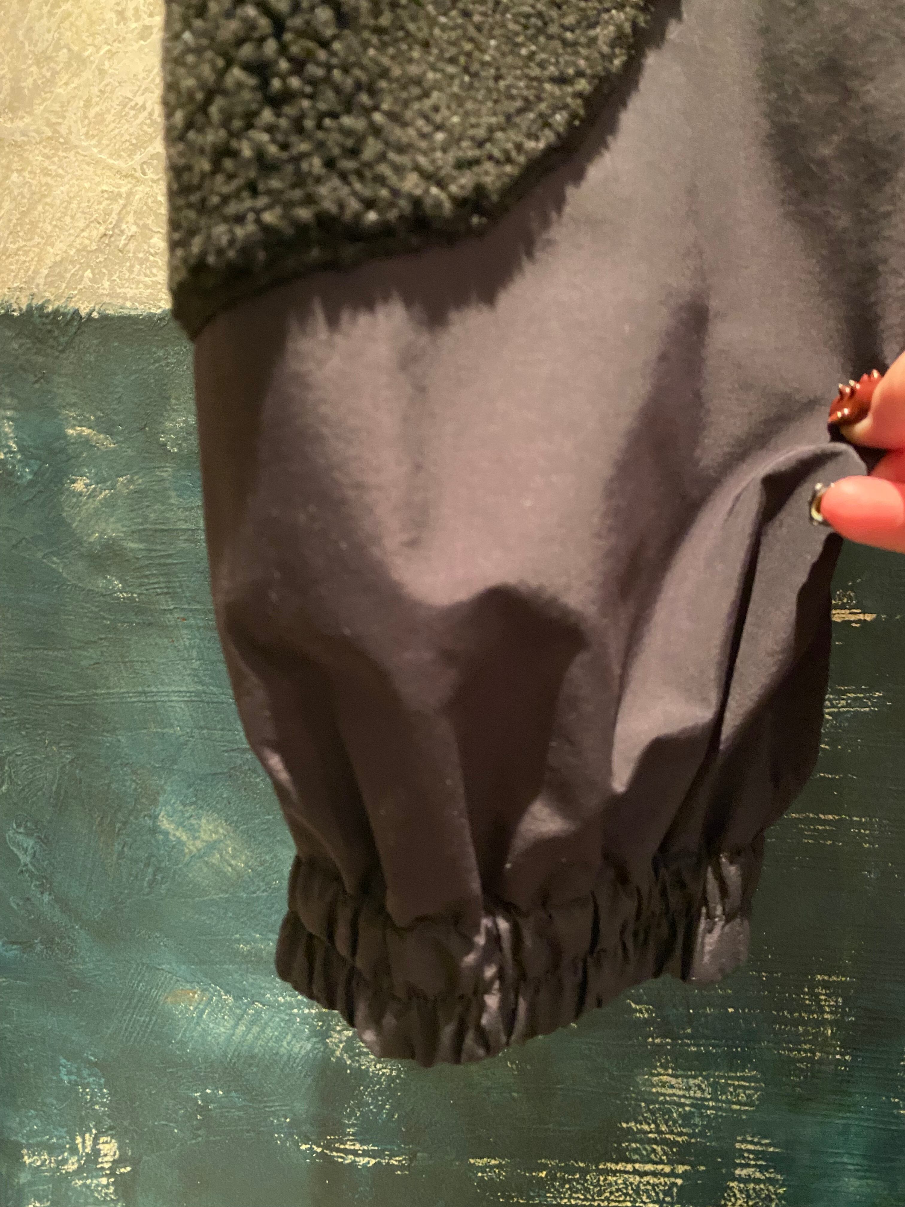 ボア素材とラミネート加工が施されたナイロン素材のコンビネーションのパンツ。