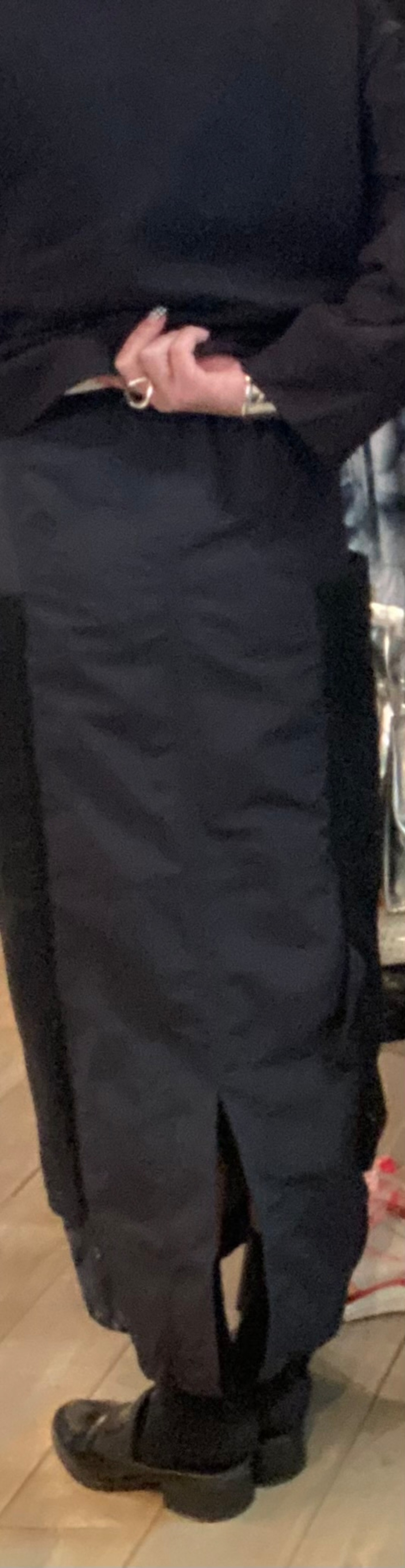 ボア素材とラミネート加工が施されたナイロン素材のコンビネーションのスカート。
