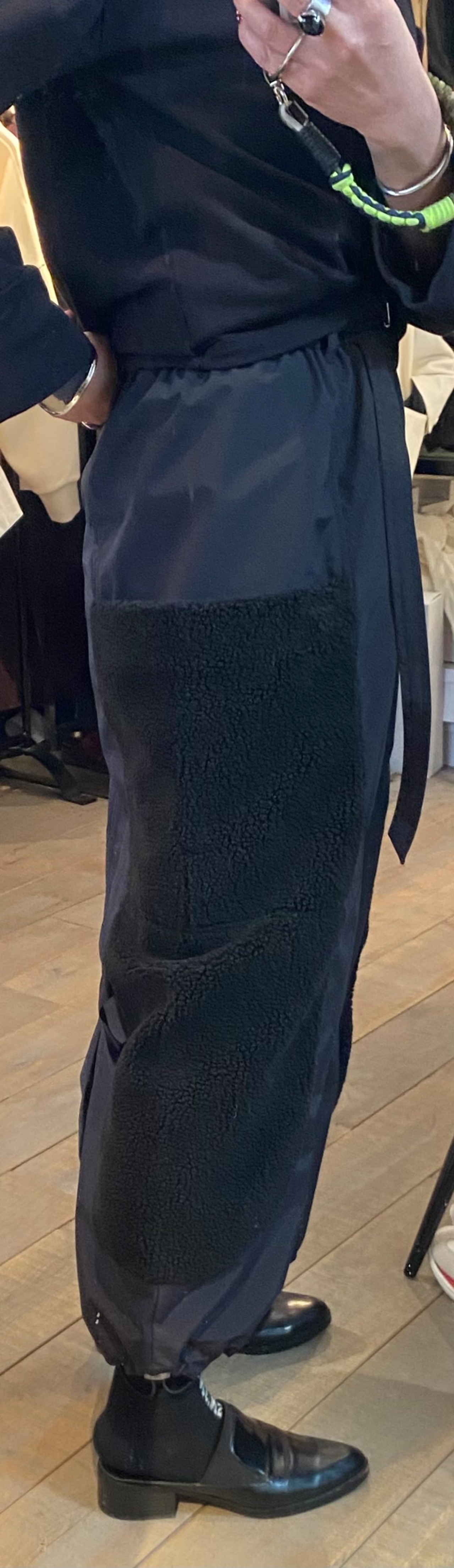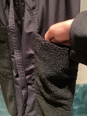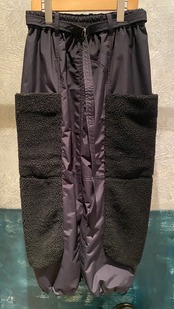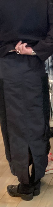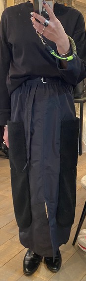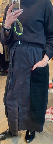 ボアを両サイドの広範囲に施していますが、丸みが出ないように設計しているのでスッキリとしたシルエットで着用頂くことができます。長く伸びたウエストベルトもポイントです。裾に内蔵されたドローコードでシルエットの変化を楽しんで頂けます♪これからの冬の季節の主役スカート。