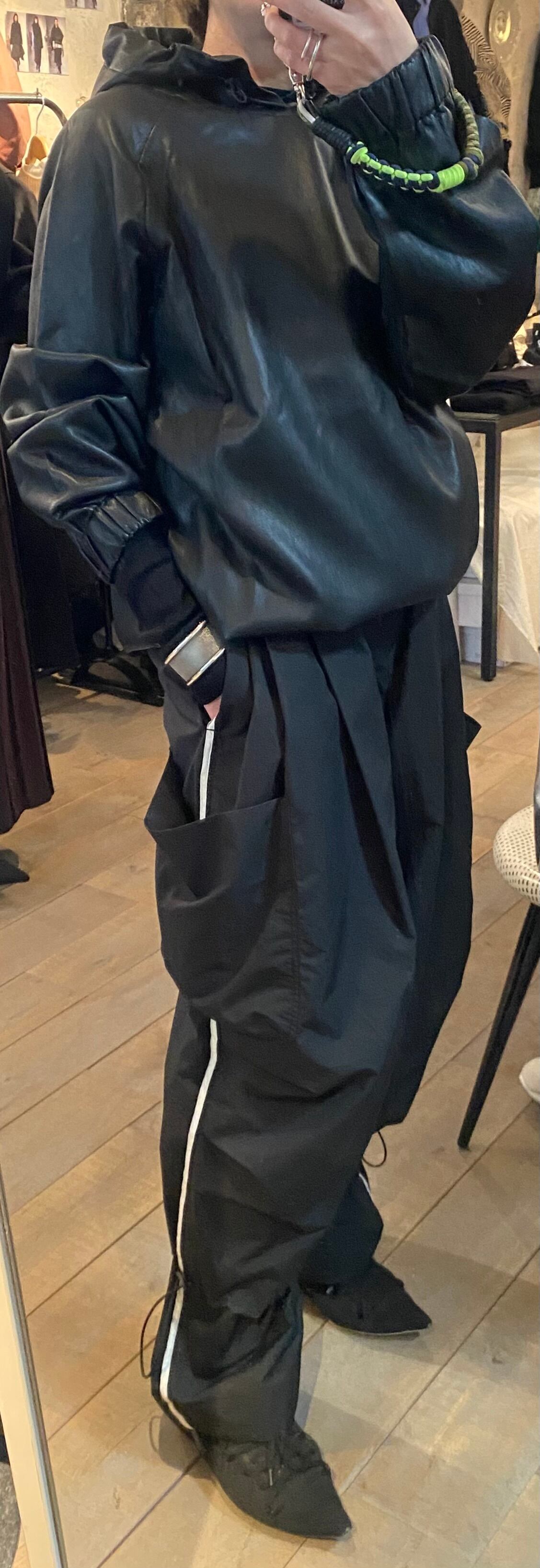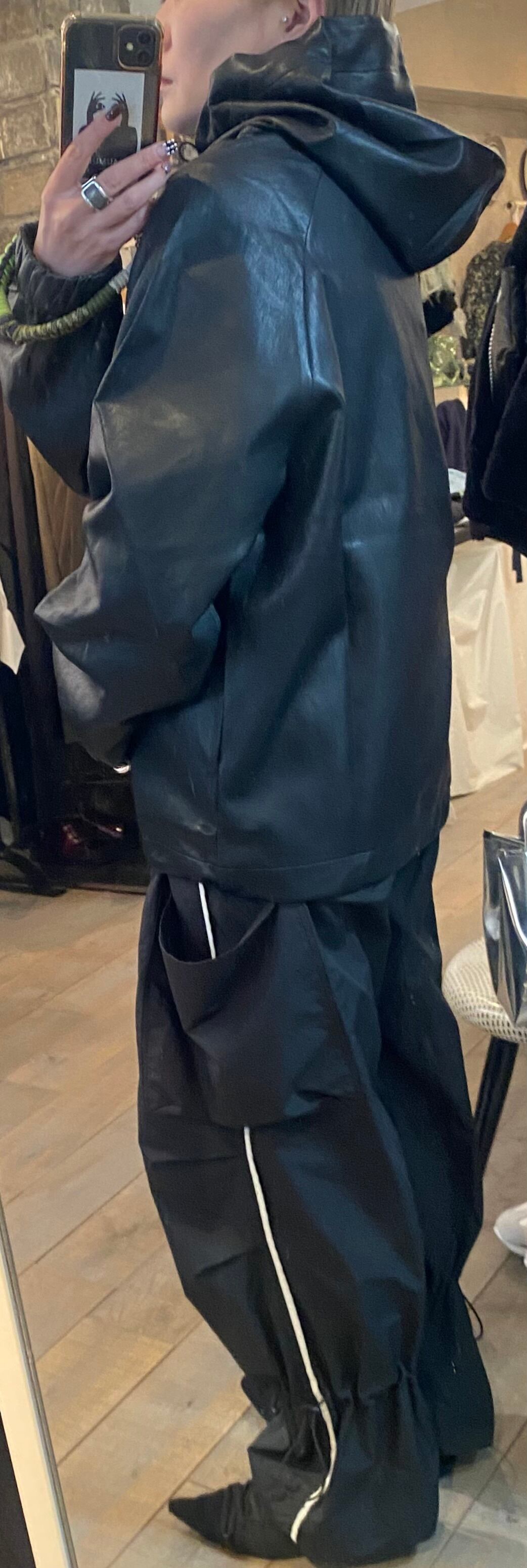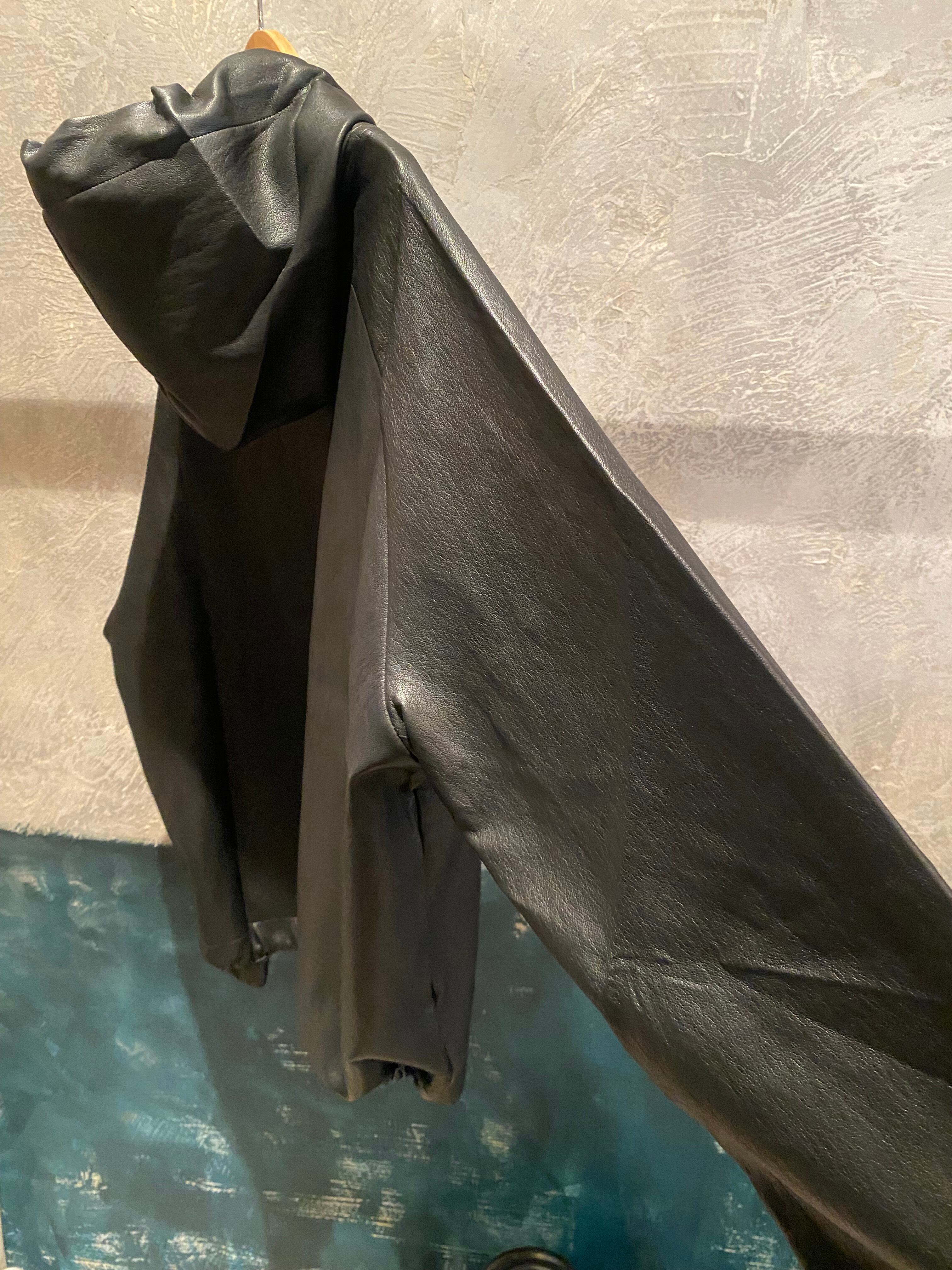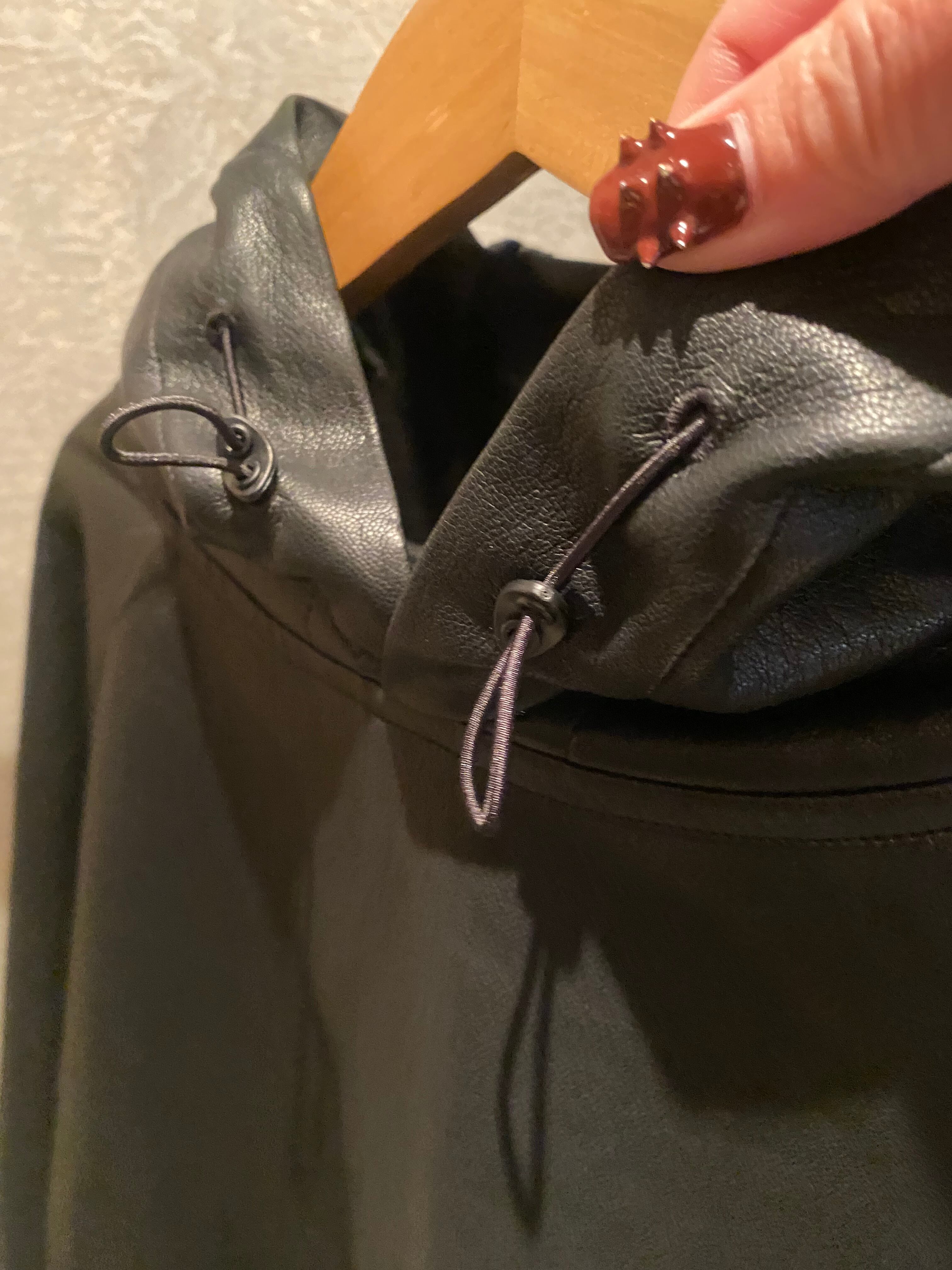 ヒップが隠れるほどの着丈のフーディプルオーバーも同じくフード部分と裾にドローコードが内蔵されているのでシルエットの変化を楽しんで頂けます。マットな質感のフェイクレザーでハードなイメージになりにくく上品に着こなして頂けます。ロングシーズン着回せイージーケアなのも嬉しいところ。