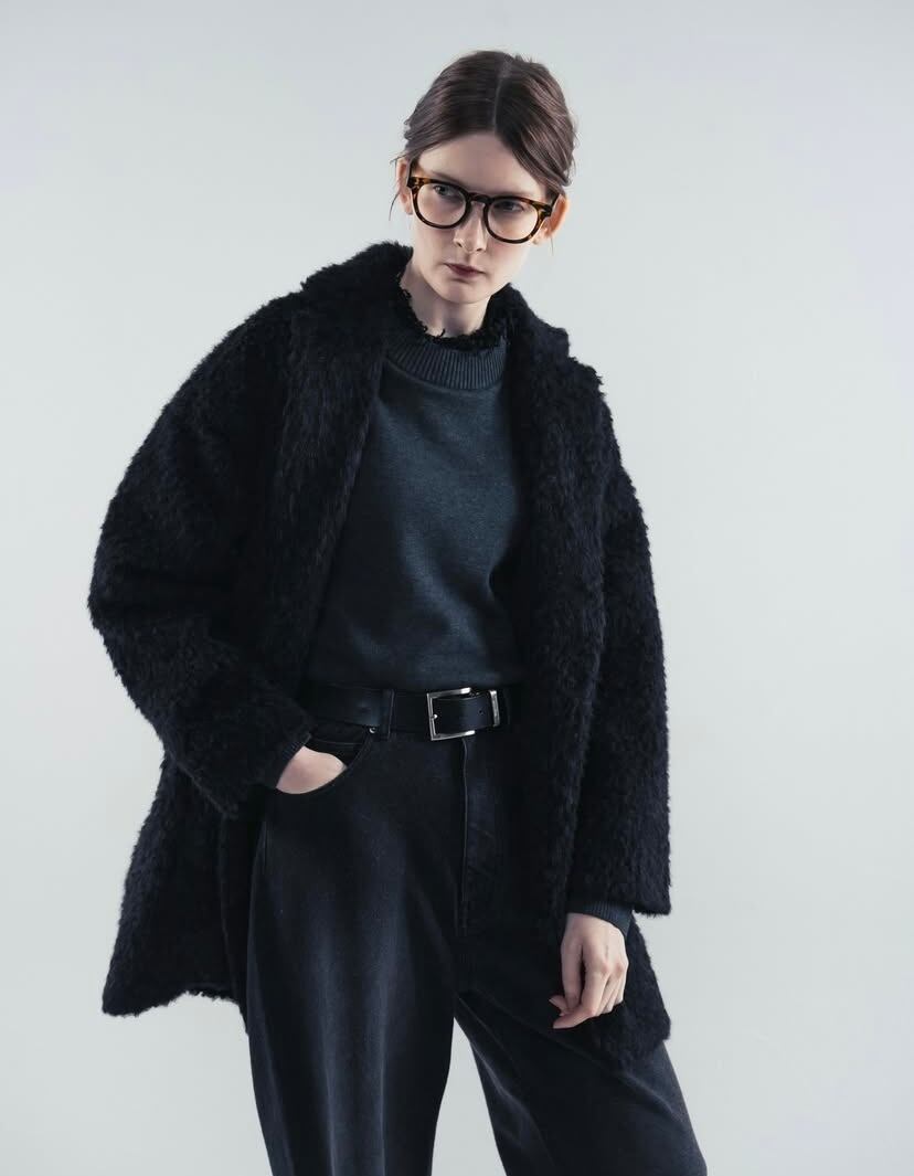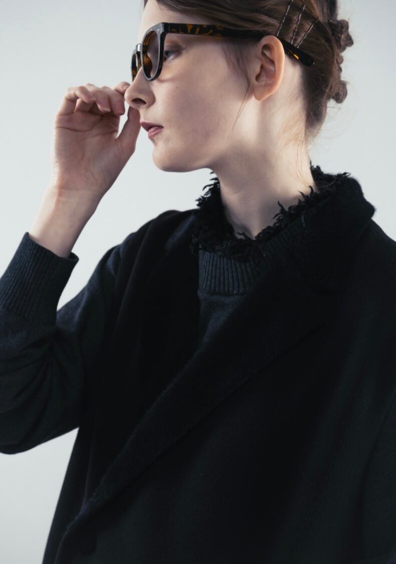 素材の表側にハイマルチフィラメントのポリエステル、裏側にはカチオンスパンPLで編み上げ、更に表面をニードルパンチで混ぜ合わせることで肌触りの柔らかな風合いと豊かな膨らみを表現している生地を使用したノーカラーロングコート。肩から袖にかけての美しく、滑らかなラインは、アームホールを無くした贅