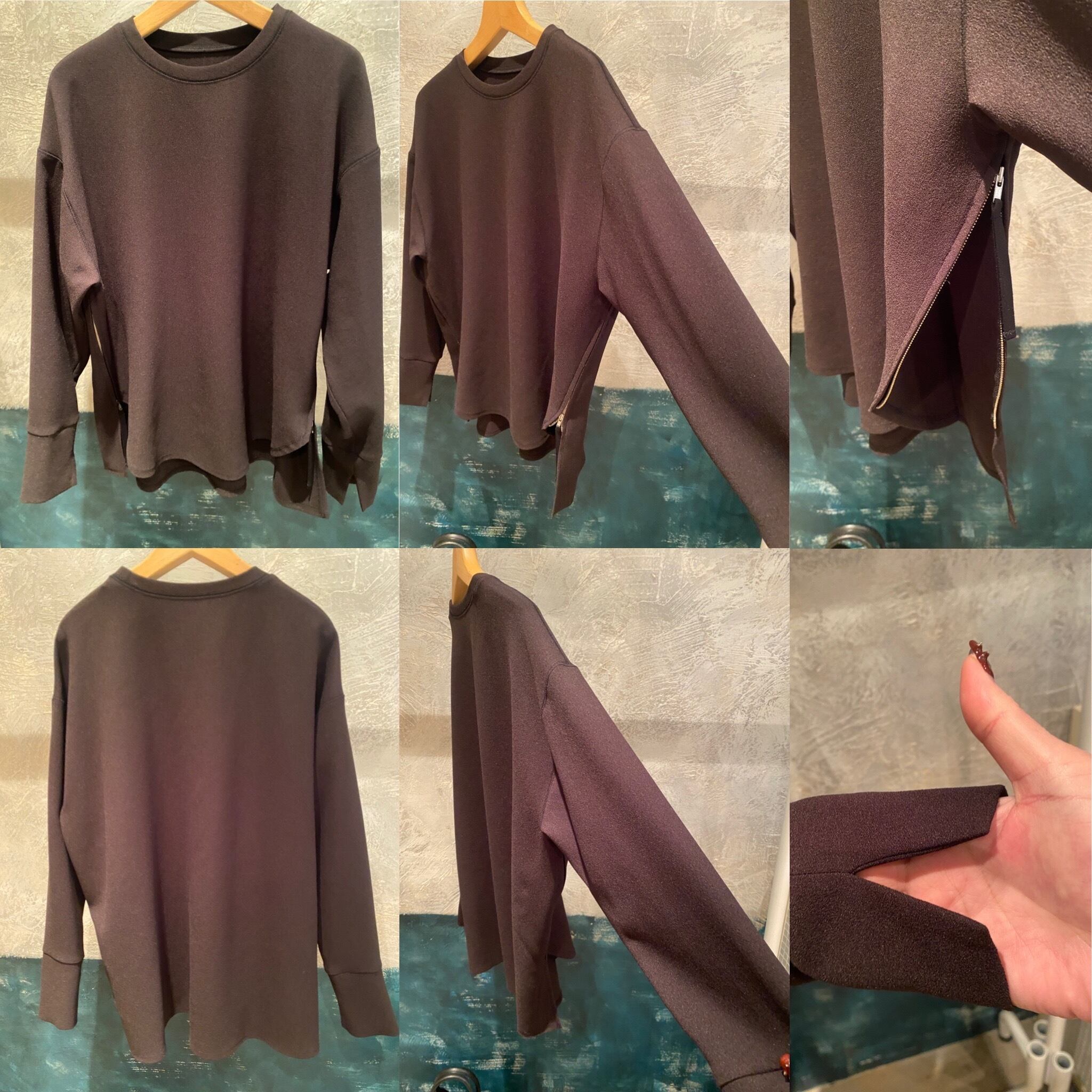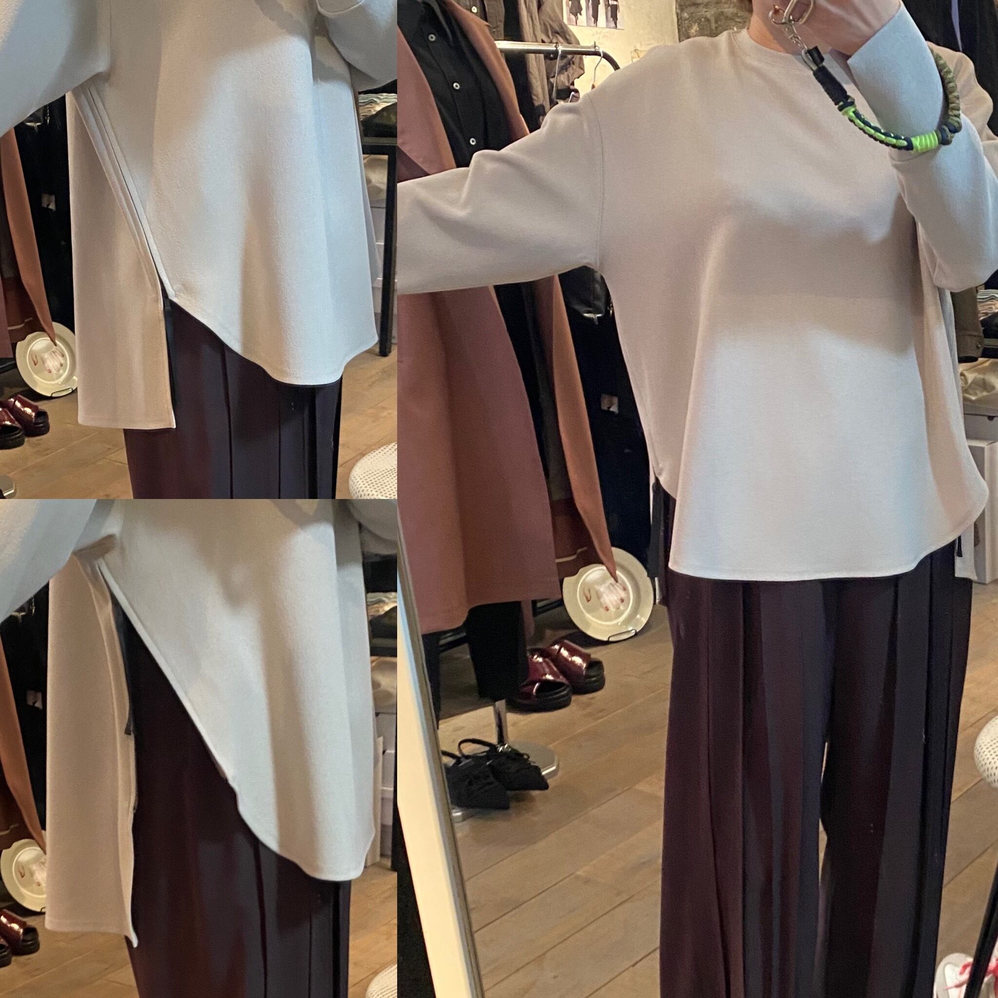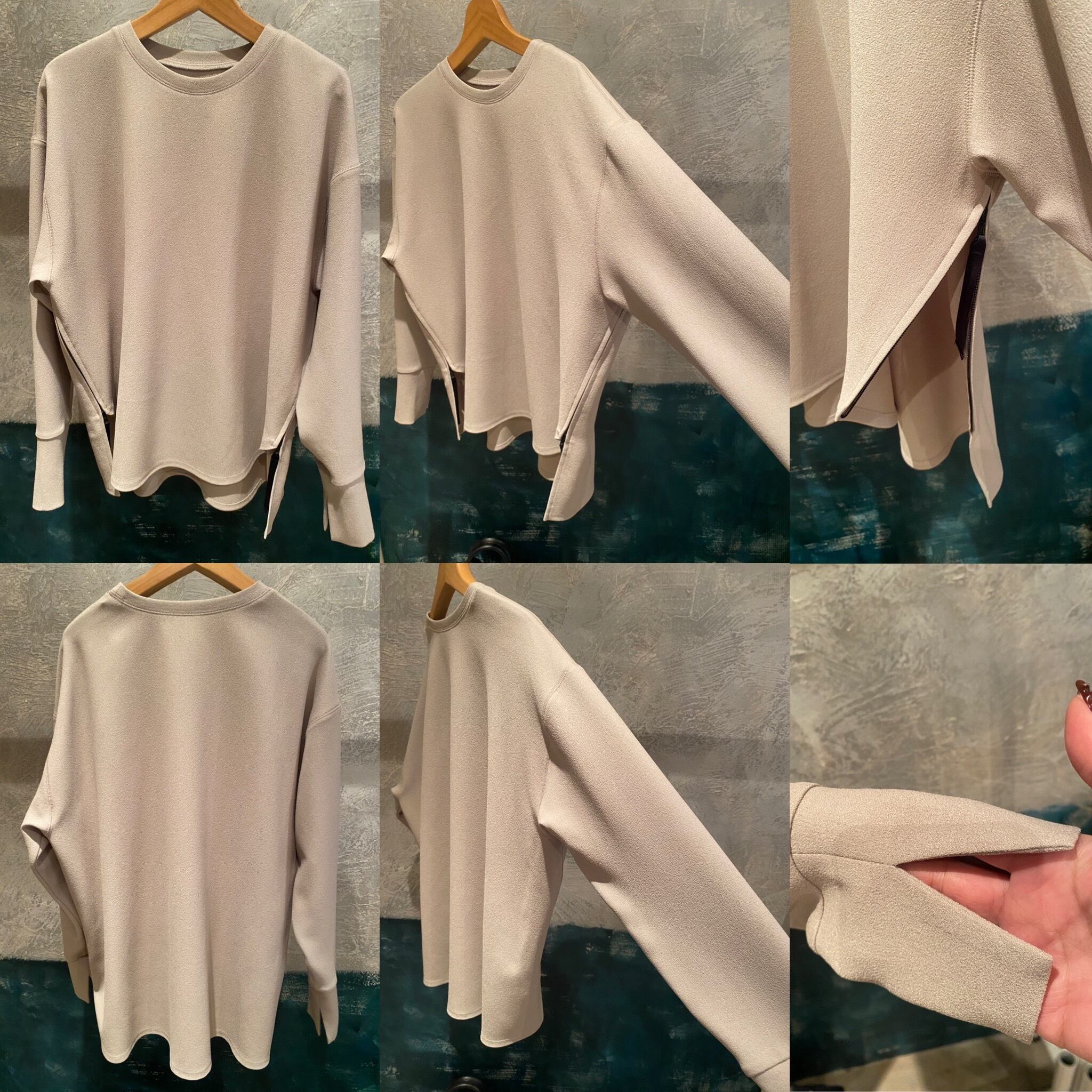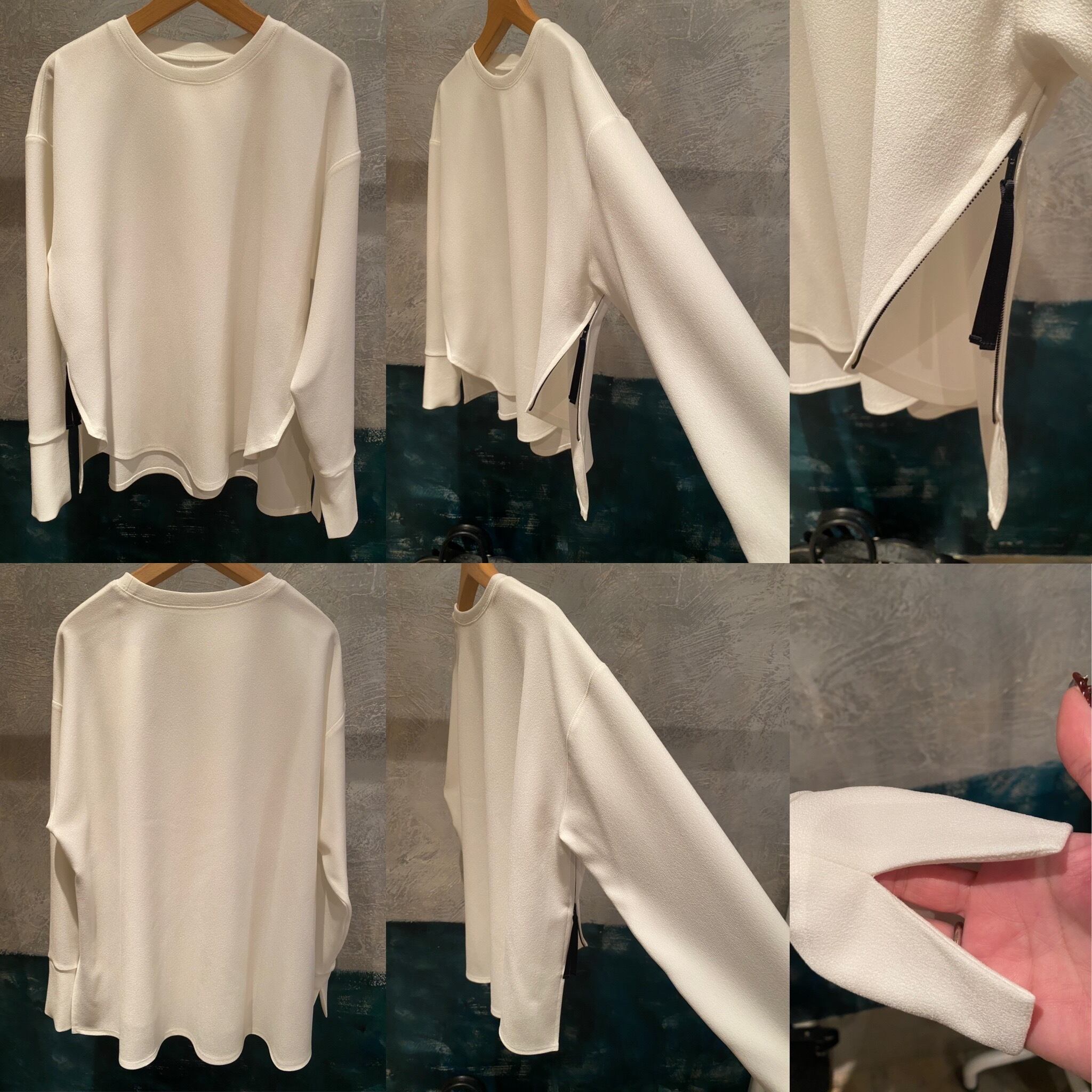 サラッとした着心地。サイドのジップデザインがポイントで、お好みでスリットとして開けて頂けるデザイン。体のラインも拾わず、合わせるボトムスも選ばないのでどなたでも着回せるヘビロテアイテムです♪Tシャツよりキレイめ見えするのも嬉しいところ。