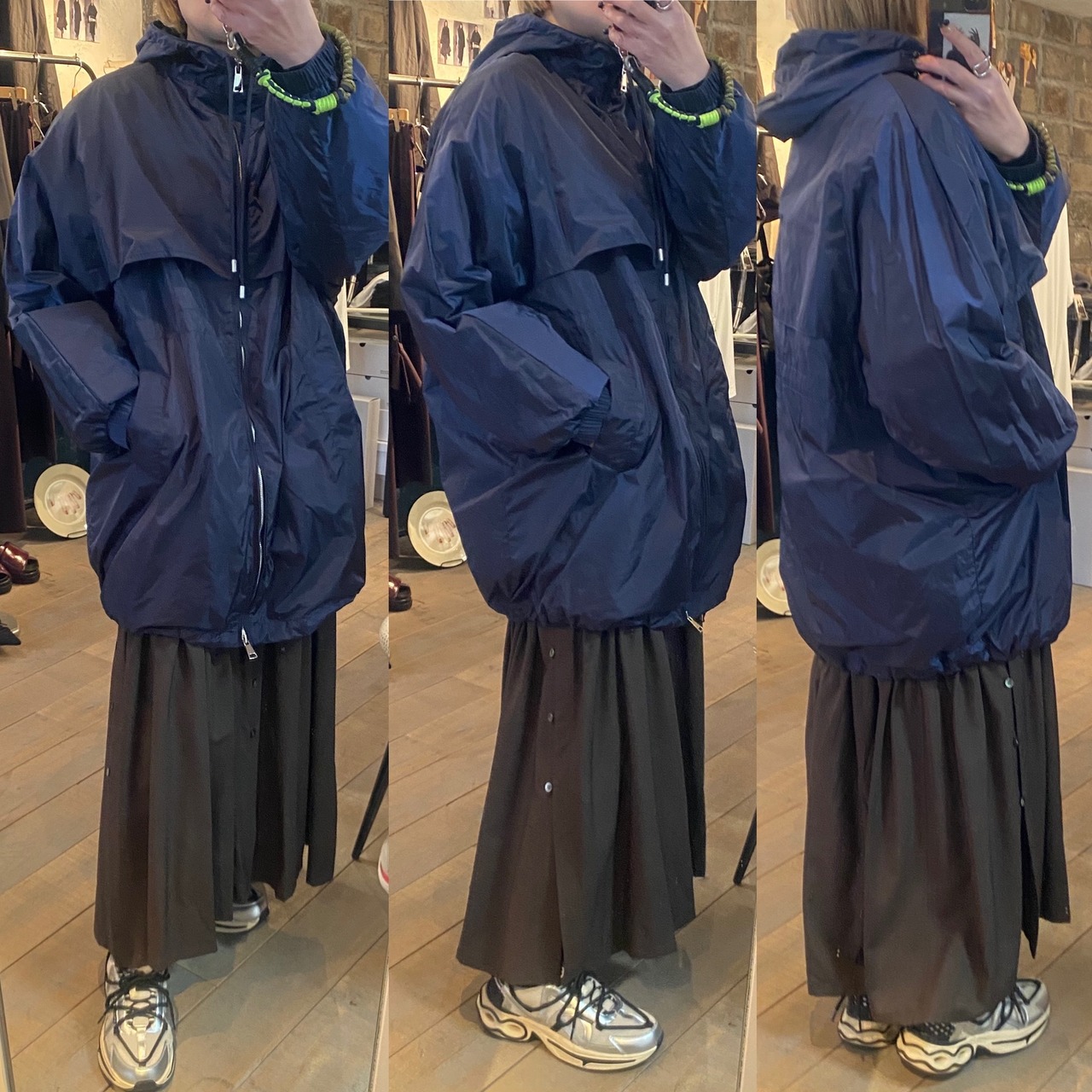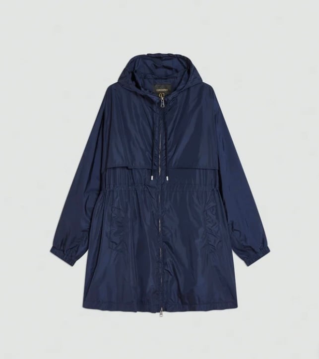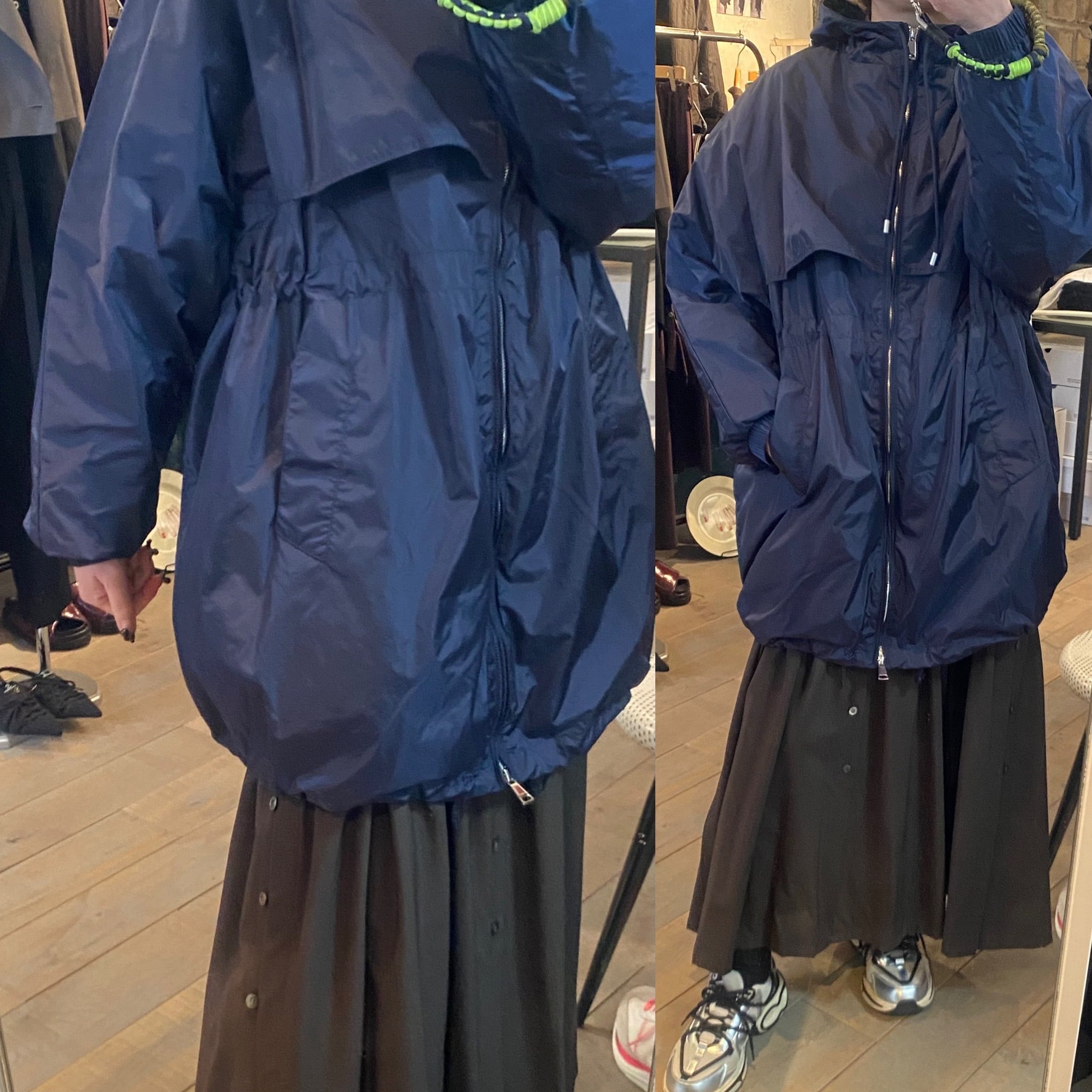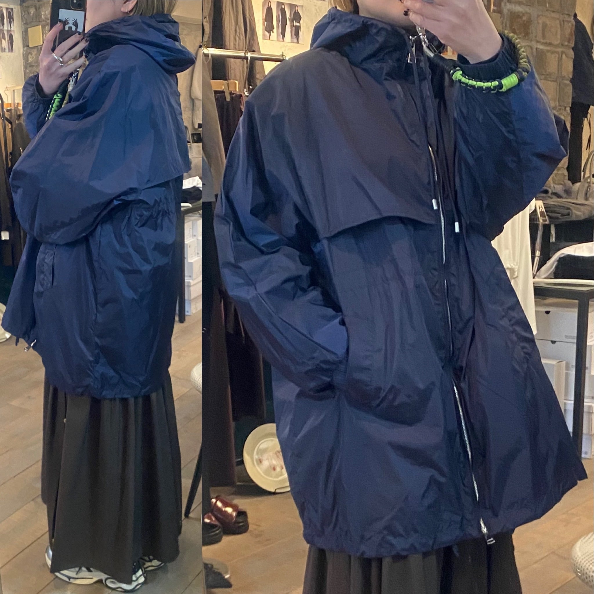 タフタ素材で程よいハリ感と上品な光沢感のあるジップフーディーブルゾン。フード部分の紐の絞り具合で立体感を出せたり、裾やウエスト部分に紐が内蔵されているのでシルエットを変えて頂けたりと、細部にこだわりの詰まったアイテム。ヒップがすっぽり隠れる程の着丈で着回し力抜群です♪春先問わず季節の変わり目や肌寒い季節、気温の変動が激しい今の時代にバッグに忍ばせるにも便利なアイテムです!