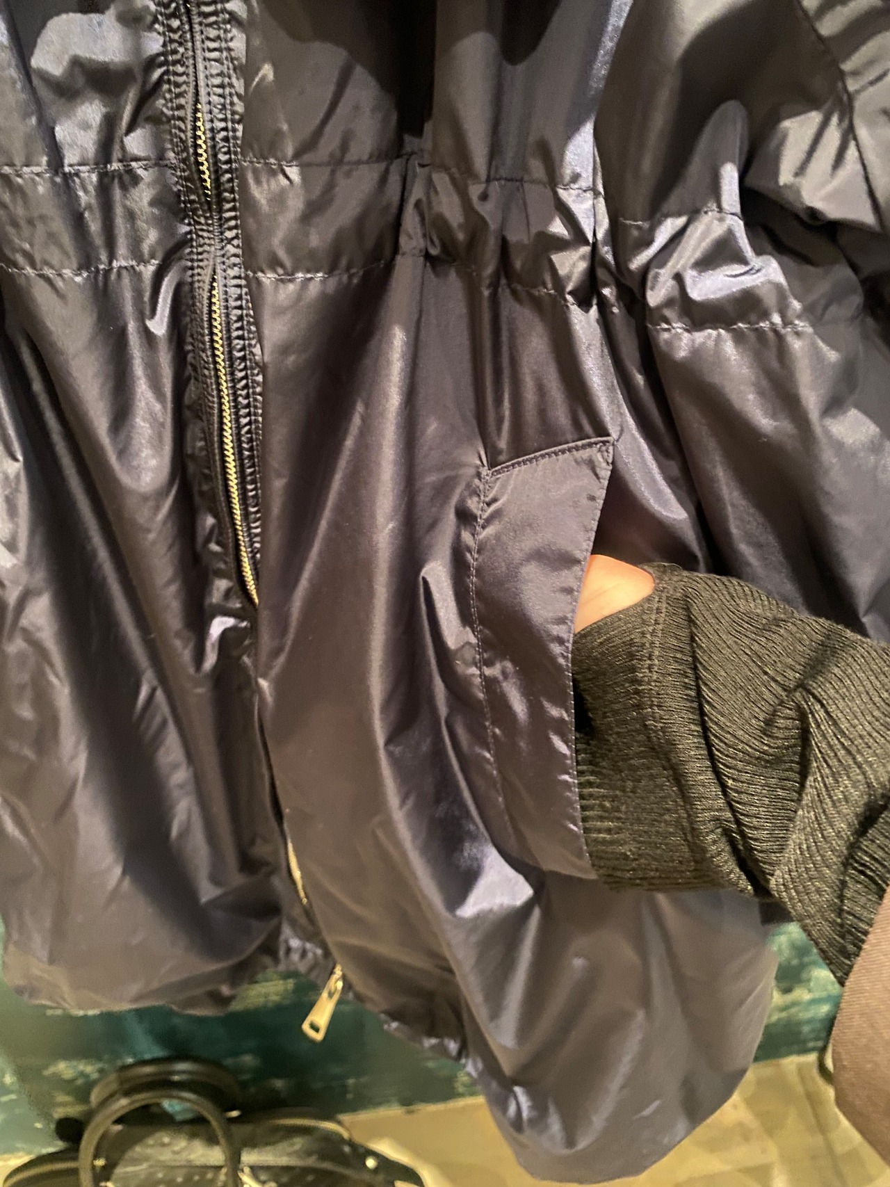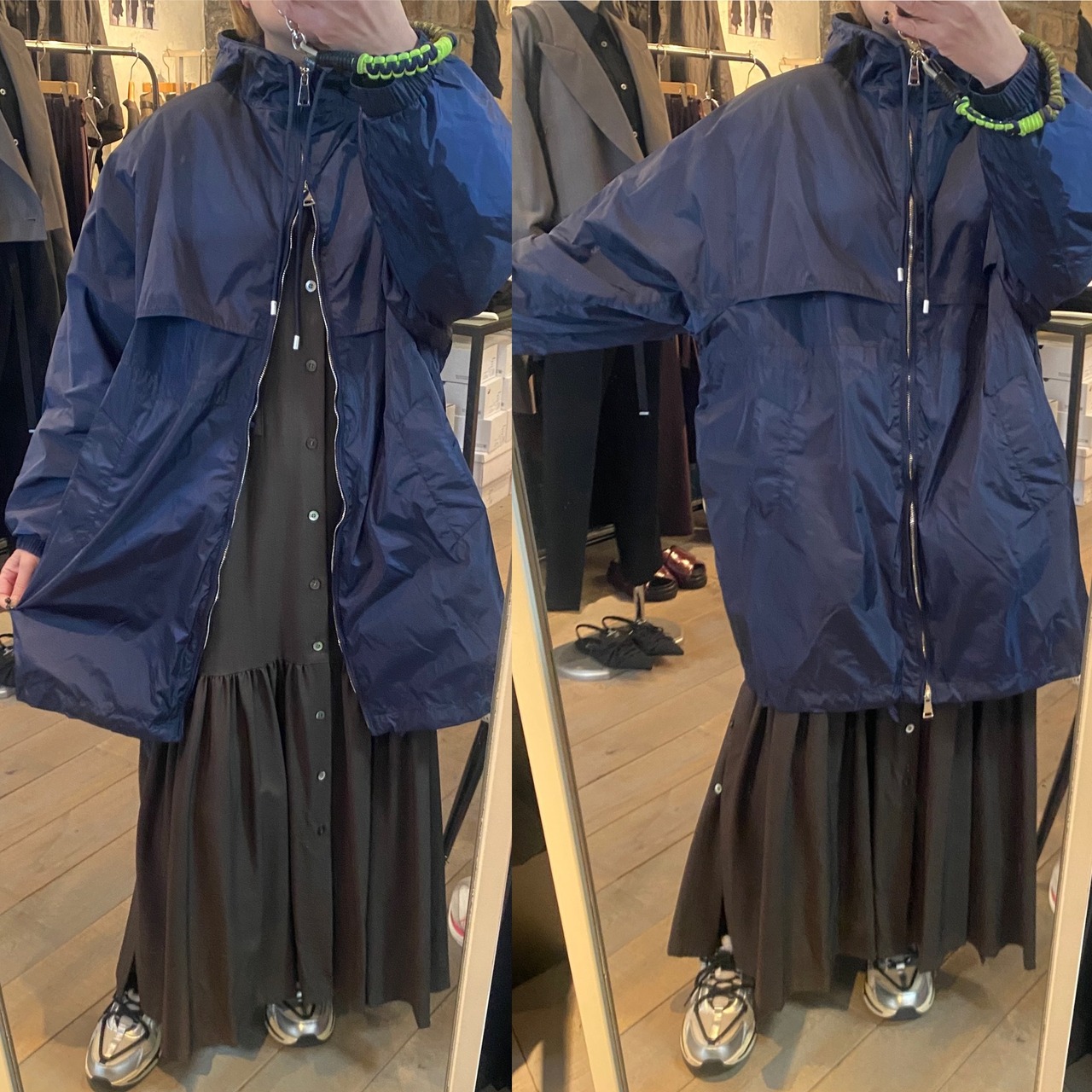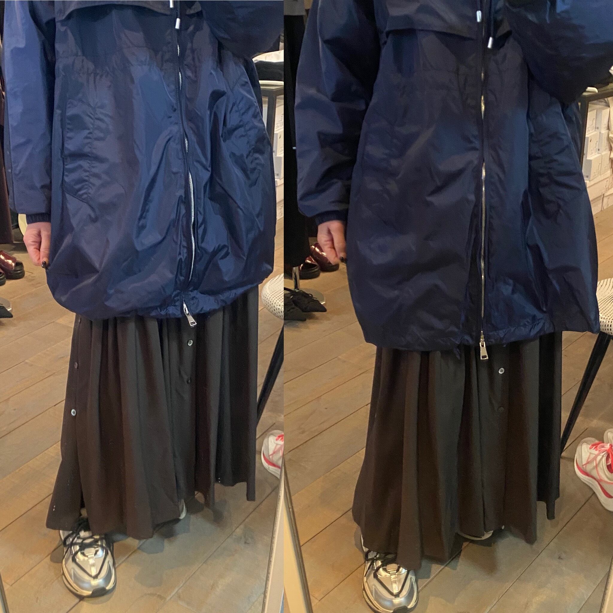 タフタ素材で程よいハリ感と上品な光沢感のあるジップフーディーブルゾン。フード部分の紐の絞り具合で立体感を出せたり、裾やウエスト部分に紐が内蔵されているのでシルエットを変えて頂けたりと、細部にこだわりの詰まったアイテム。ヒップがすっぽり隠れる程の着丈で着回し力抜群です♪春先問わず季節の変わり目や肌寒い季節、気温の変動が激しい今の時代にバッグに忍ばせるにも便利なアイテムです!