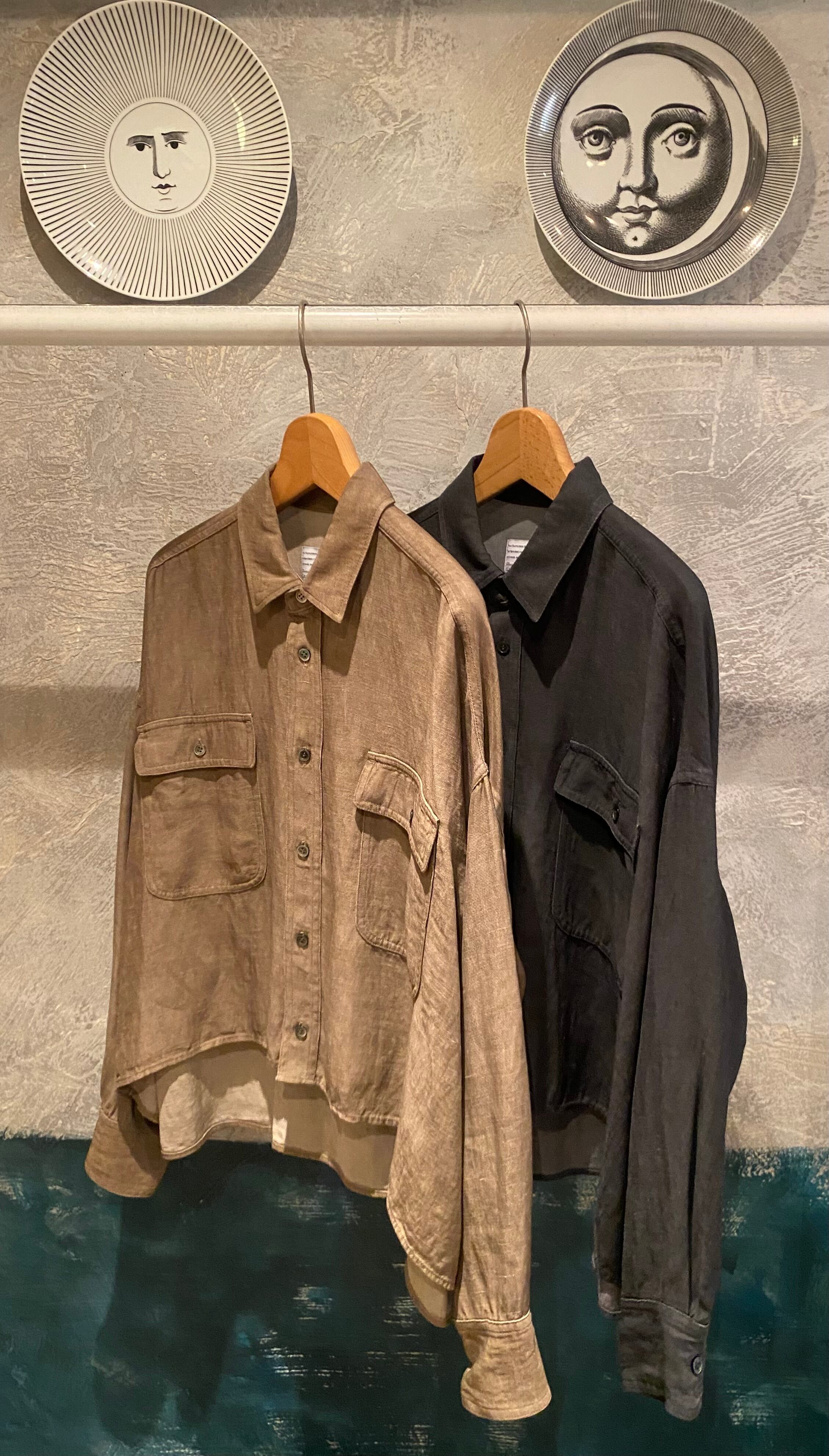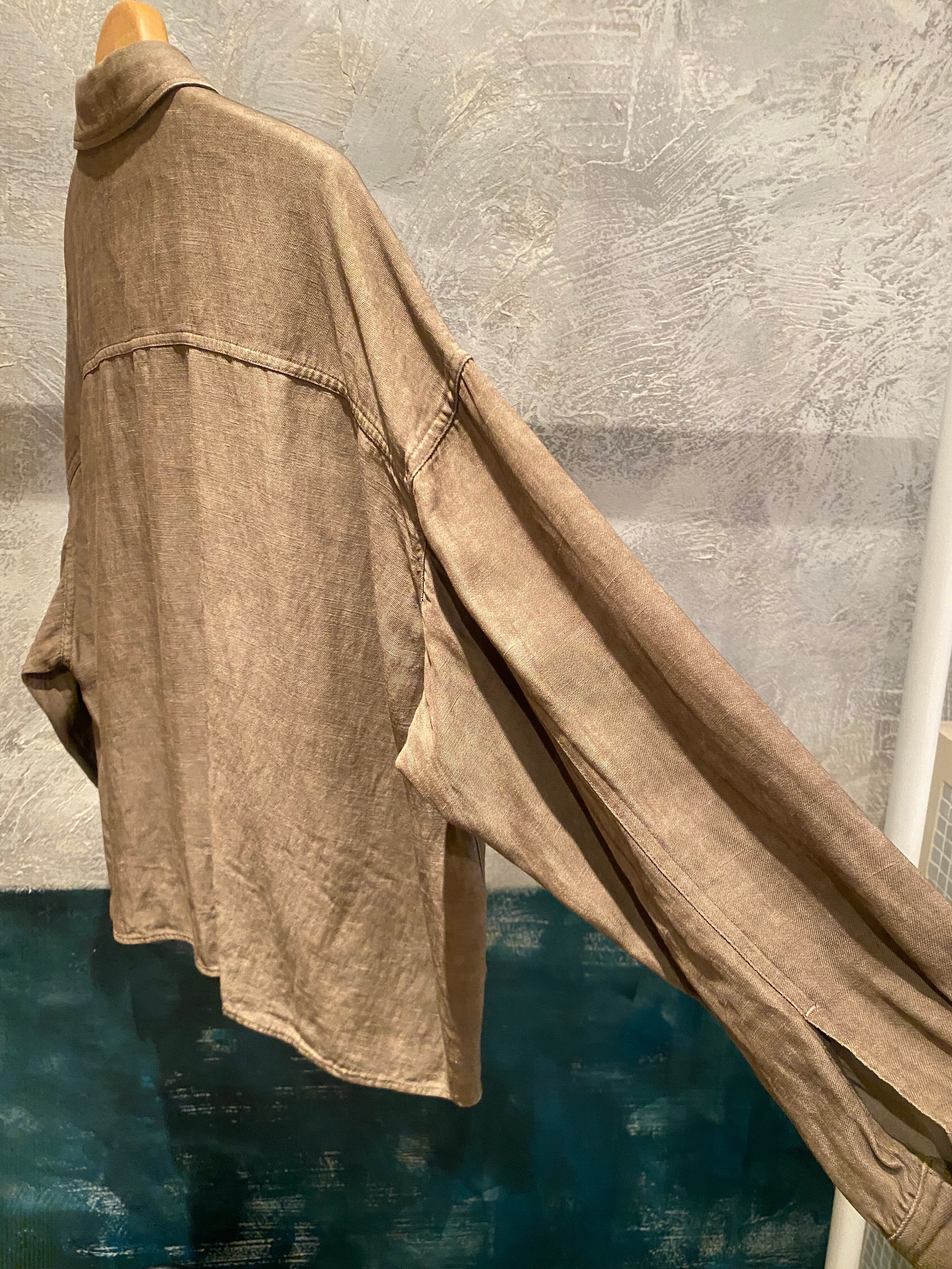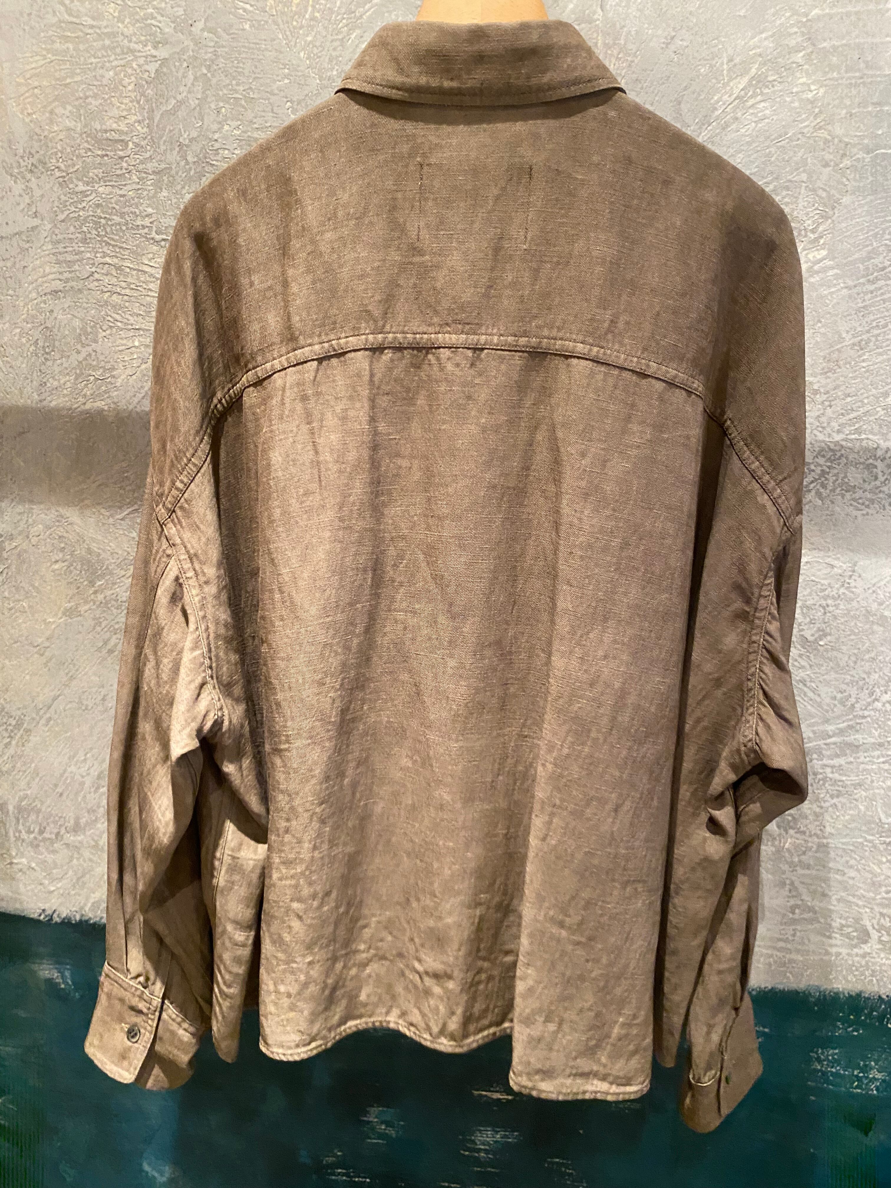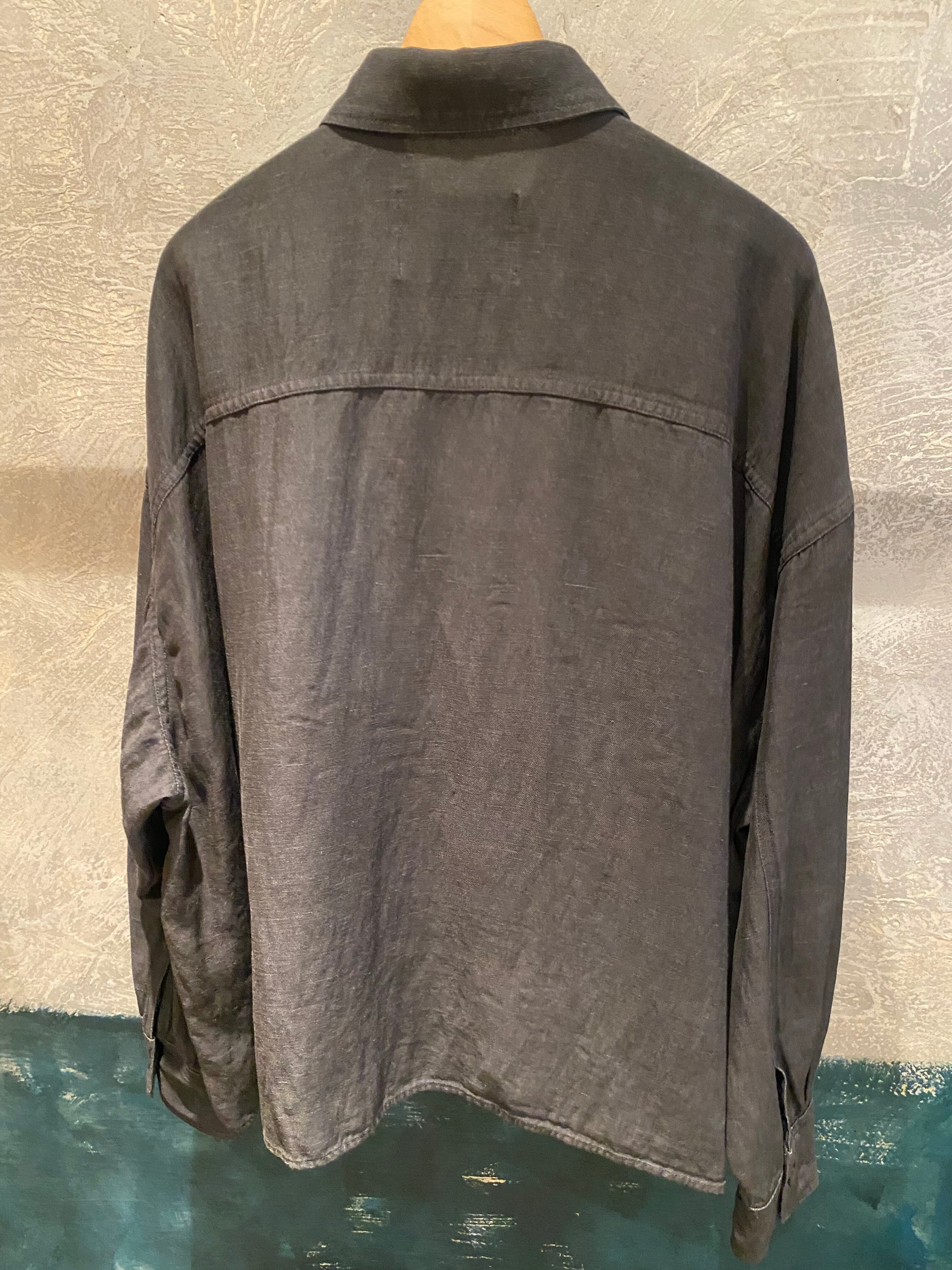オーバーサイズのシャツジャケット。サラッと着るだけでも雰囲気の出るシルエット。閉めてブラウスとしても開けてシャツジャケットとしても対応できます。夏の羽織りとしても活躍するレーヨンリネン素材。製品染しているカラーの雰囲気も◎程よいハリ感とコシのある素材感です。