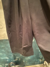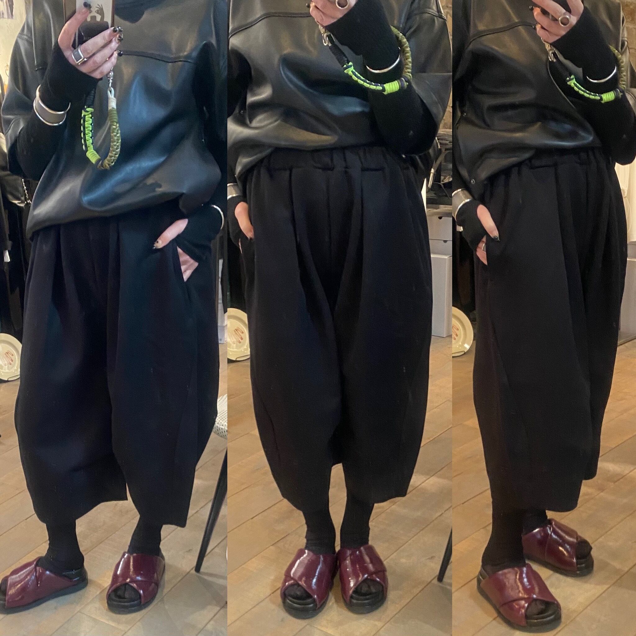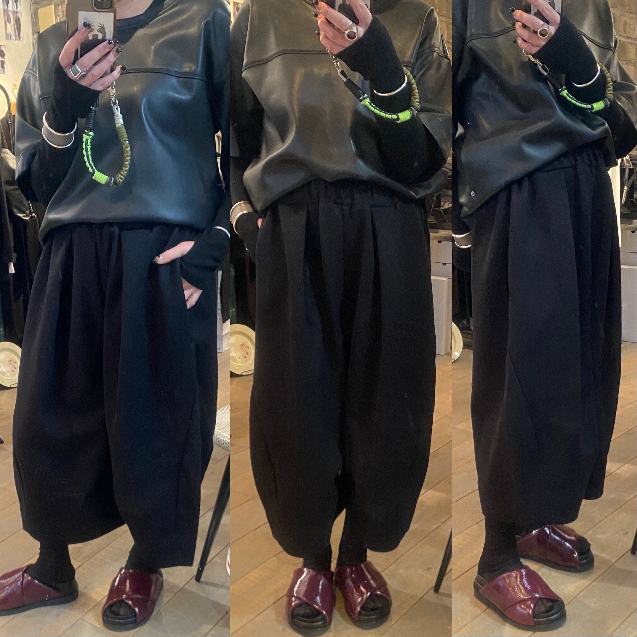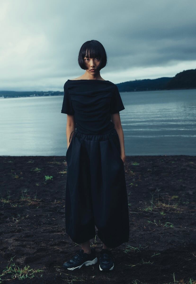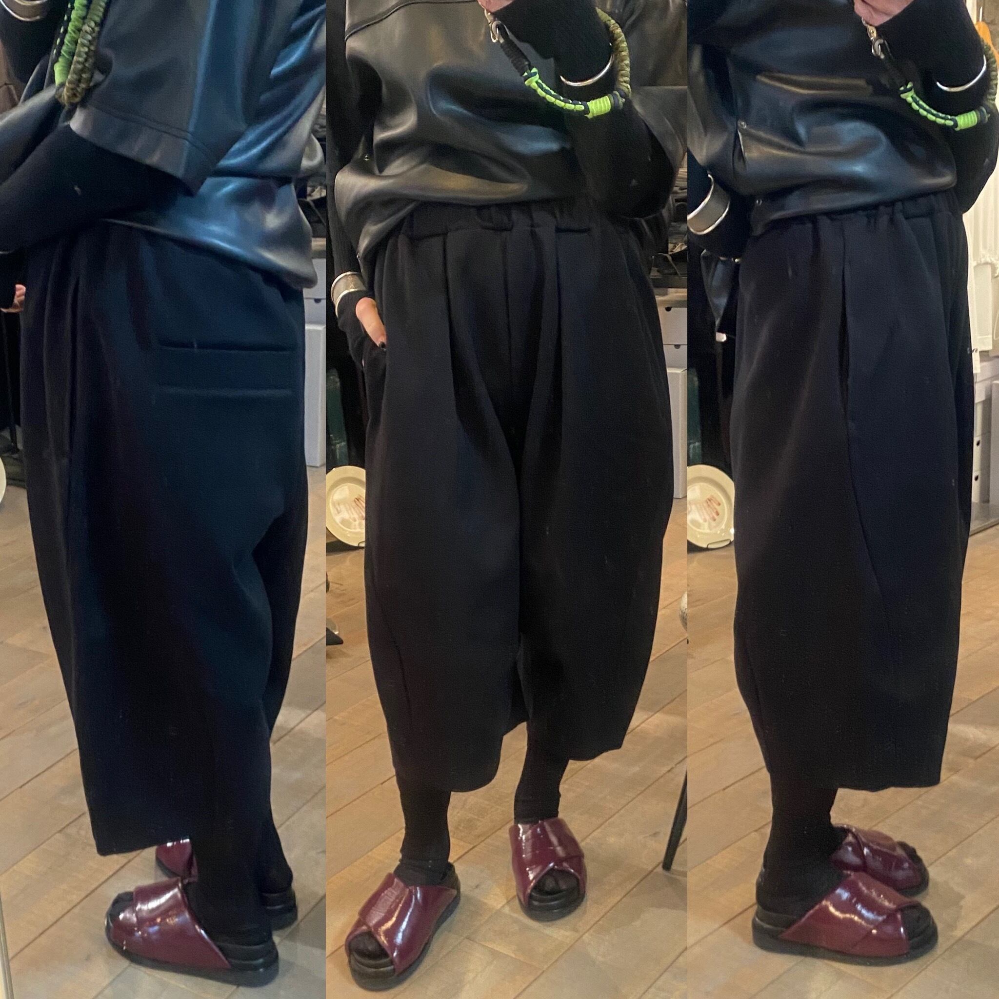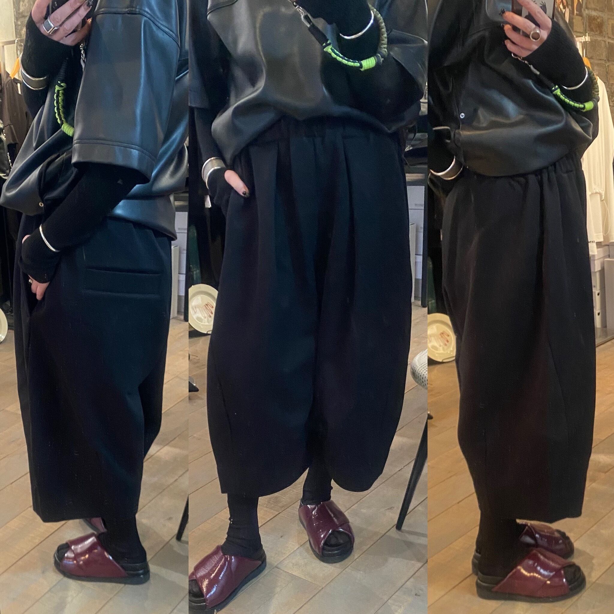 両サイドの切り替え位置を大きく前にカーブさせる事で立体的なシルエットを構築しました。裾に向かって太くなったシルエットが存在感のあるガウチョ丈のパンツです。