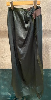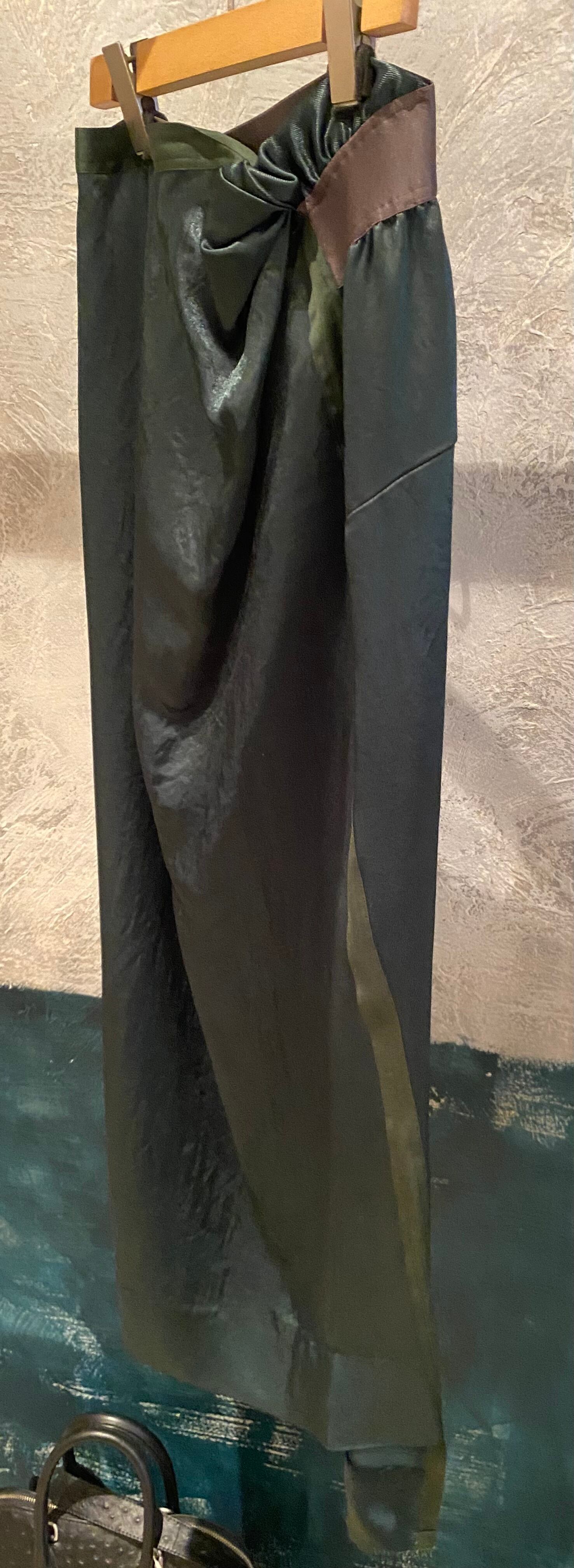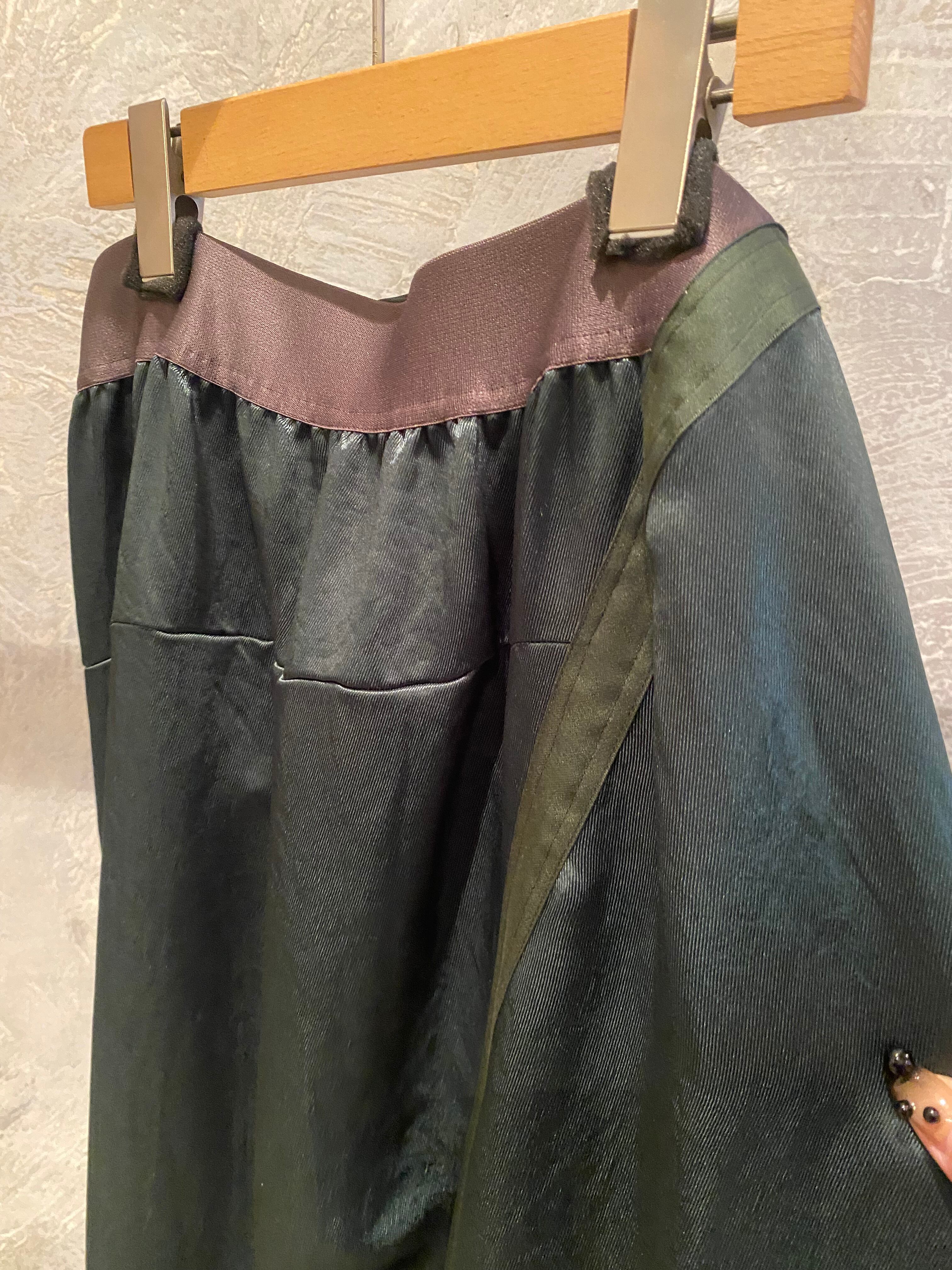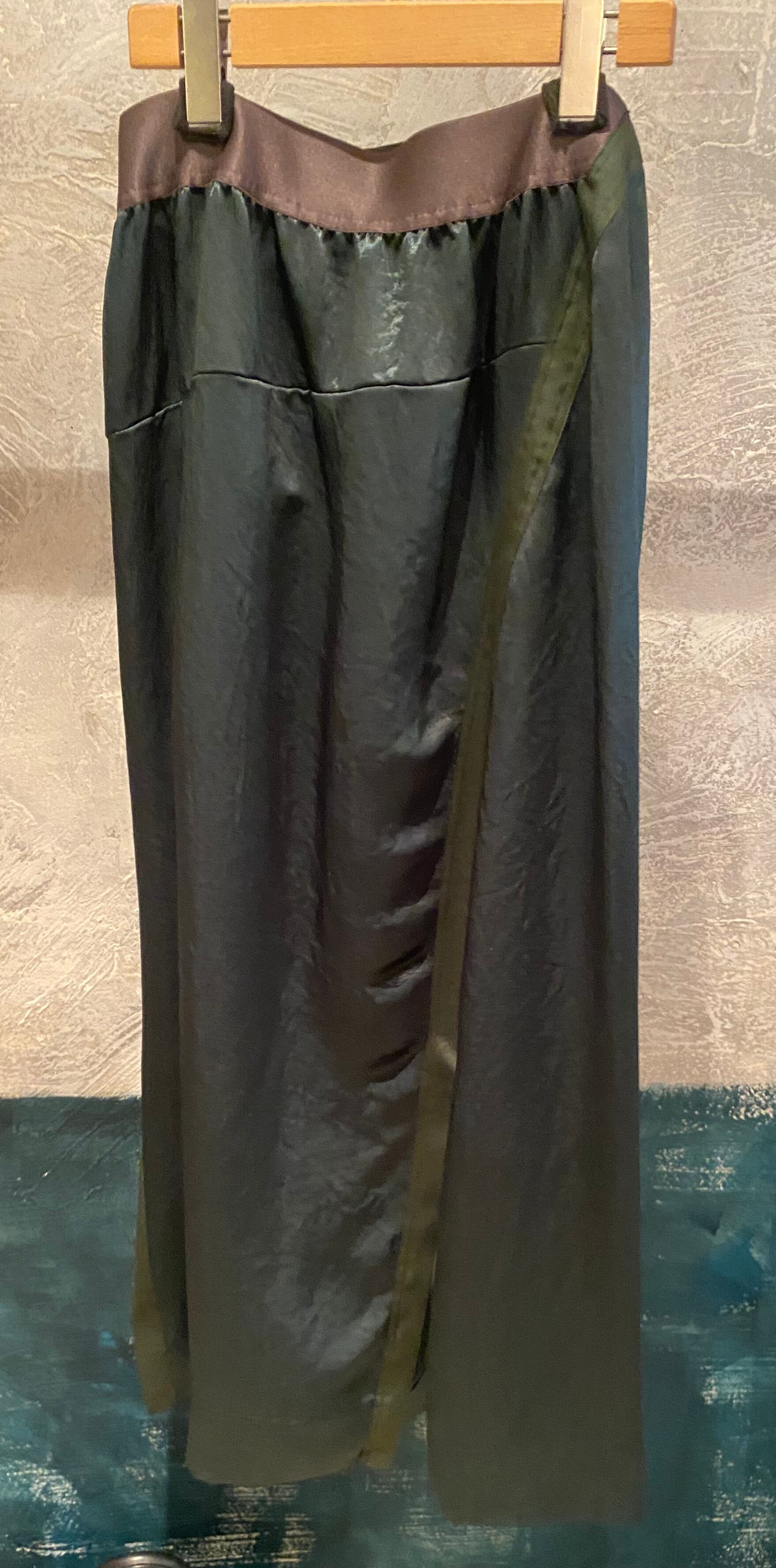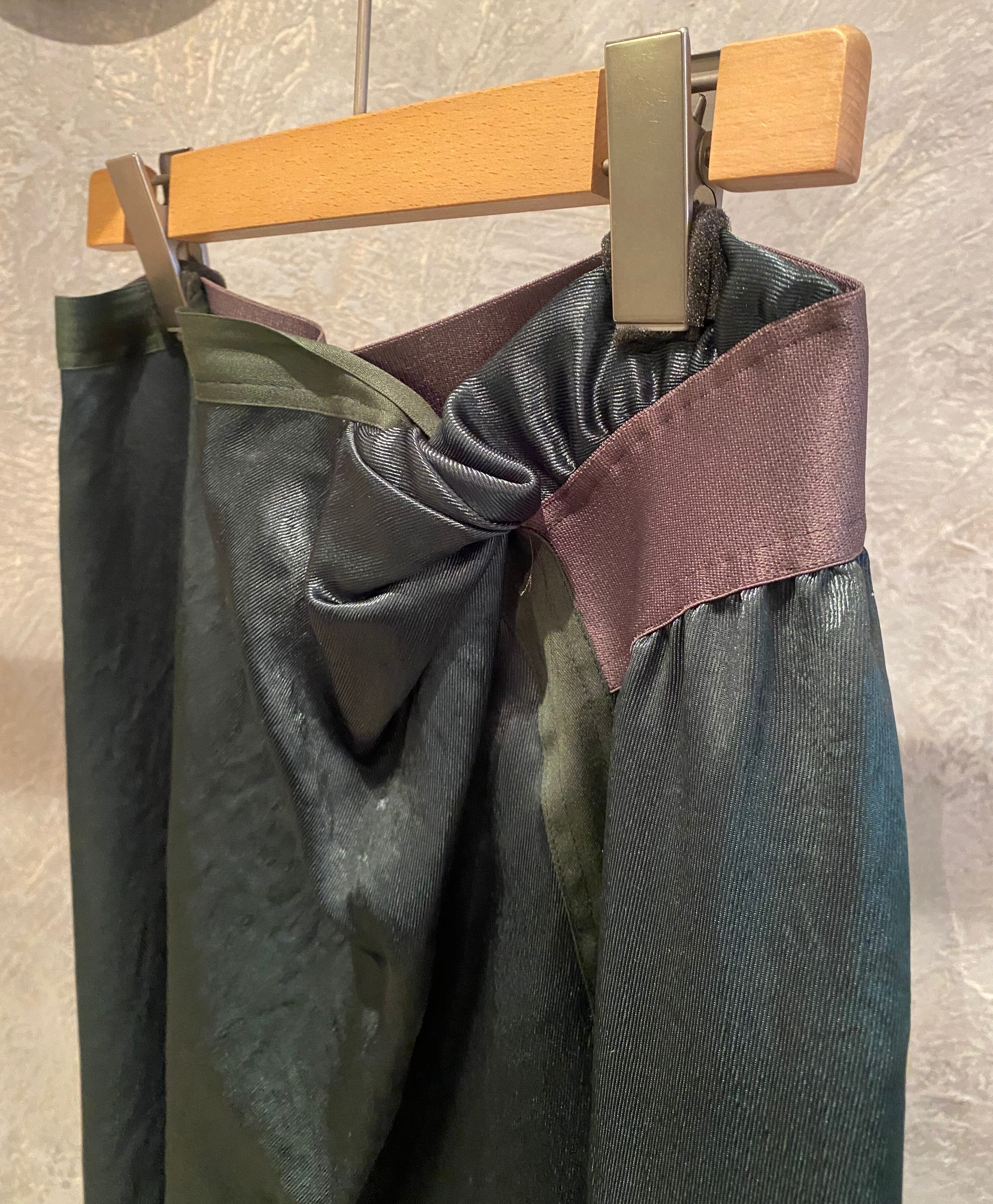 ドレープとカッティングが特徴のエレガントなスカート。ゴムベルトを取り入れる事でフィット感を高めつつも快適な着心地を実現。アシンメトリーなデザインが動きの中で美しいラインを描き、洗練された印象を与えます。