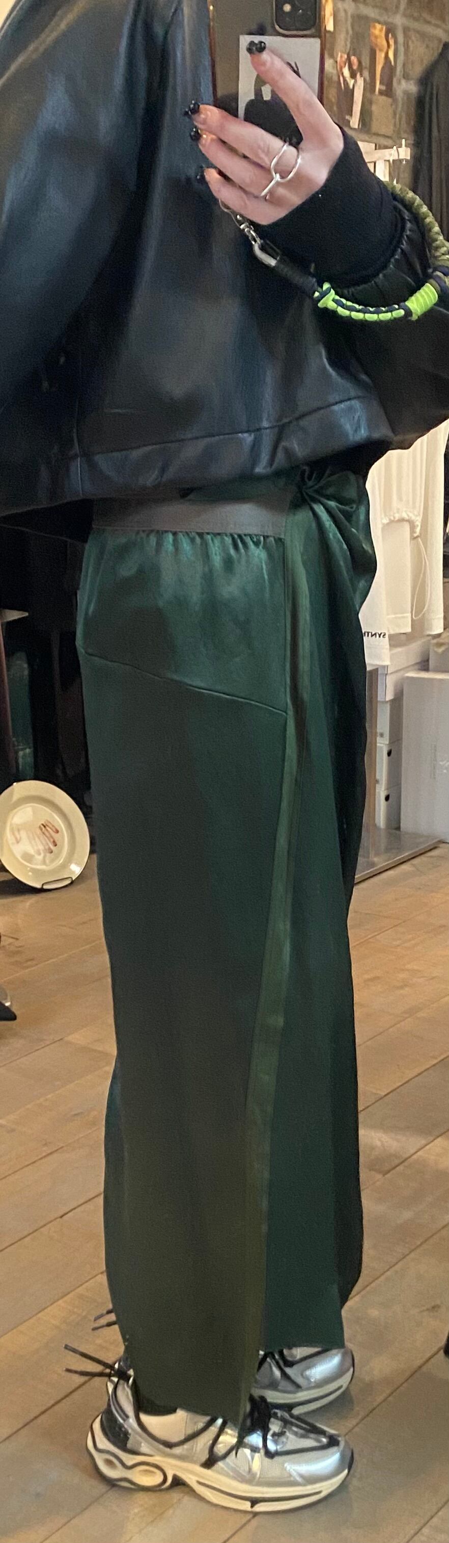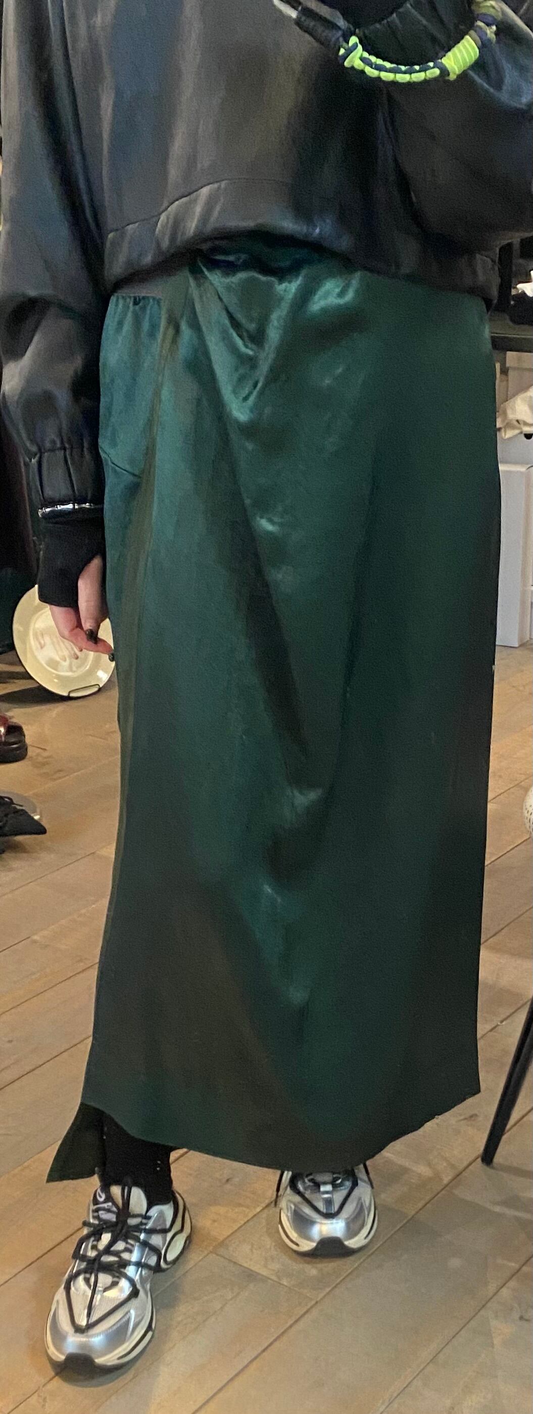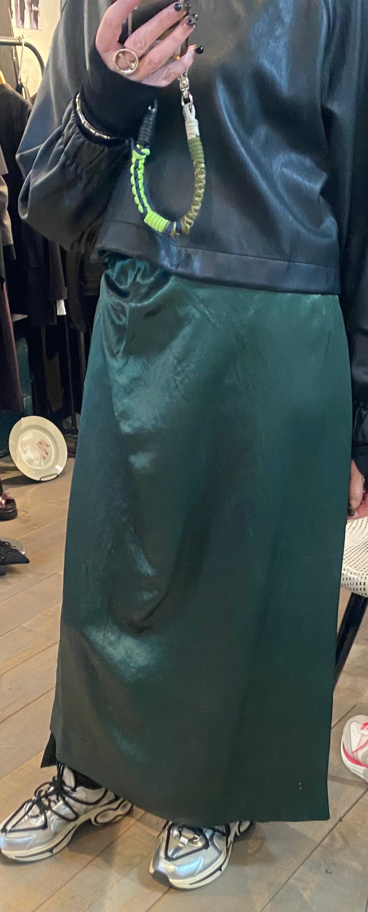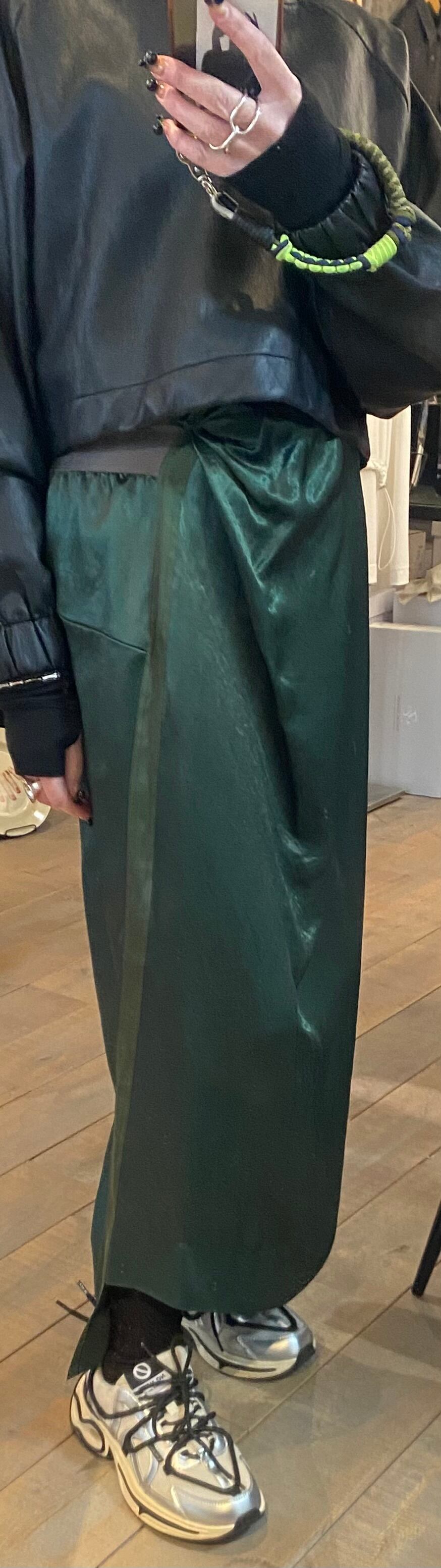 ドレープとカッティングが特徴のエレガントなスカート。ゴムベルトを取り入れる事でフィット感を高めつつも快適な着心地を実現。アシンメトリーなデザインが動きの中で美しいラインを描き、洗練された印象を与えます。