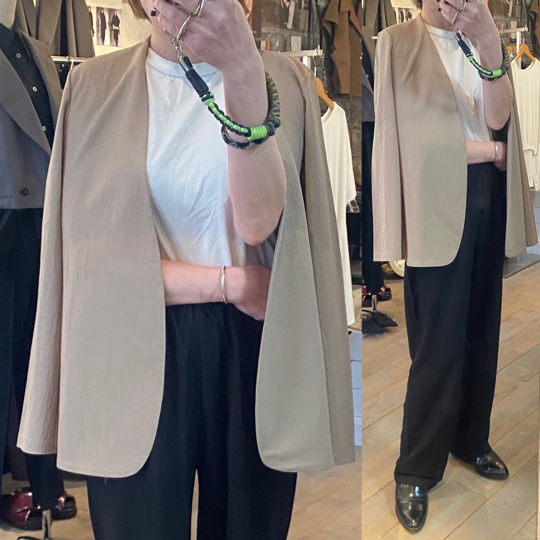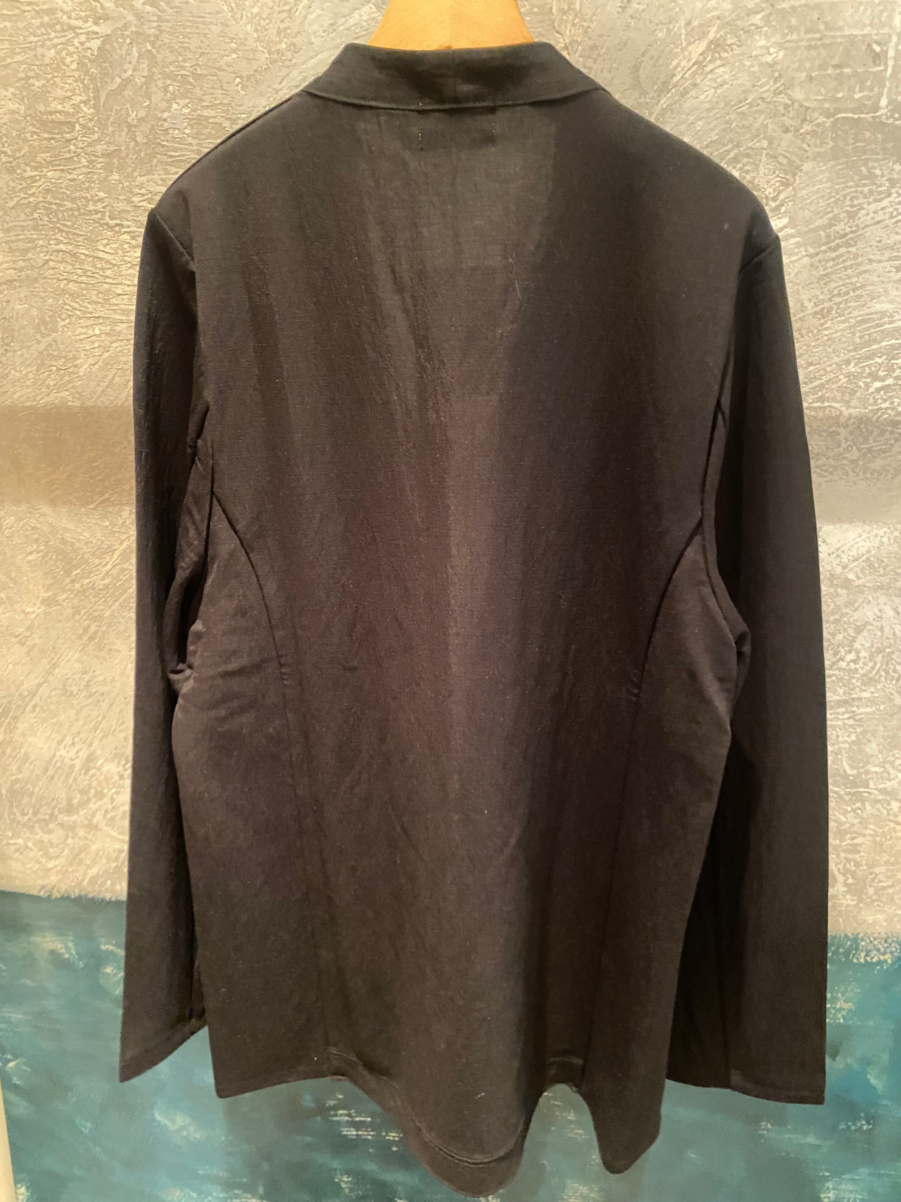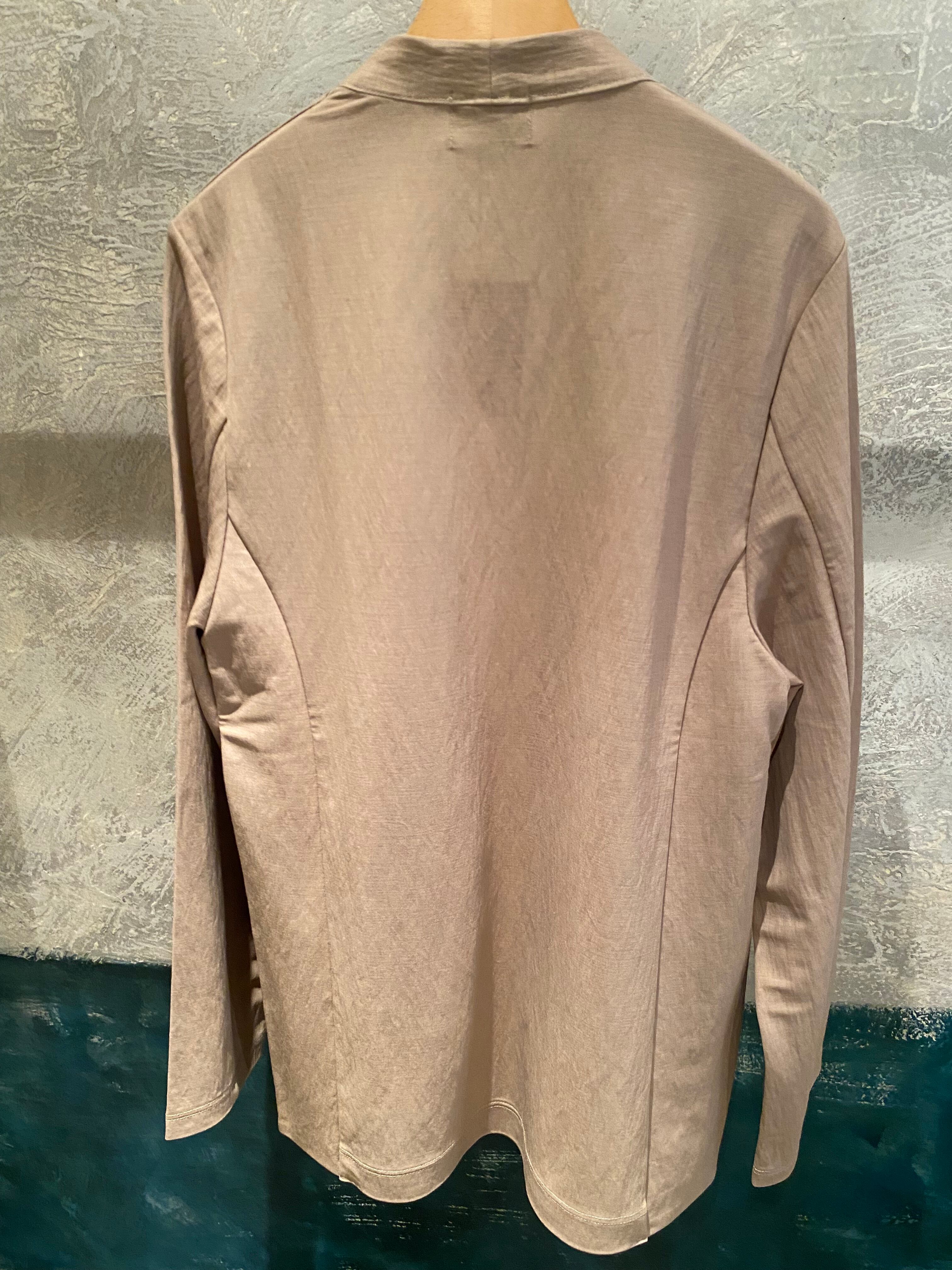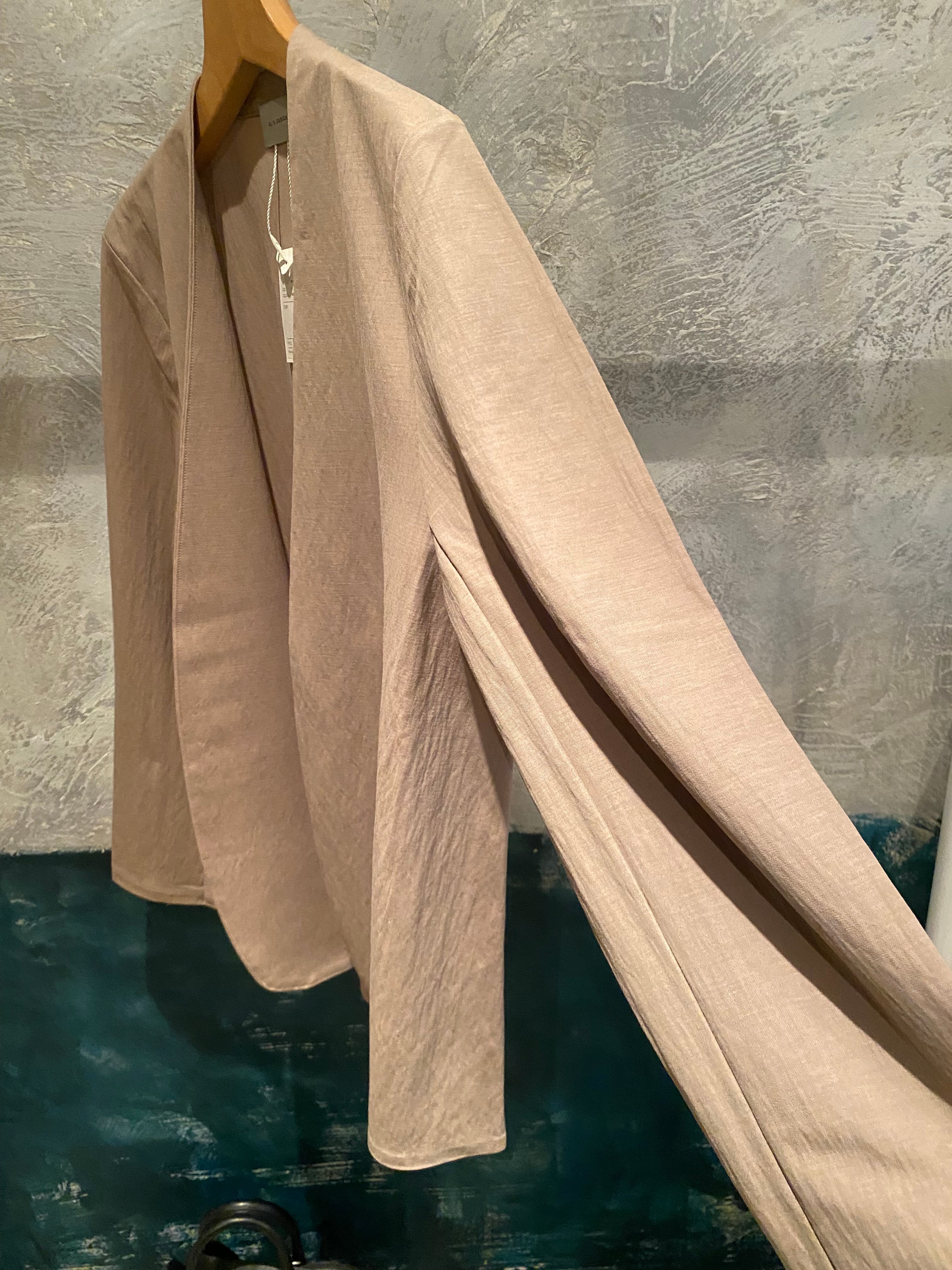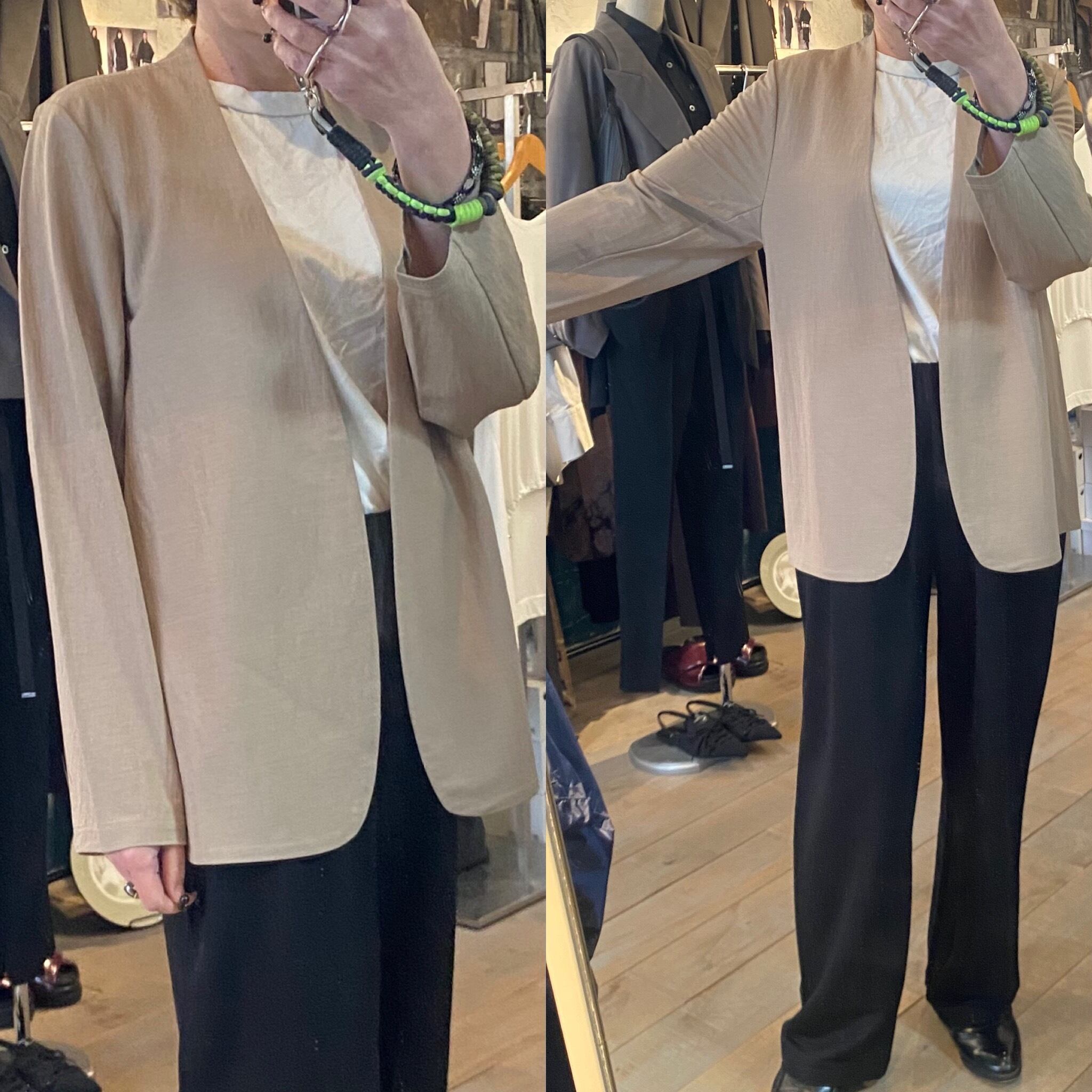 シンプルなノーカラーのボタンレスジャケットを織物のような軽さと薄さを併せ持つジャージー素材でお作りしました。カーディガンのような気軽さで羽織って頂けるキレイめジャケットに仕上がっています。