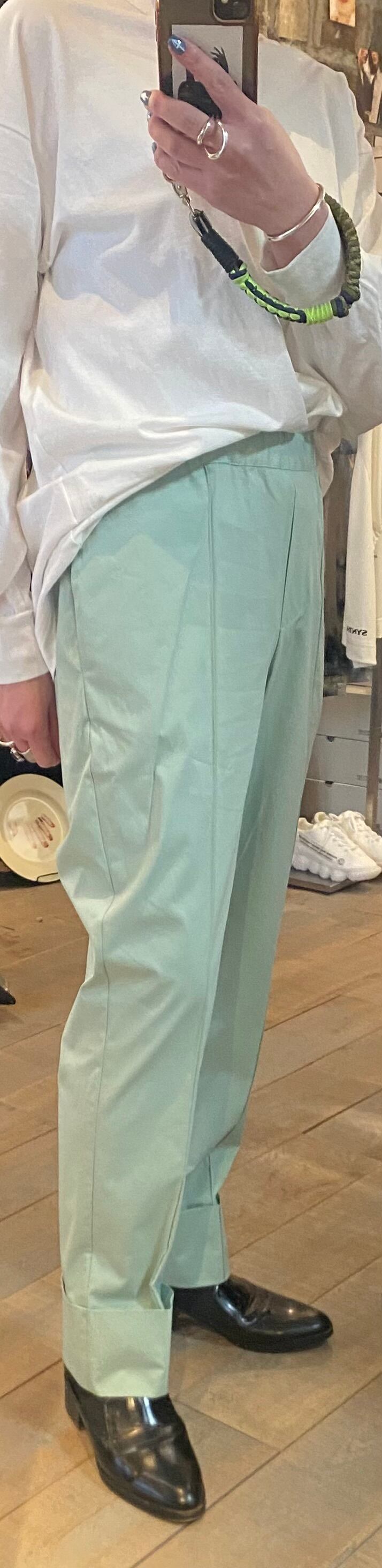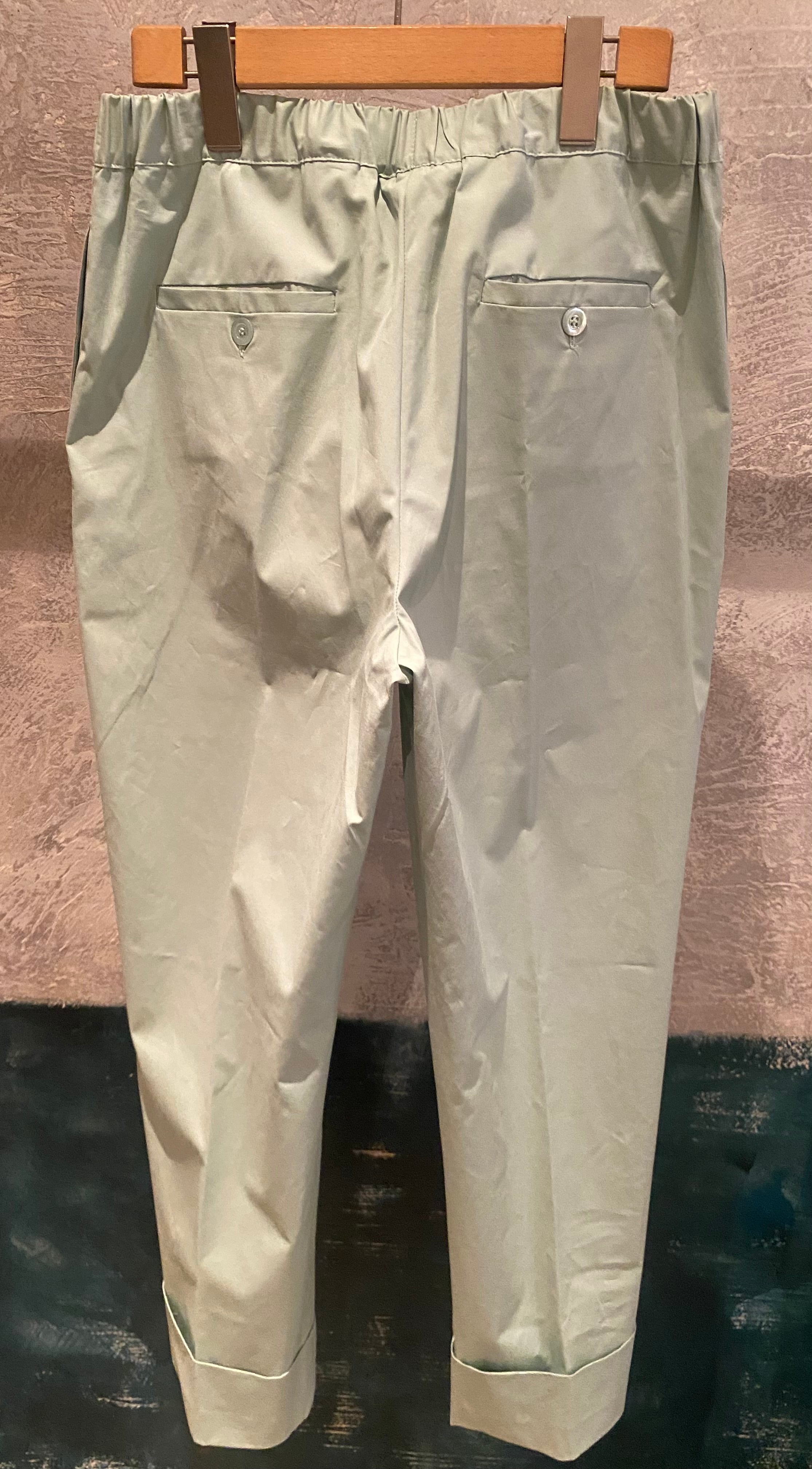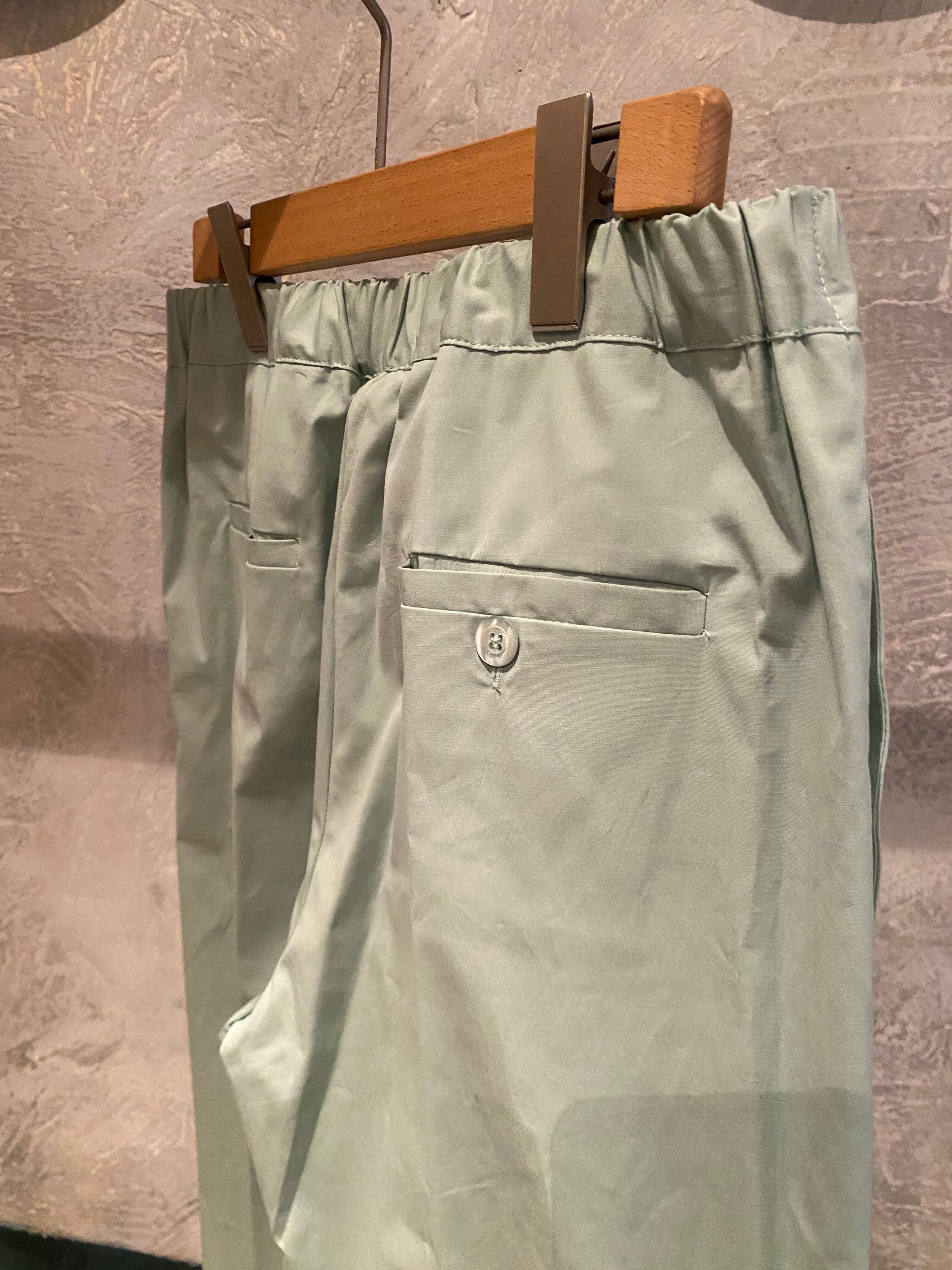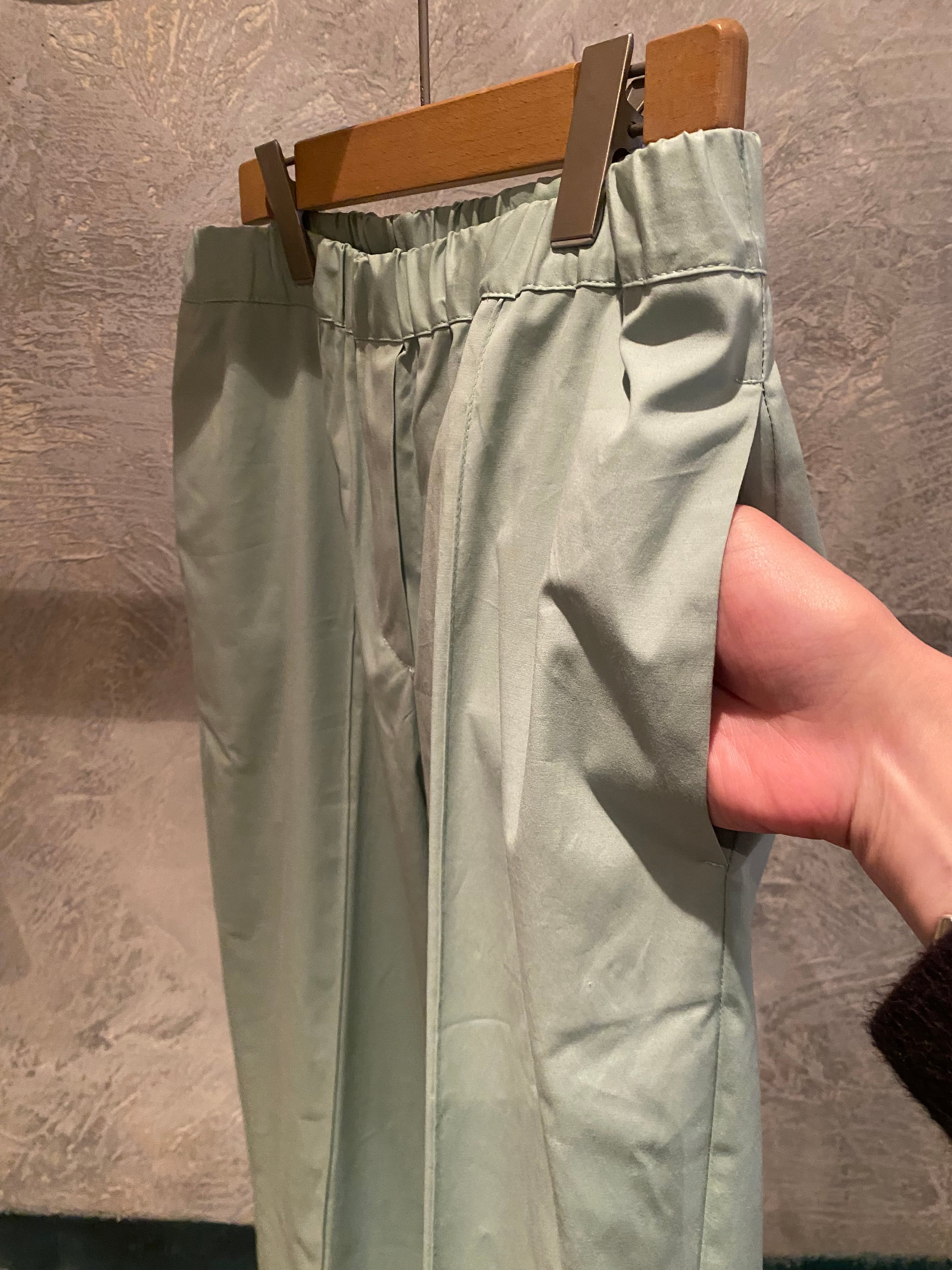 テーパードシルエットのパンツ。フロントピンタックでよりスッキリ感を演出。裾が太めのダブルデザインもポイントに。ウエストは総ゴムで、さらに伸縮性のある素材で履き心地抜群です♪