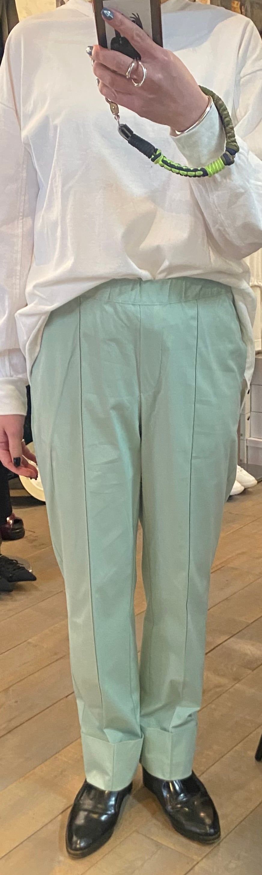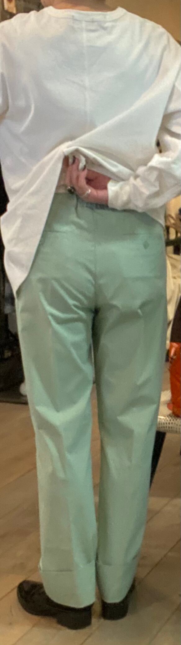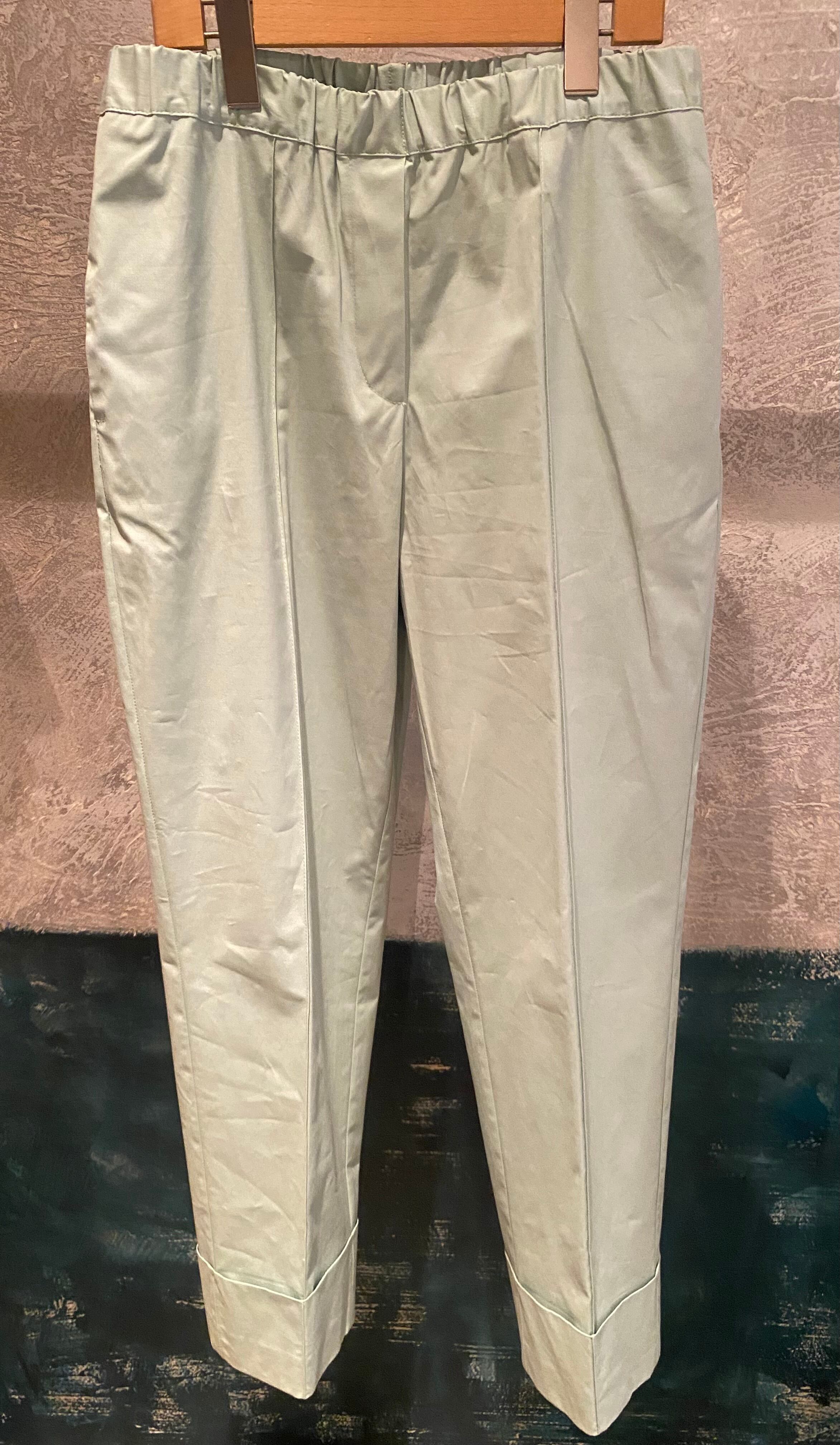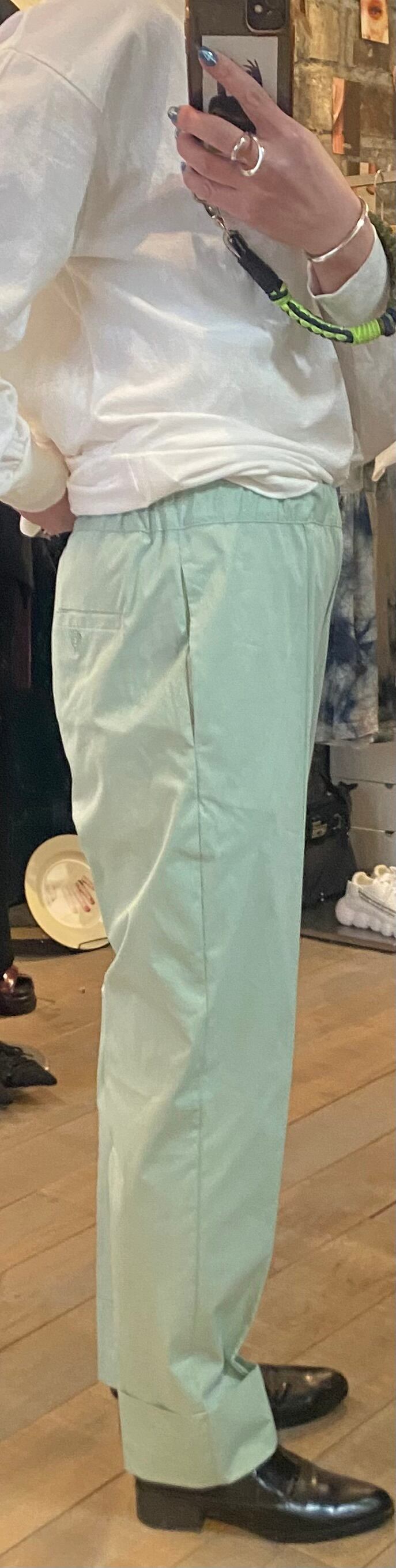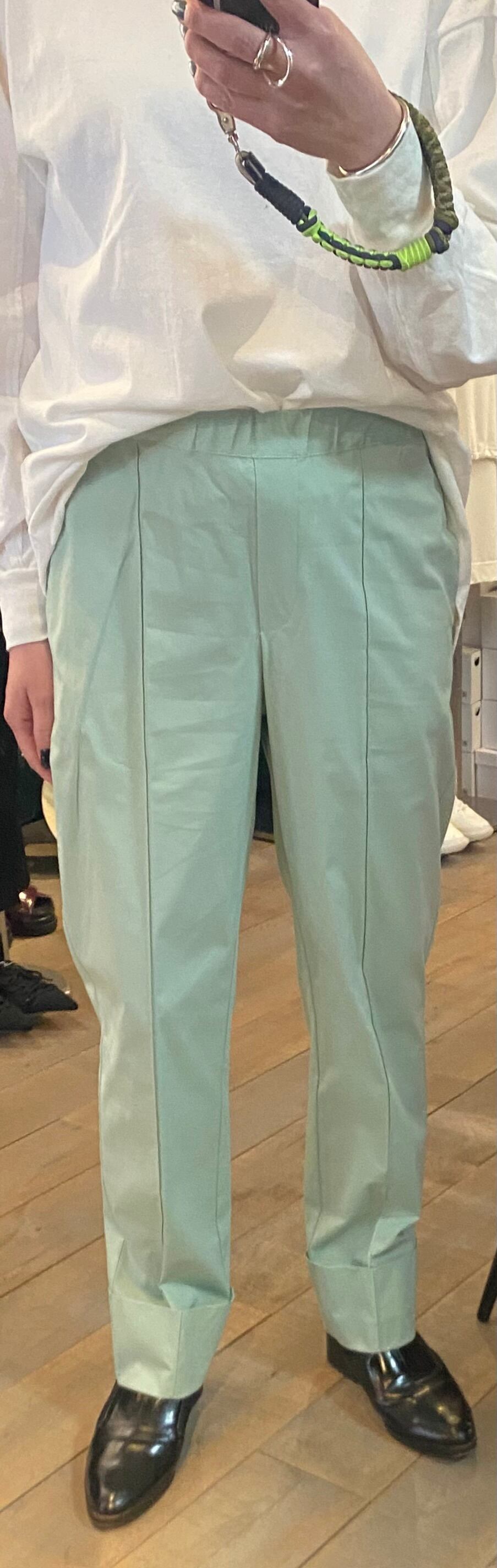テーパードシルエットのパンツ。フロントピンタックでよりスッキリ感を演出。裾が太めのダブルデザインもポイントに。ウエストは総ゴムで、さらに伸縮性のある素材で履き心地抜群です♪