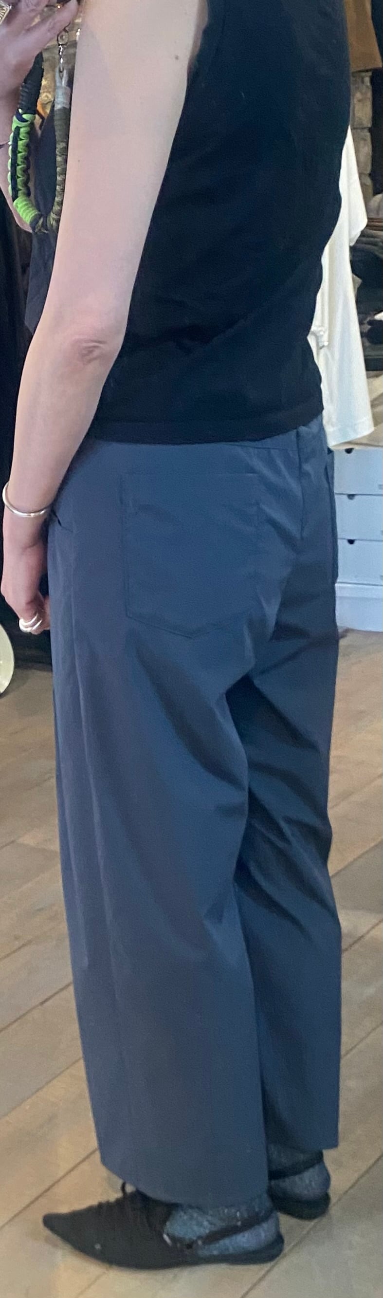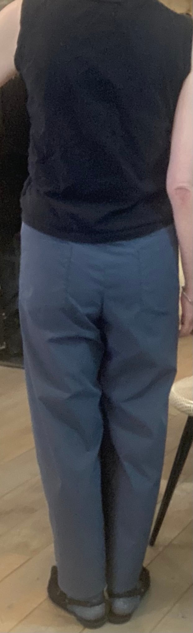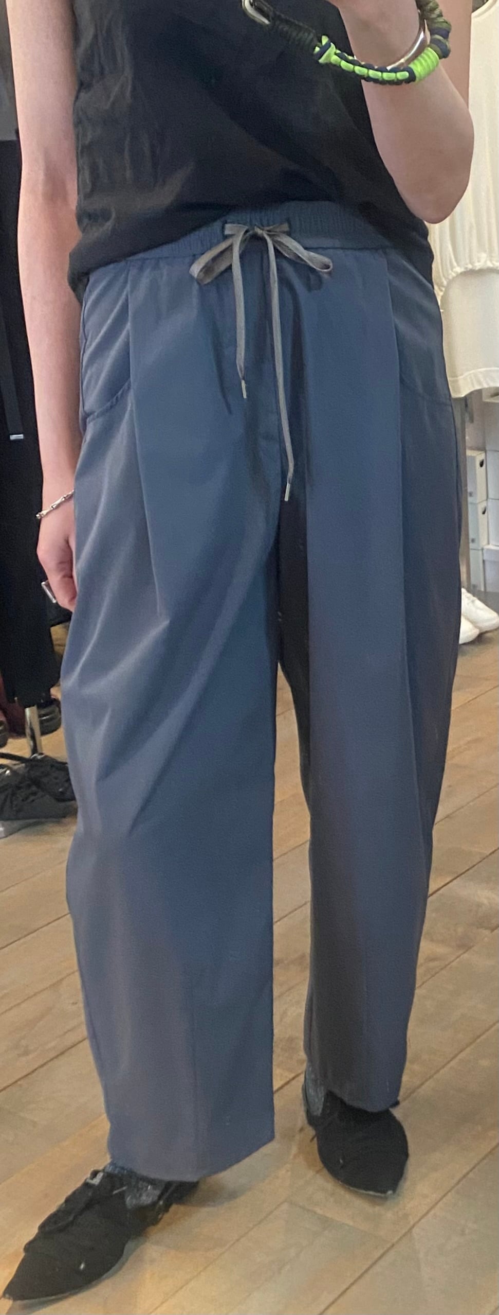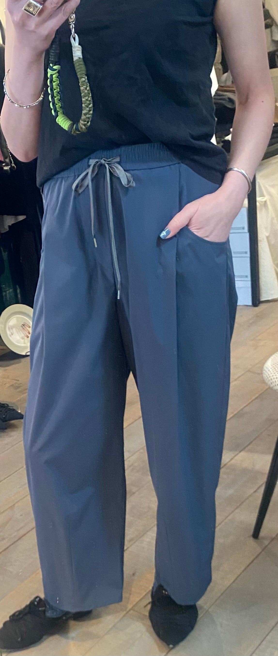 ゆったりとしたパターンですが、ウエストラインはスッキリさせて女性らしく着こなせるイージーパンツ。ポケットのバランスがポイントです。