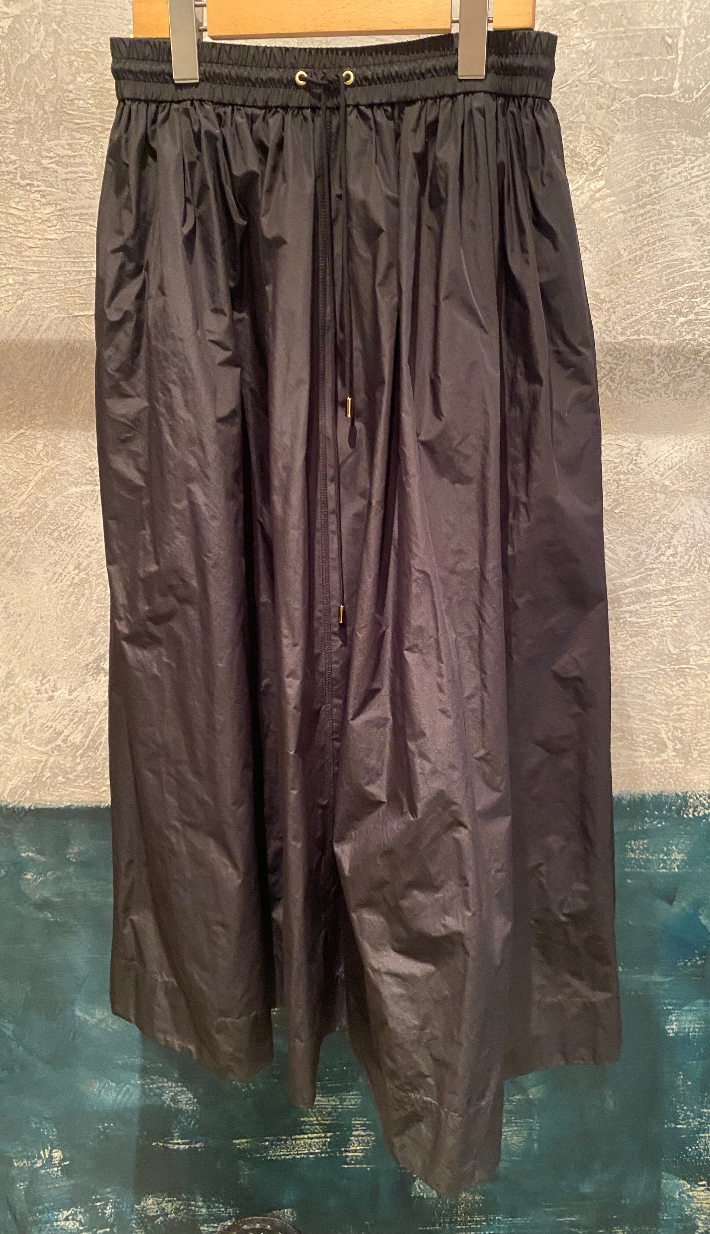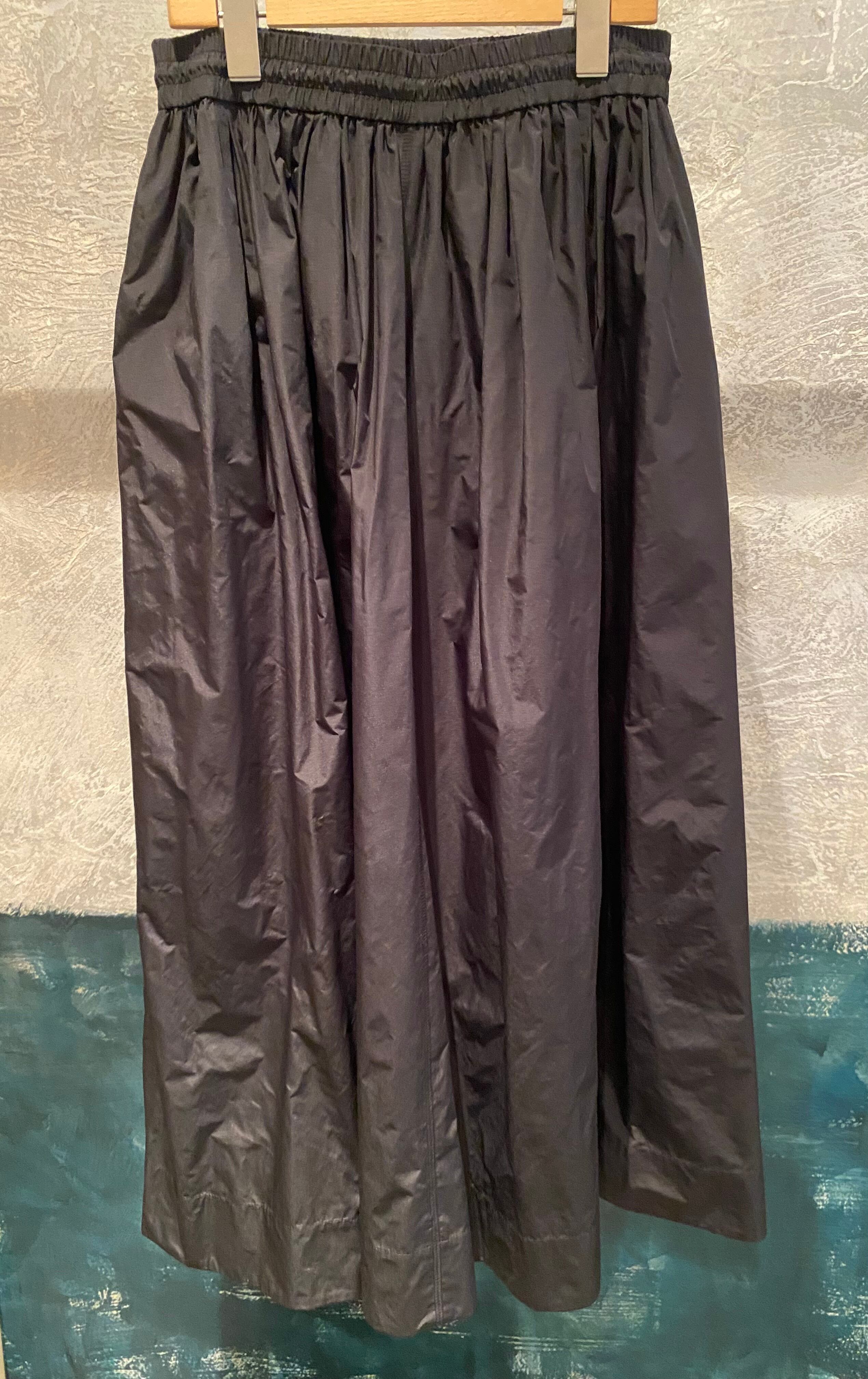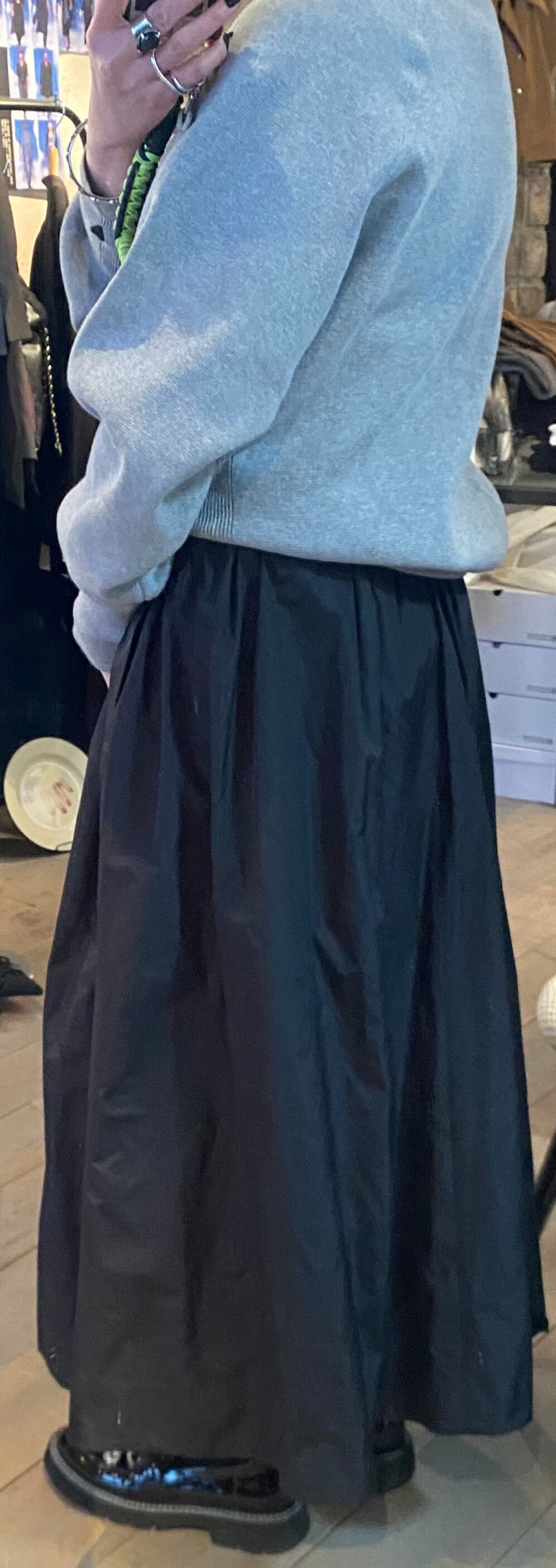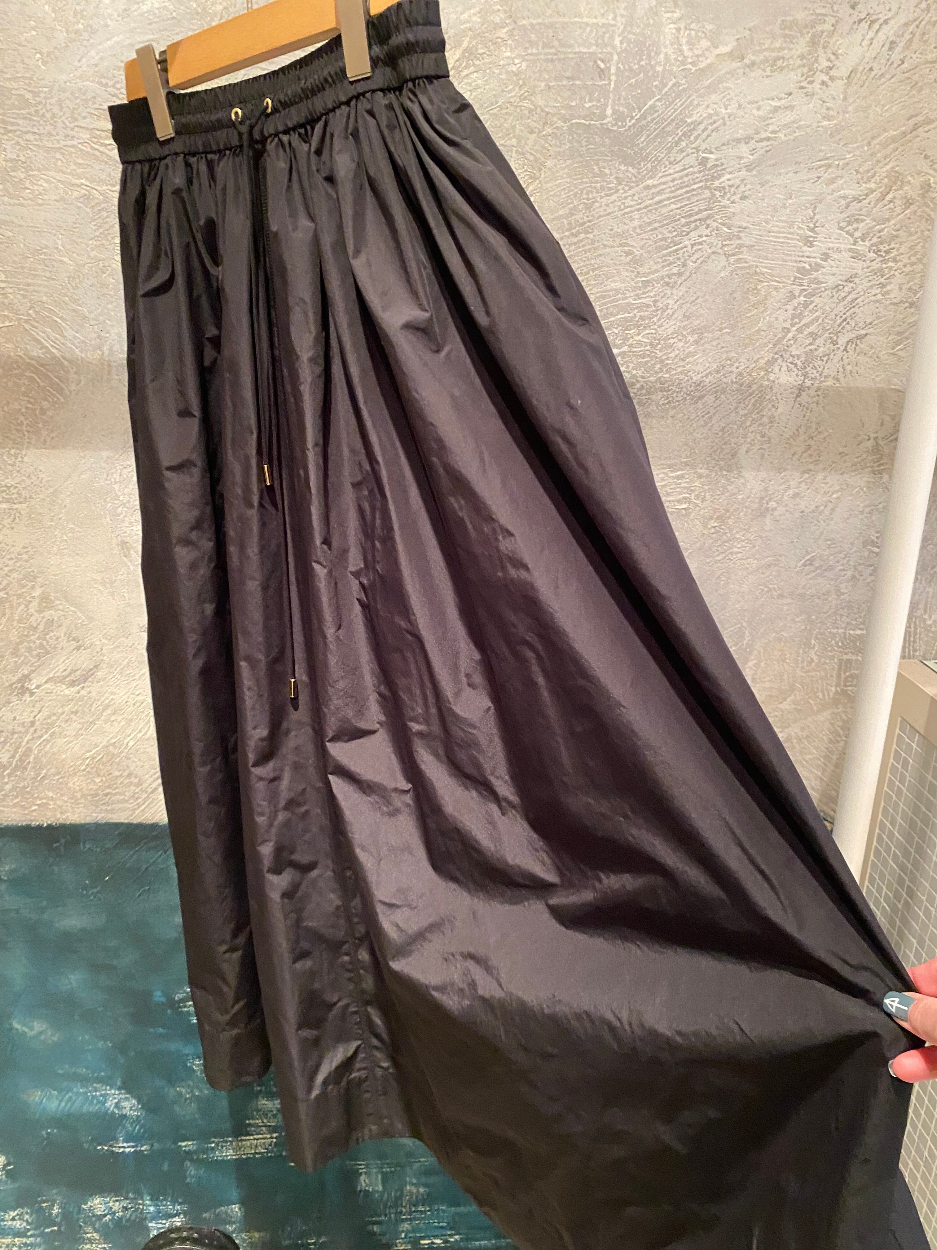 ロングスカート。タフタ素材で程よい光沢感と滑らかなハリ感が特徴的。両サイドポケット有り、ウエストは総ゴムでストレスフリー、あらゆるサイズ感の方に対応します。レイヤードするトップスも選ばす、オールシーズン着回せます。こちらもご旅行や長時間座る際にもシワが気にならず万能です!