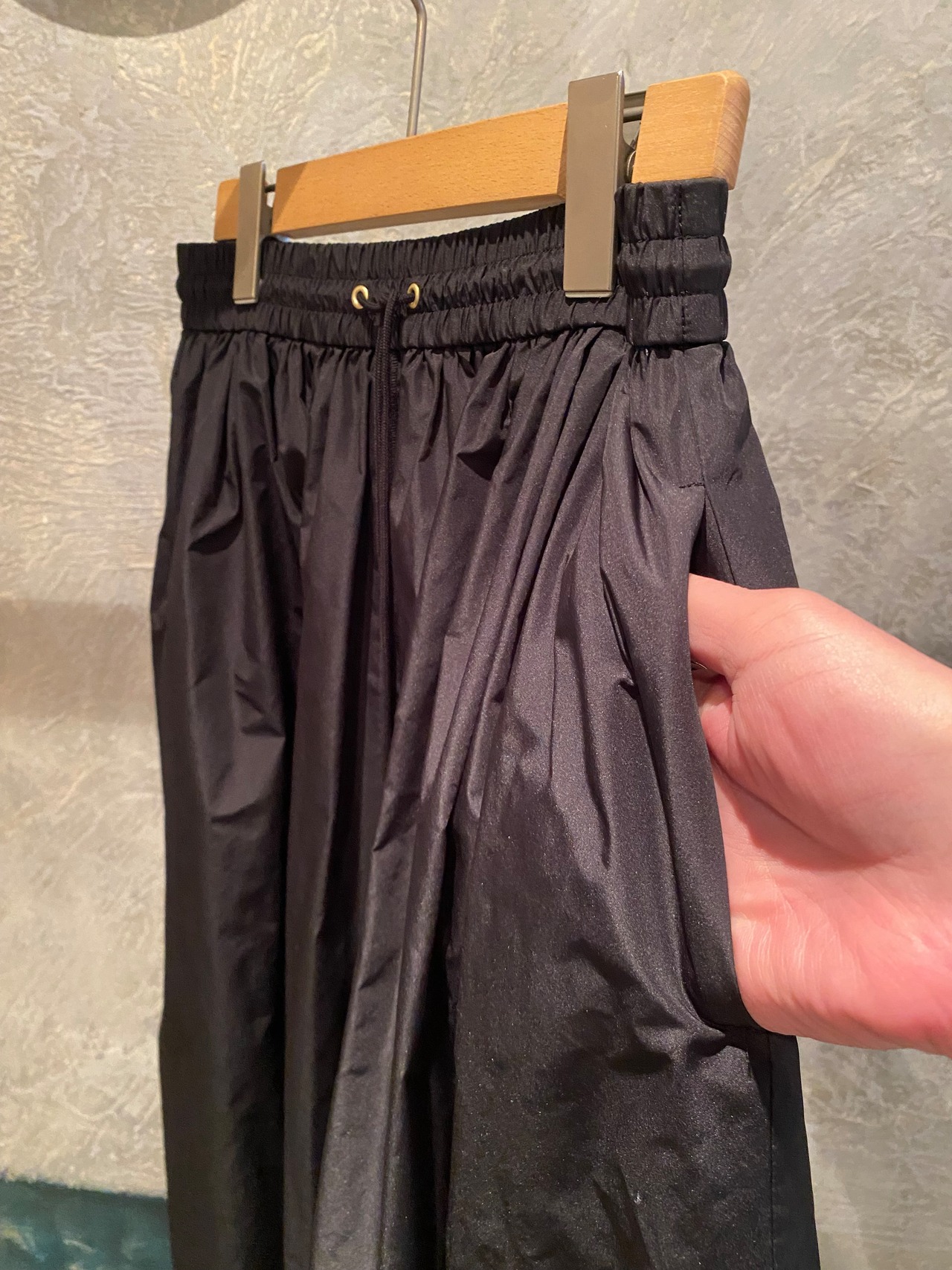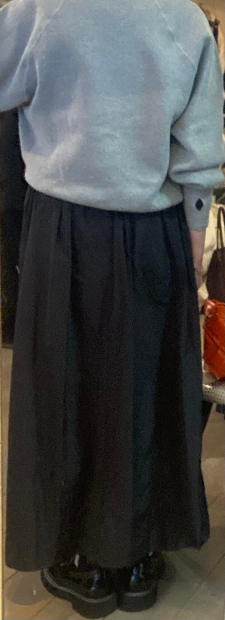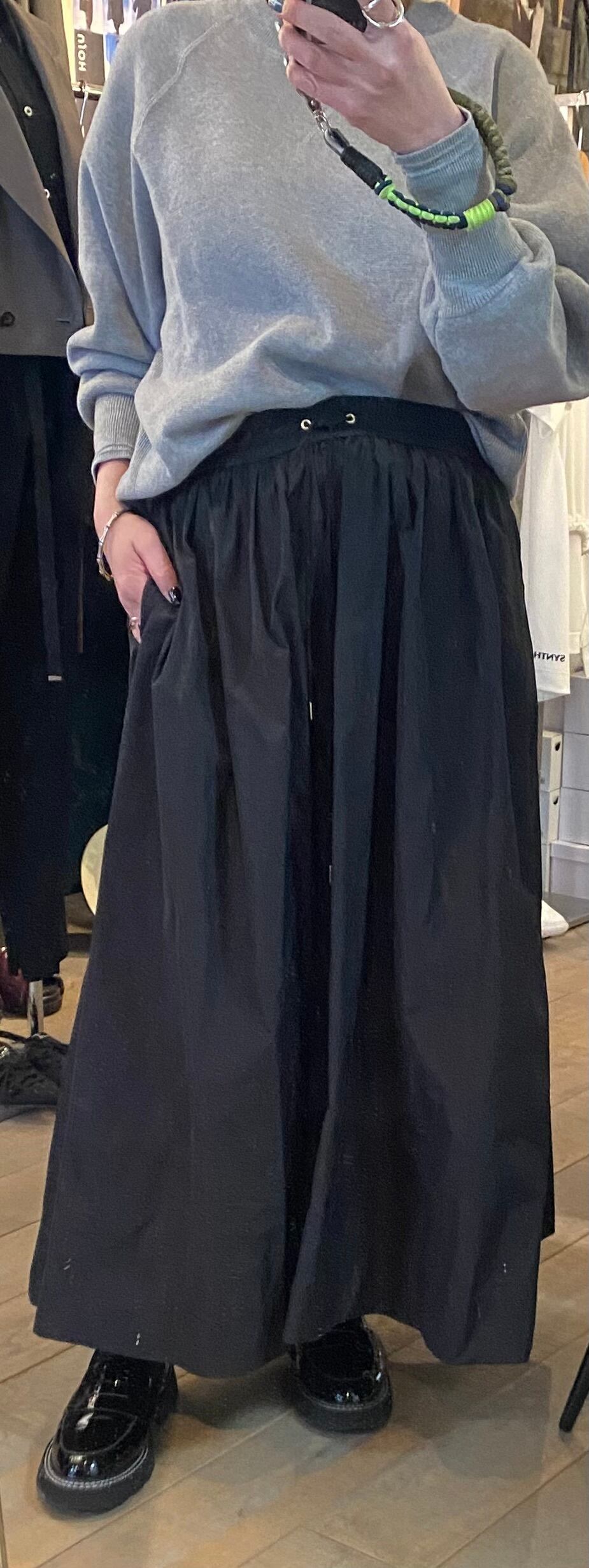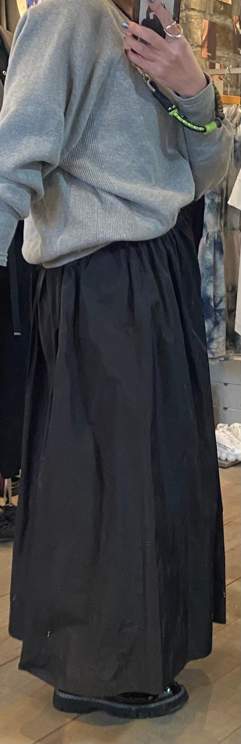 ロングスカート。タフタ素材で程よい光沢感と滑らかなハリ感が特徴的。両サイドポケット有り、ウエストは総ゴムでストレスフリー、あらゆるサイズ感の方に対応します。レイヤードするトップスも選ばす、オールシーズン着回せます。こちらもご旅行や長時間座る際にもシワが気にならず万能です!