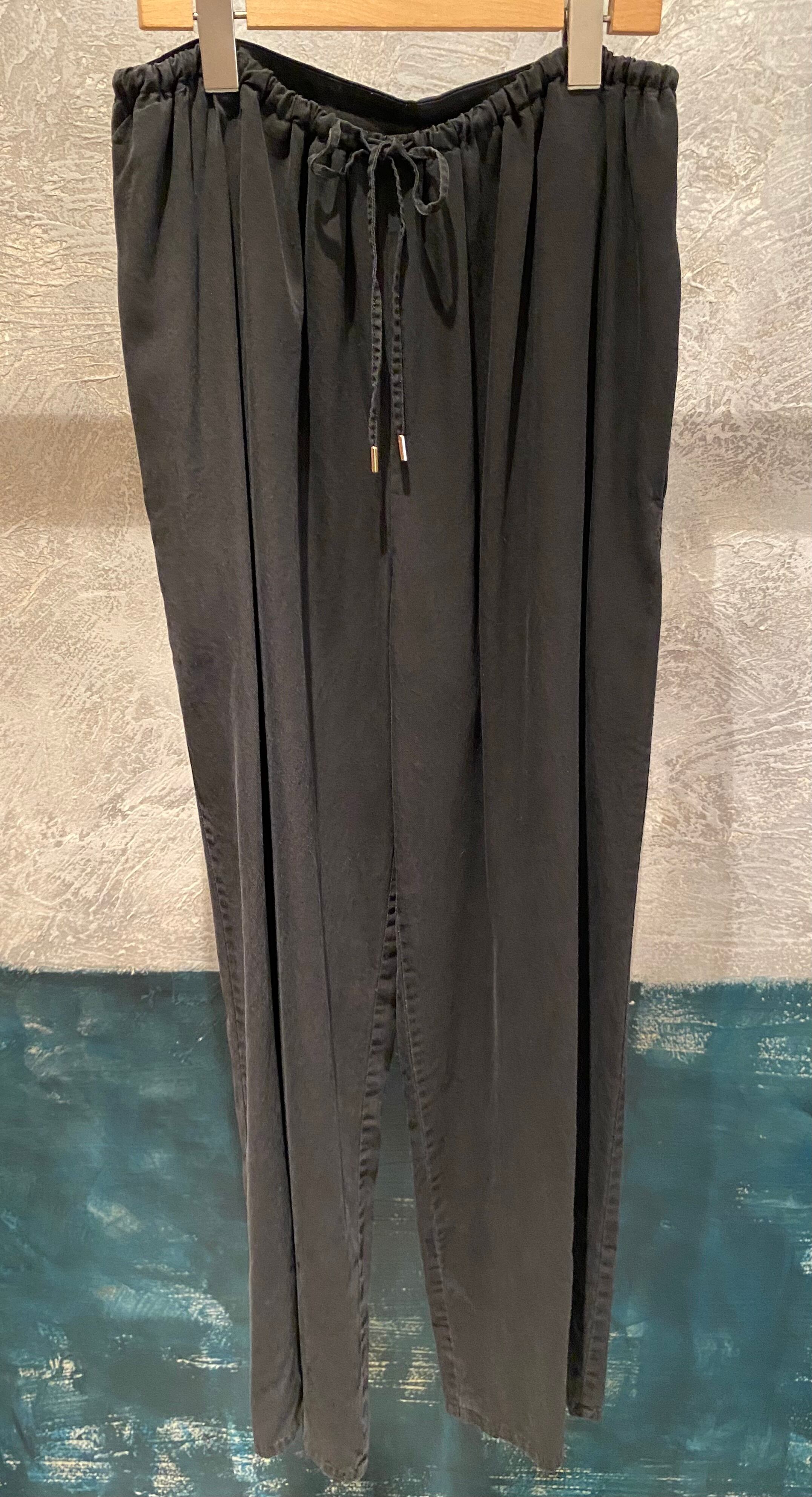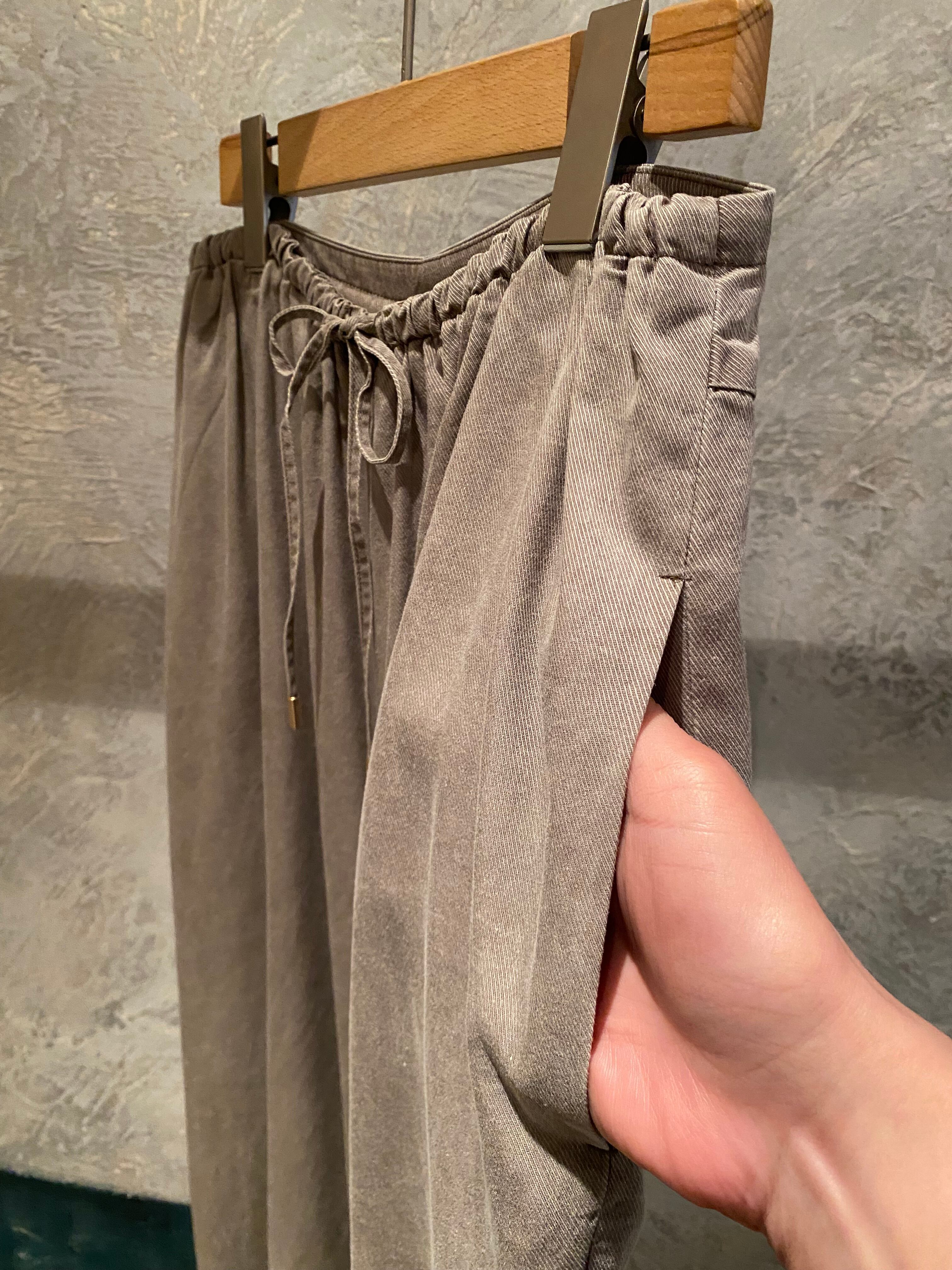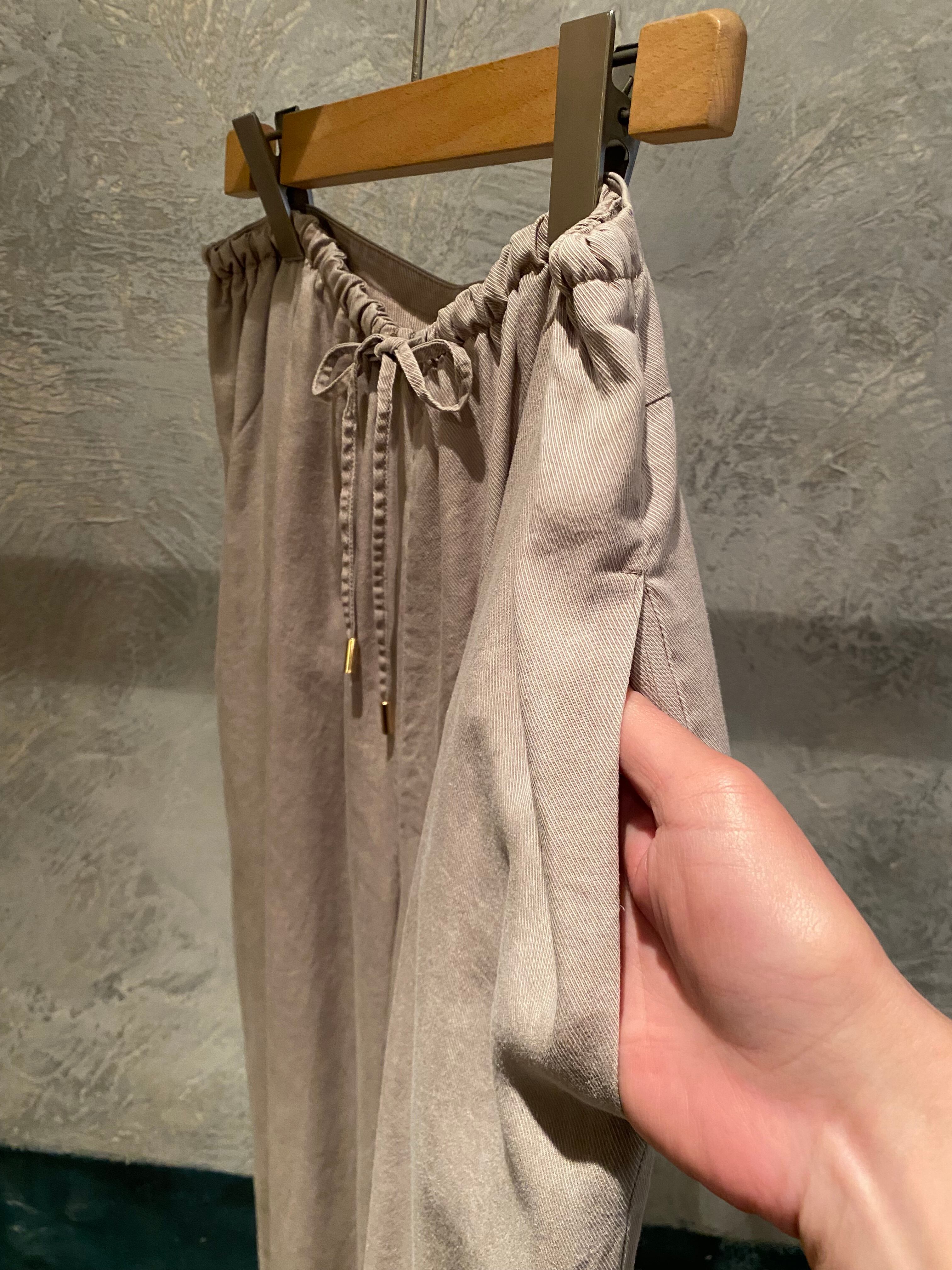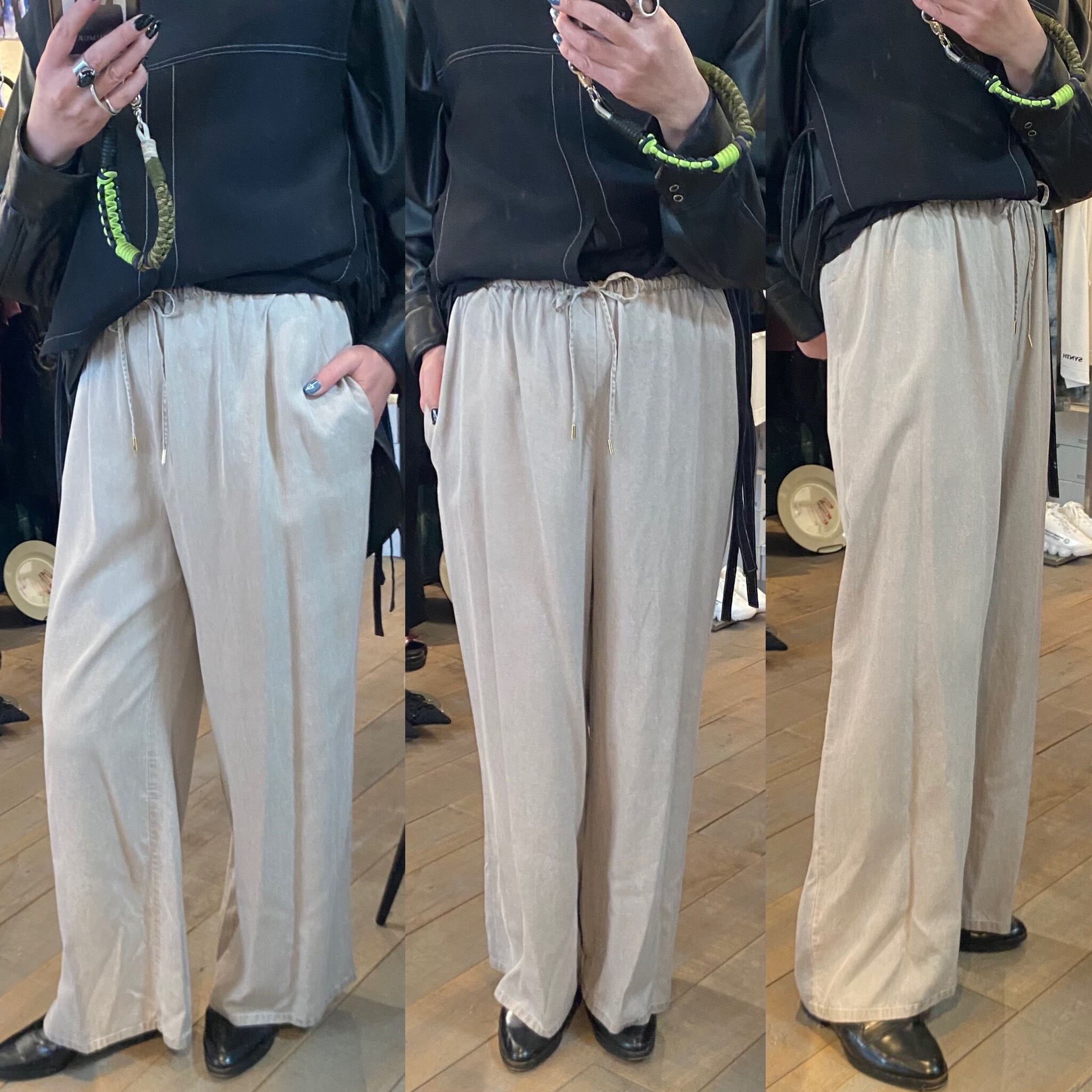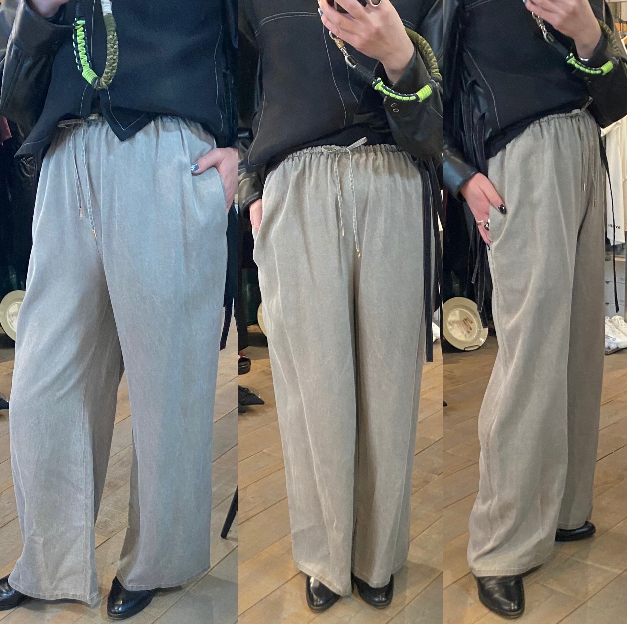 トロッとしたオチ感のあるストレートイージーパンツ。ウエストはゴム仕様でストレスフリーな履き心地。紐でサイズ調節ができるフリーサイズ。両サイドポケット有り。独特な色目、表情を出すため特殊な染料や縫製後の洗い加工をしています。他の製品では味わえない自然な色相をかもし出しているのが特徴的。サンダルやスニーカーとカジュアルなスタイルにも、ローファーやパンプスとキレイめなスタイルにも◎