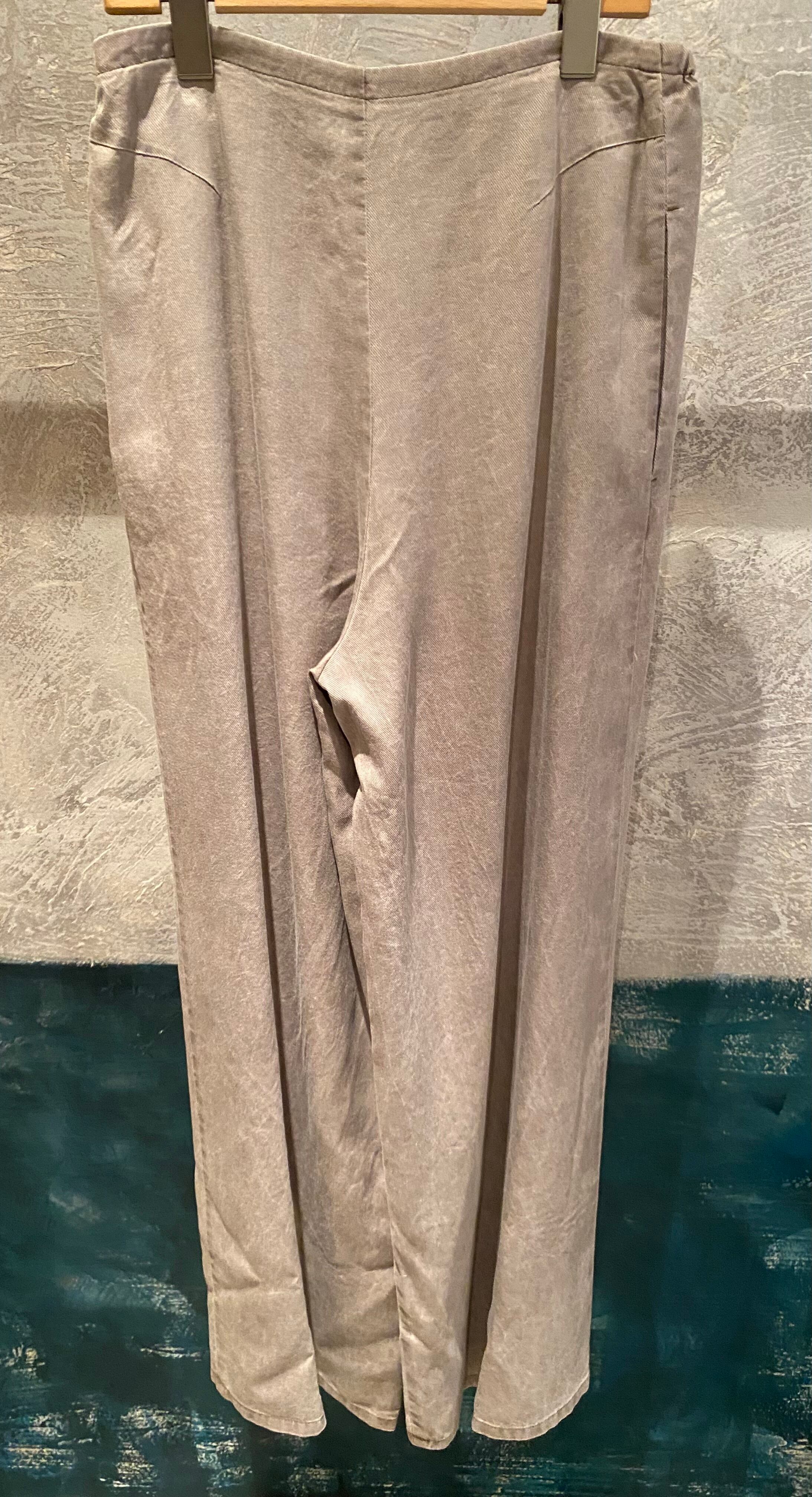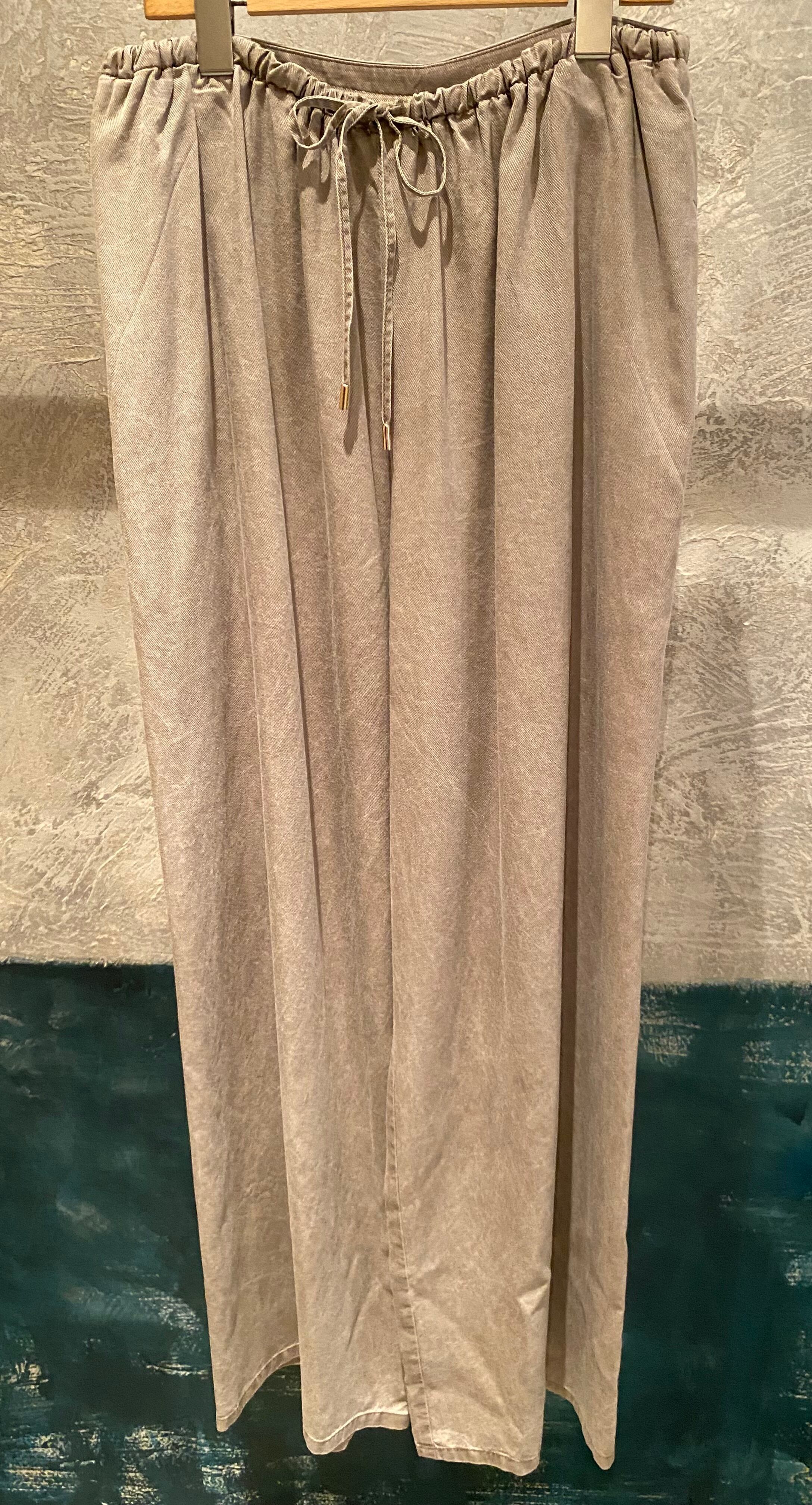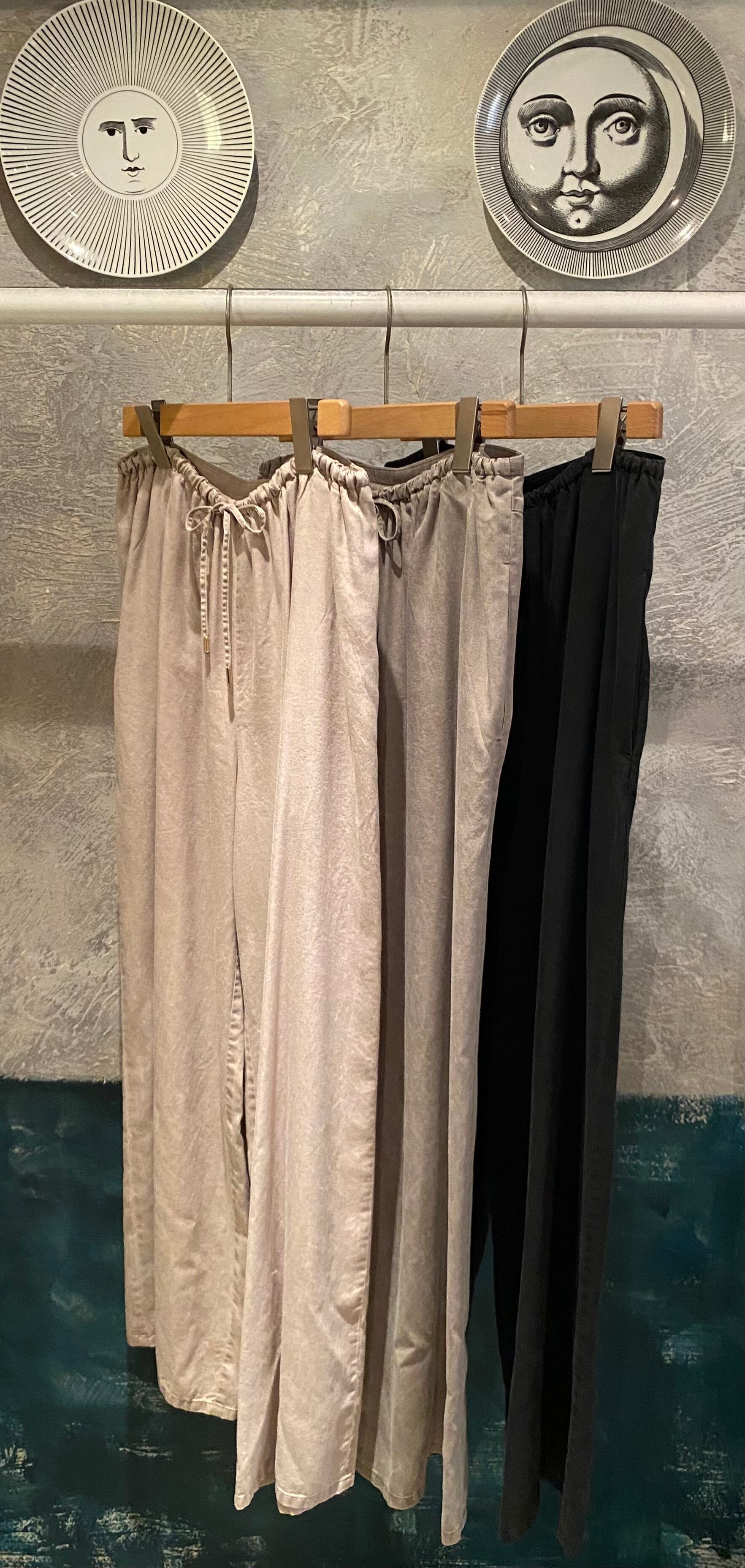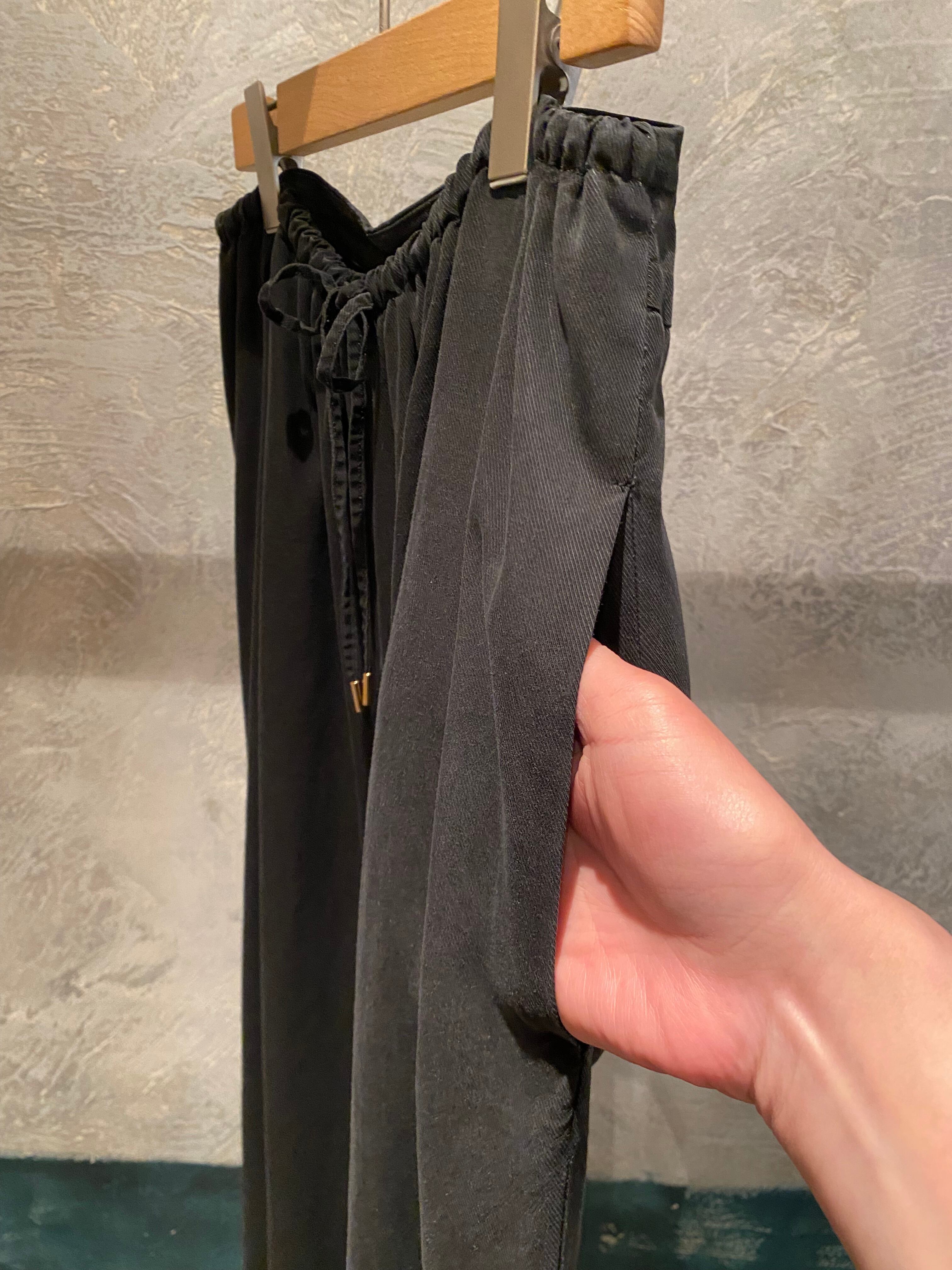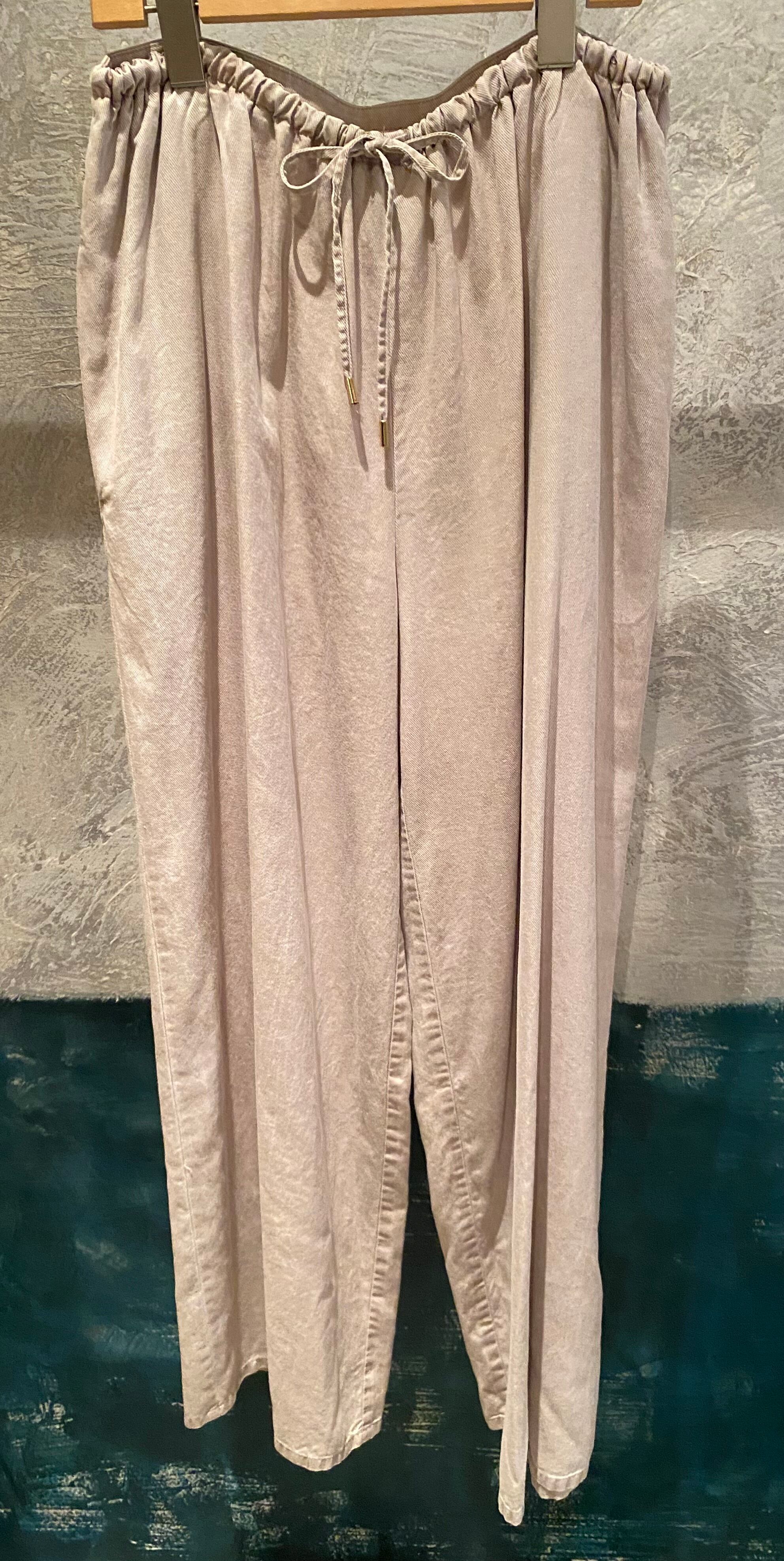トロッとしたオチ感のあるストレートイージーパンツ。ウエストはゴム仕様でストレスフリーな履き心地。紐でサイズ調節ができるフリーサイズ。両サイドポケット有り。独特な色目、表情を出すため特殊な染料や縫製後の洗い加工をしています。他の製品では味わえない自然な色相をかもし出しているのが特徴的。サンダルやスニーカーとカジュアルなスタイルにも、ローファーやパンプスとキレイめなスタイルにも◎