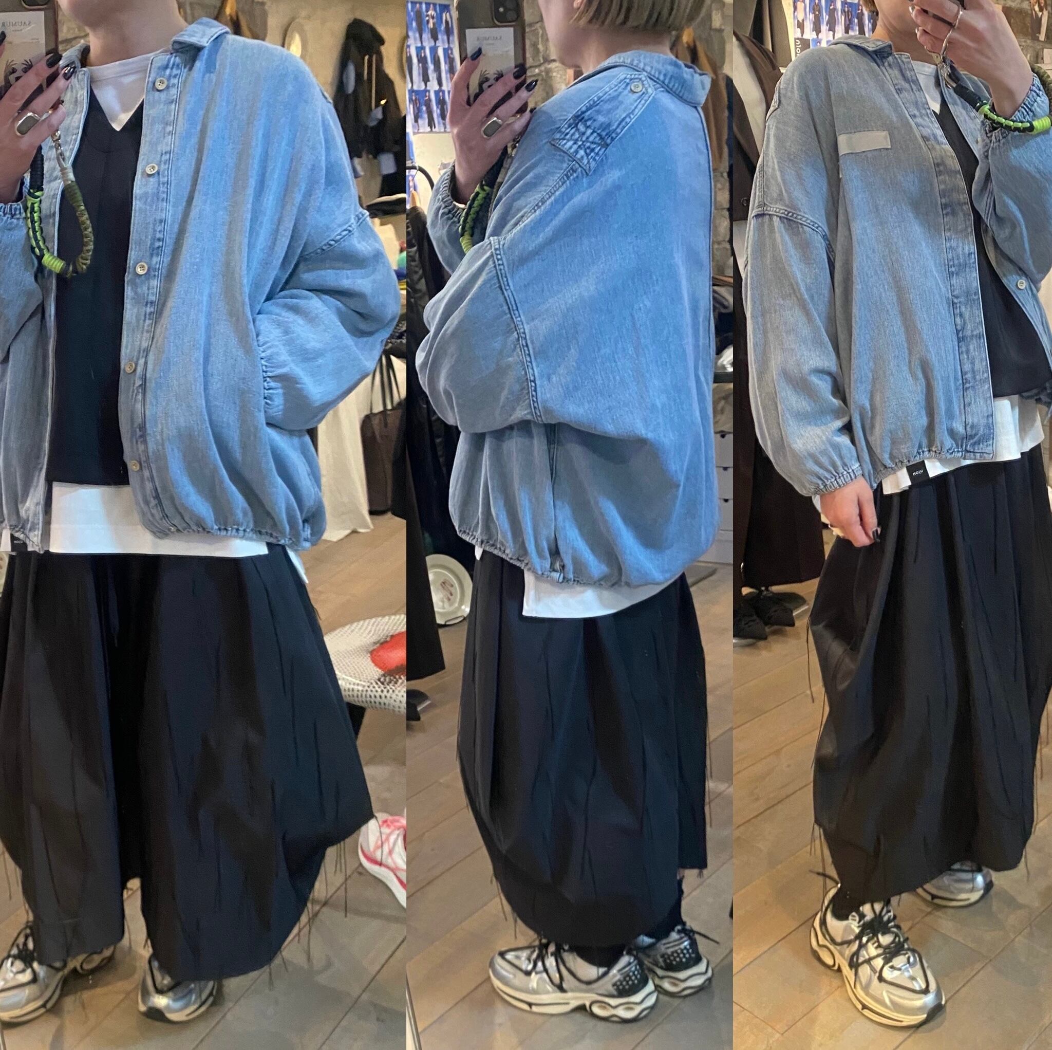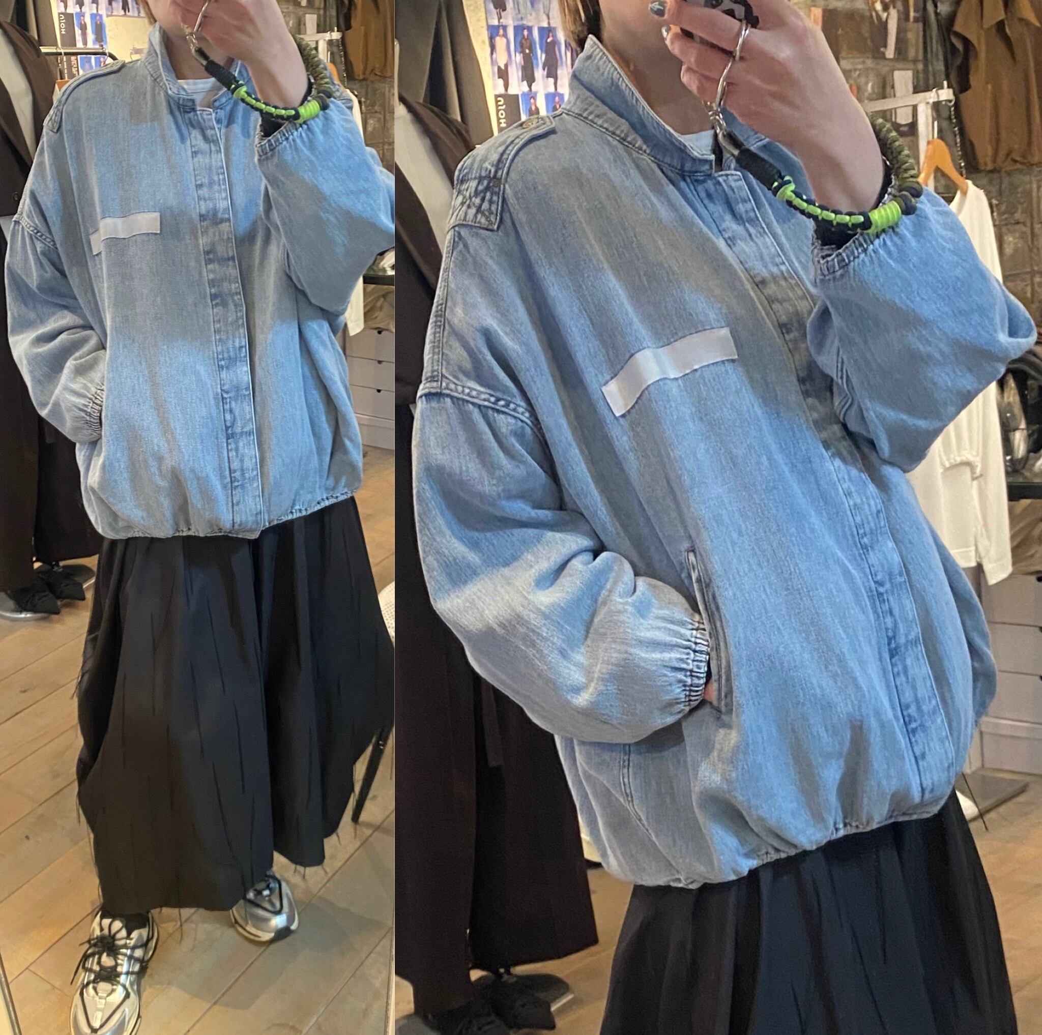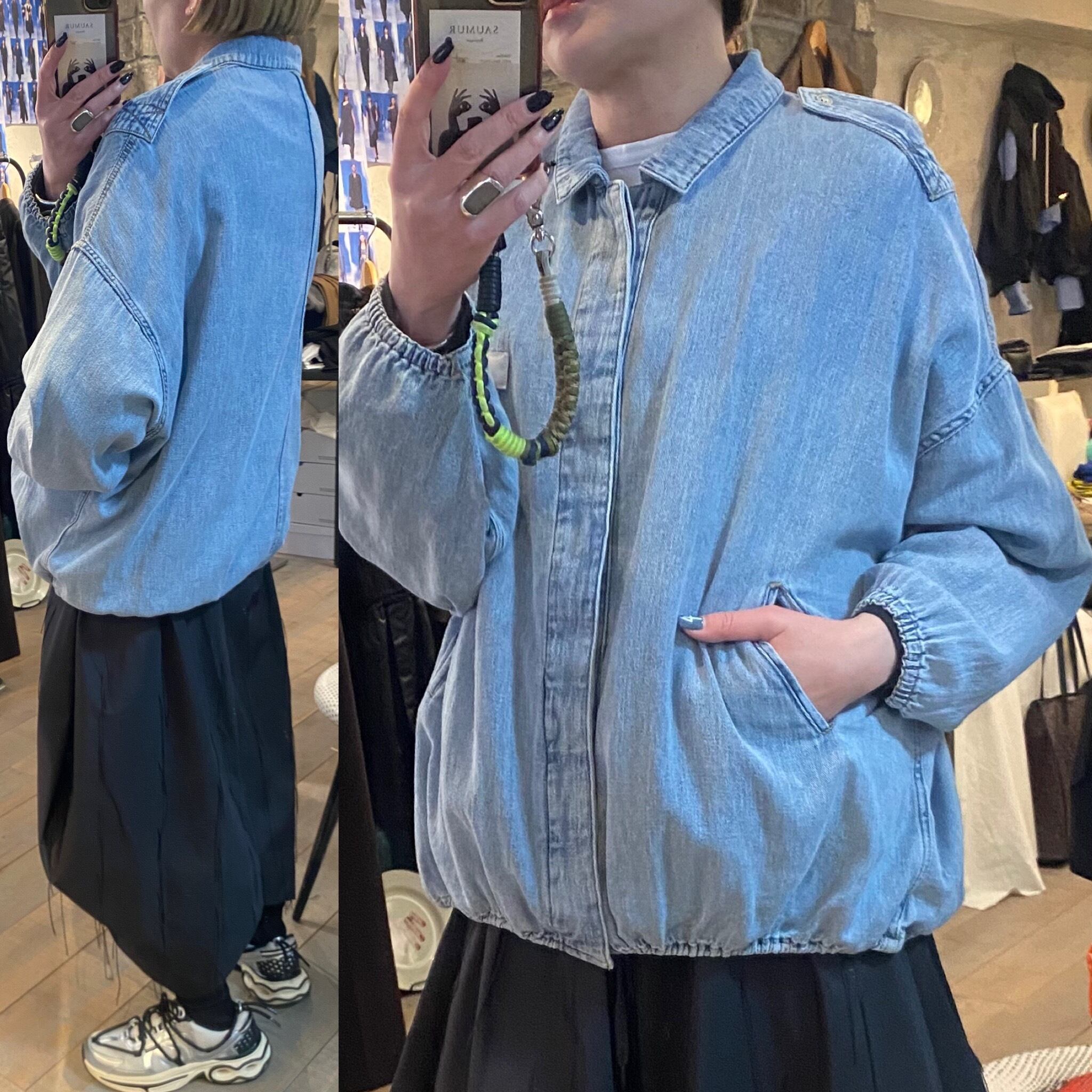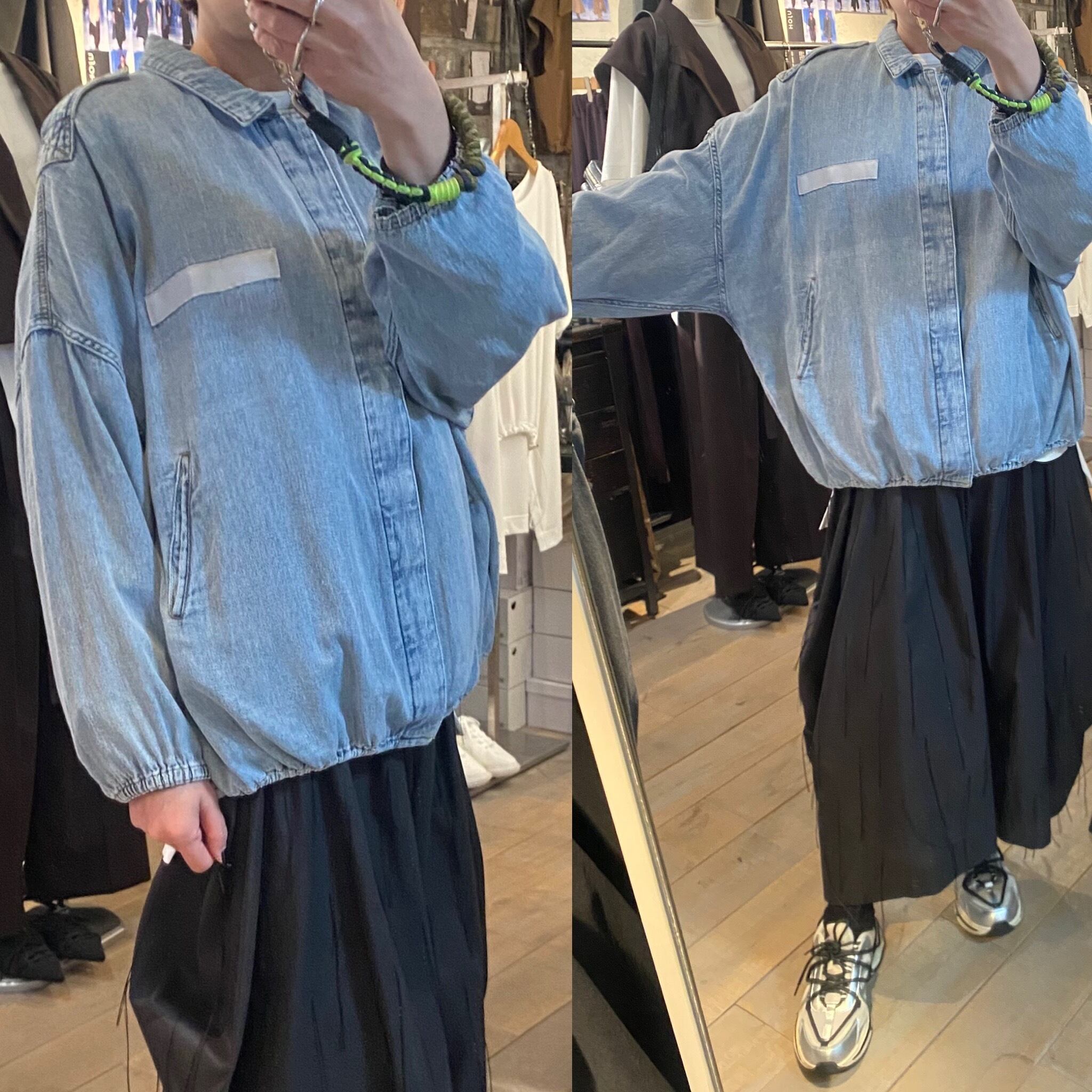 ライトブルーの硬さのない柔らかい着心地のデニムジャケット。デニム特有の硬い分厚さもなく軽く羽織って頂けます♪裾のドローコードでシルエットの変化を楽しめます。フロントジップボタンデザイン。キチッと着たり着崩す着方もオススメ。真夏以外のロングシーズン着回せるアイテム。